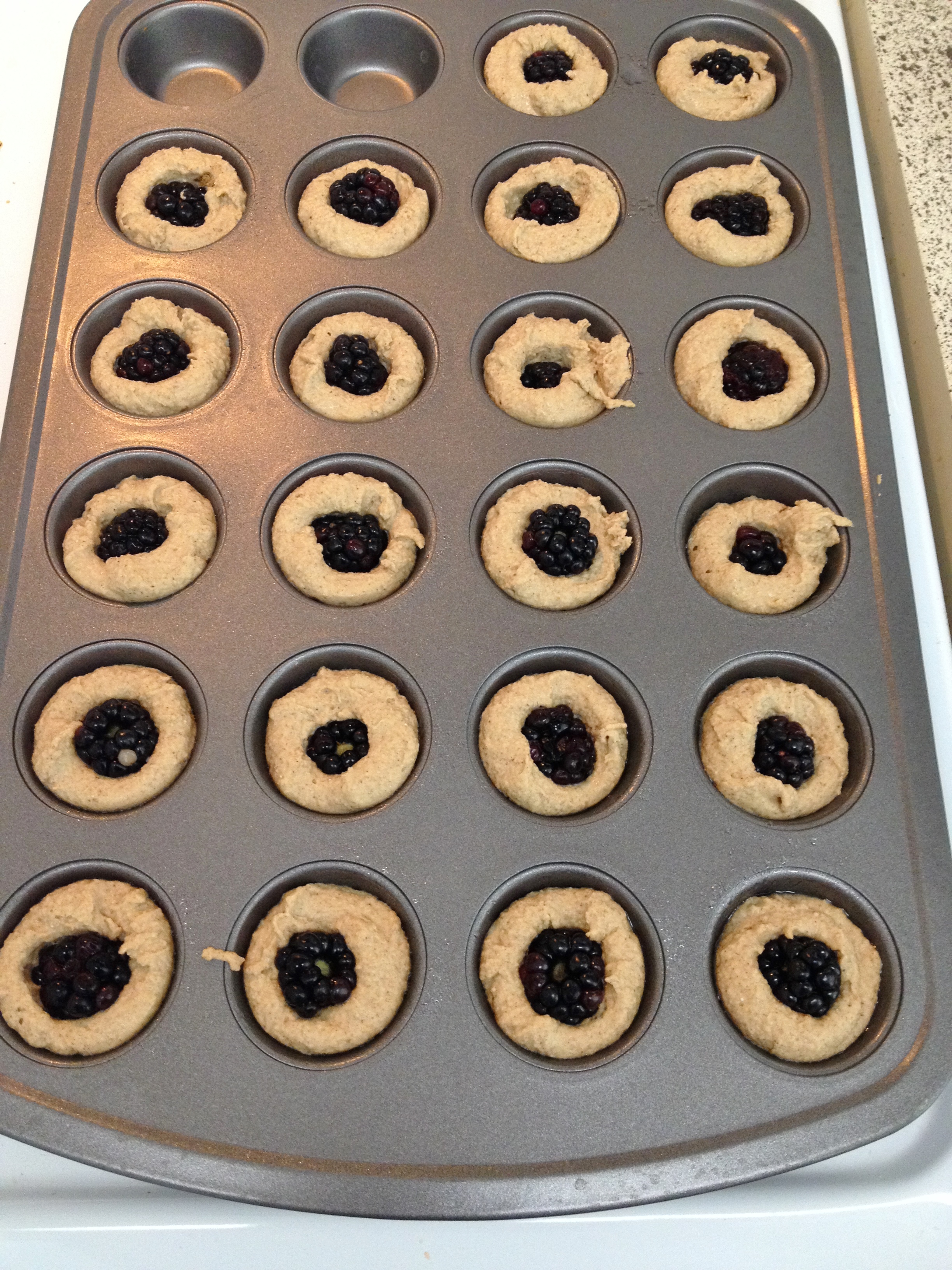 So for these mini’s I made a half batch of a normal muffin recipe, then in the muffins tins I made sure to spray the tins really well with non-stick spray. I used a small spoon and filled each tin 3/4 full with batter. When the batter was gone I pushed one blackberry into the middle of each. It looked so pretty and reminded me of little tarts. I baked the pan for 12 minutes then let cool a few minutes in the pan before taking out using a fork. Yum. These were light calorie wise and tasting and I could eat these without a lot of guilt.