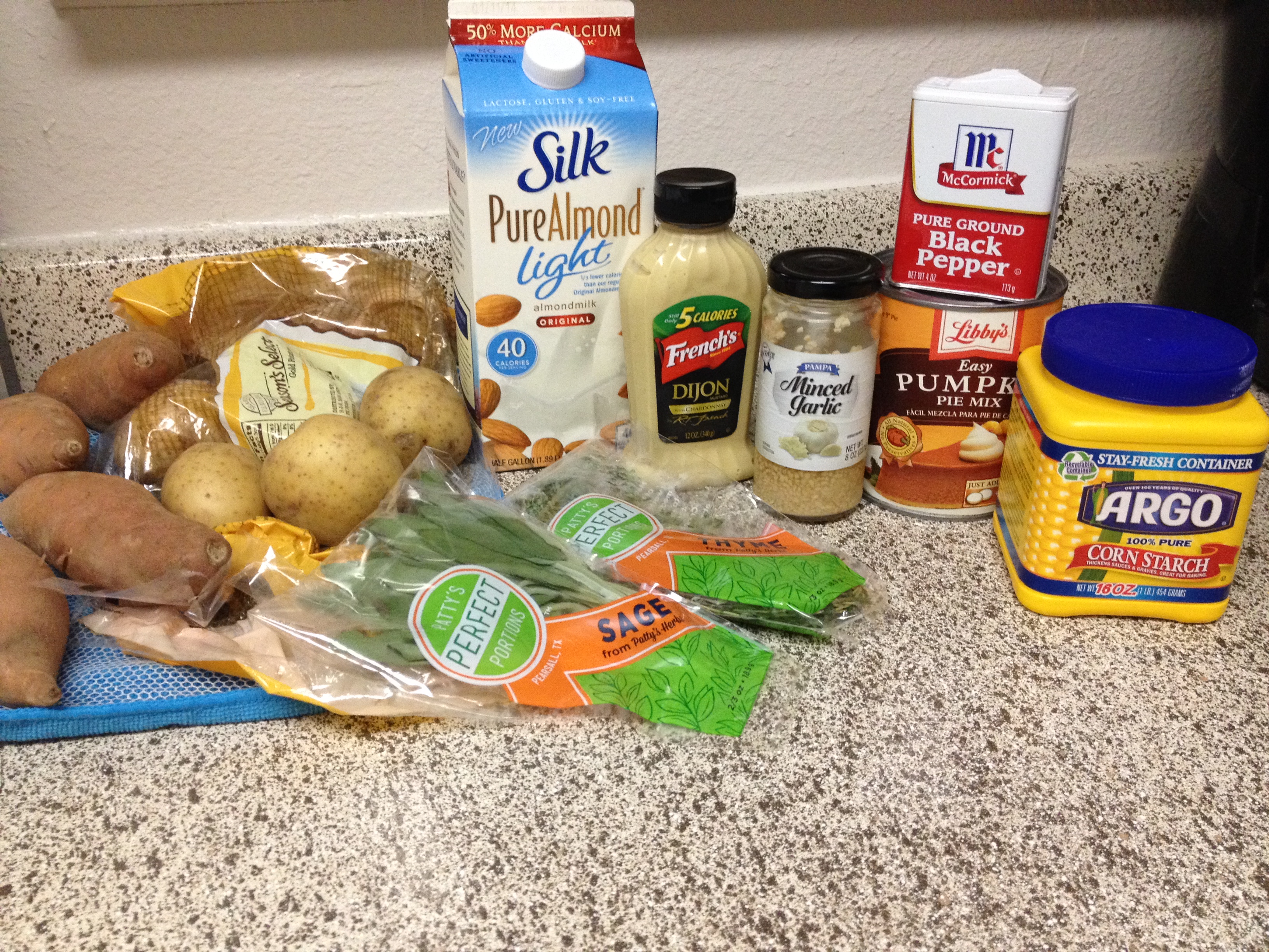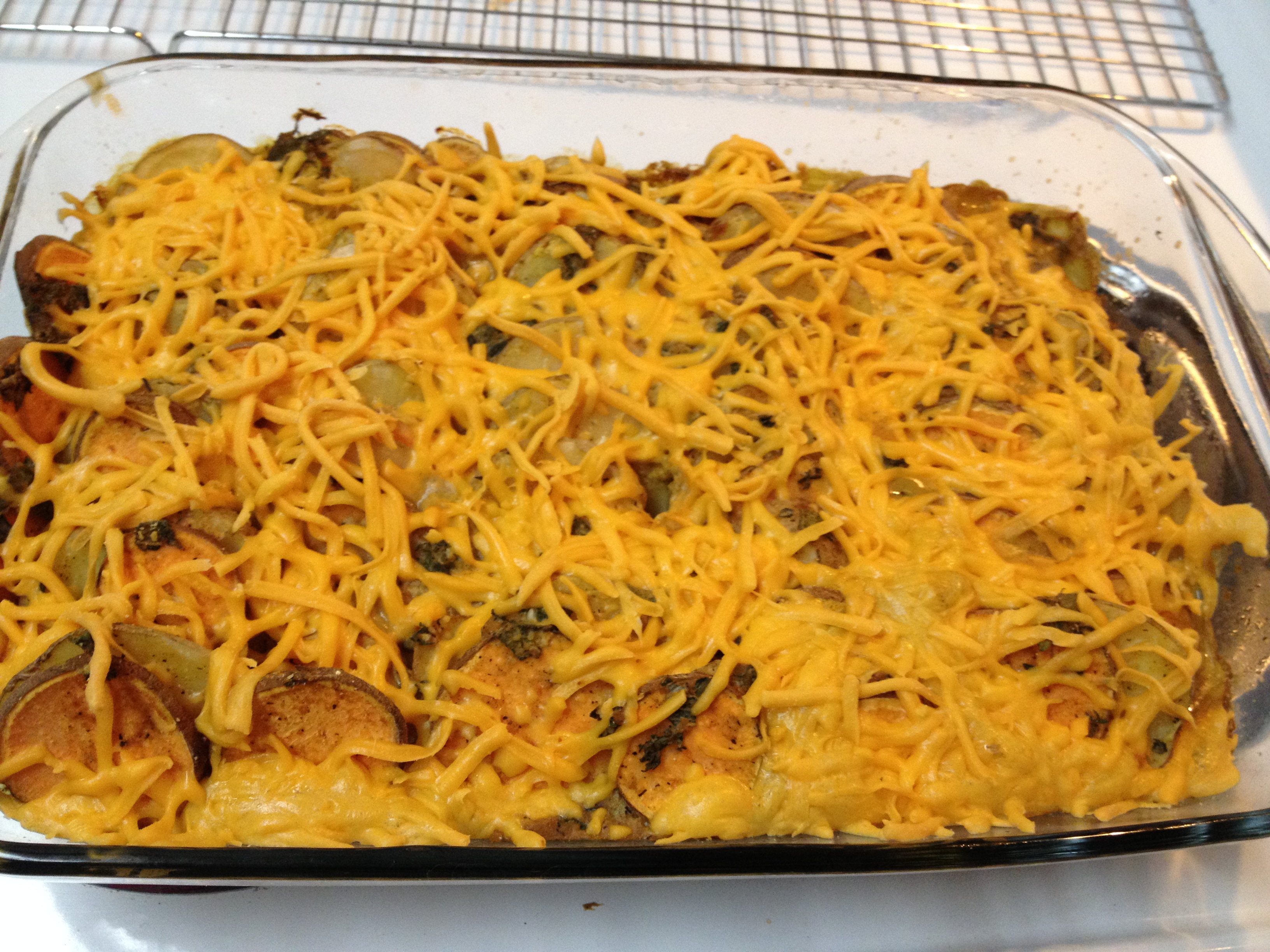 For the liquid, mix the milk and cornstarch together first then add everything else. Two surprising ingredients? Pumpkin and Dijon mustard! Oh man, what a great combo. Also, I used fresh herbs, which I have never, ever done before. Terrible for a food writer, but no fresh herbs like sage and thyme have ever crossed my chopping knife before. Very proud of myself, and my fingers smelled good for a while afterwards. After all potatoes are lined up pour the mixture over the dish. Wrap foil lightly over top and bake 40 minutes. Take foil off and cover with cheese. Bake 20 more minutes.