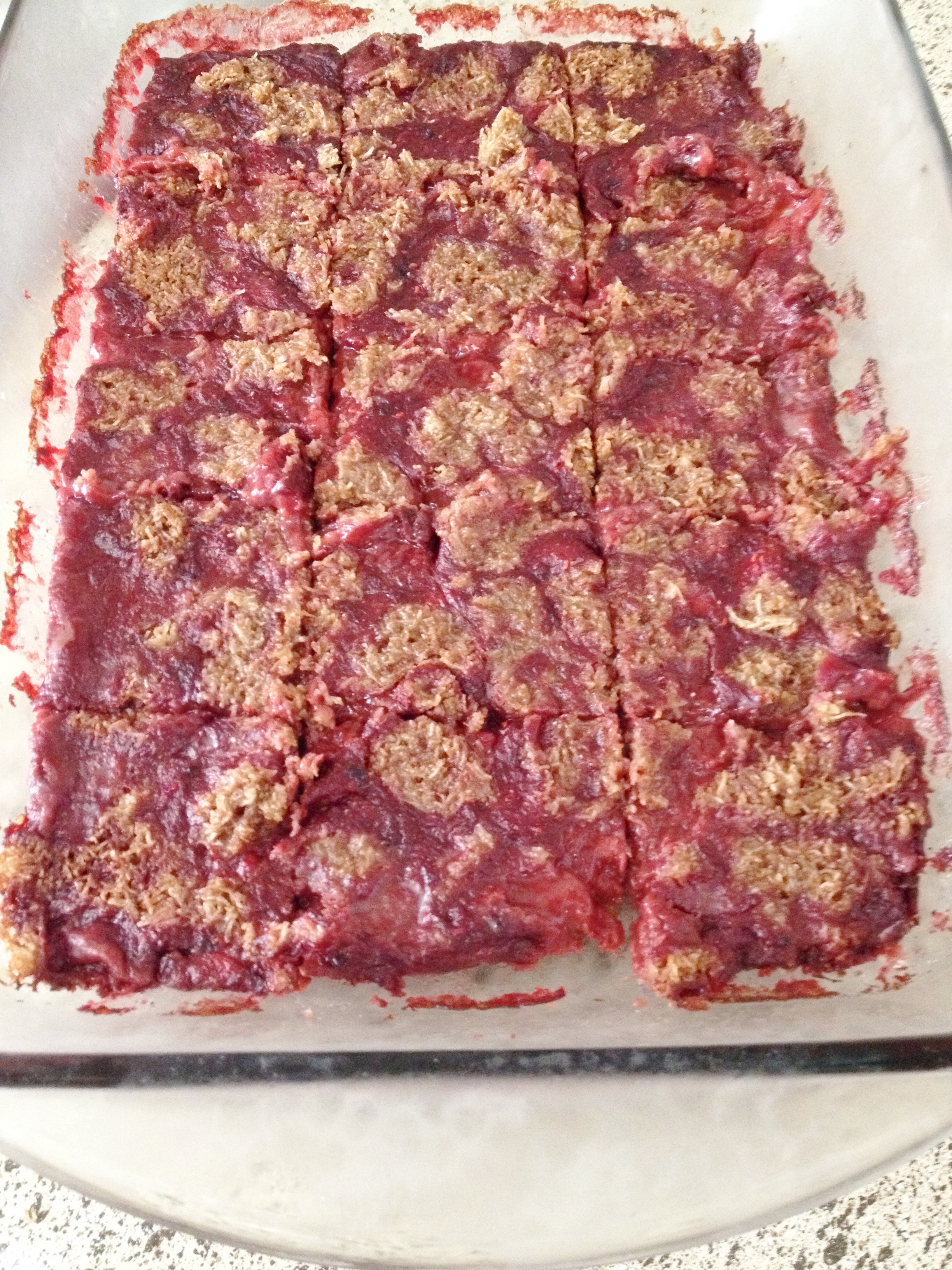 The best part of this whole bar recipe is that there is not a lot of ingredients! Also, with the Kashi cereal being flavored and sweetened already there was not any reason for a lot of sugar in the bar part. I broke out the trusty food processor and poured in the base ingredients and mixed it all then baked it. Then made the berry mixture and while that was cooling I processed the topping. So fast and easy. After I poured it all in the pan I baked it for 10 minutes then took out to finish bars. I made the berry mix while the base cooked and also processed the topping. This is a super quick recipe as in not a lot of kitchen time.