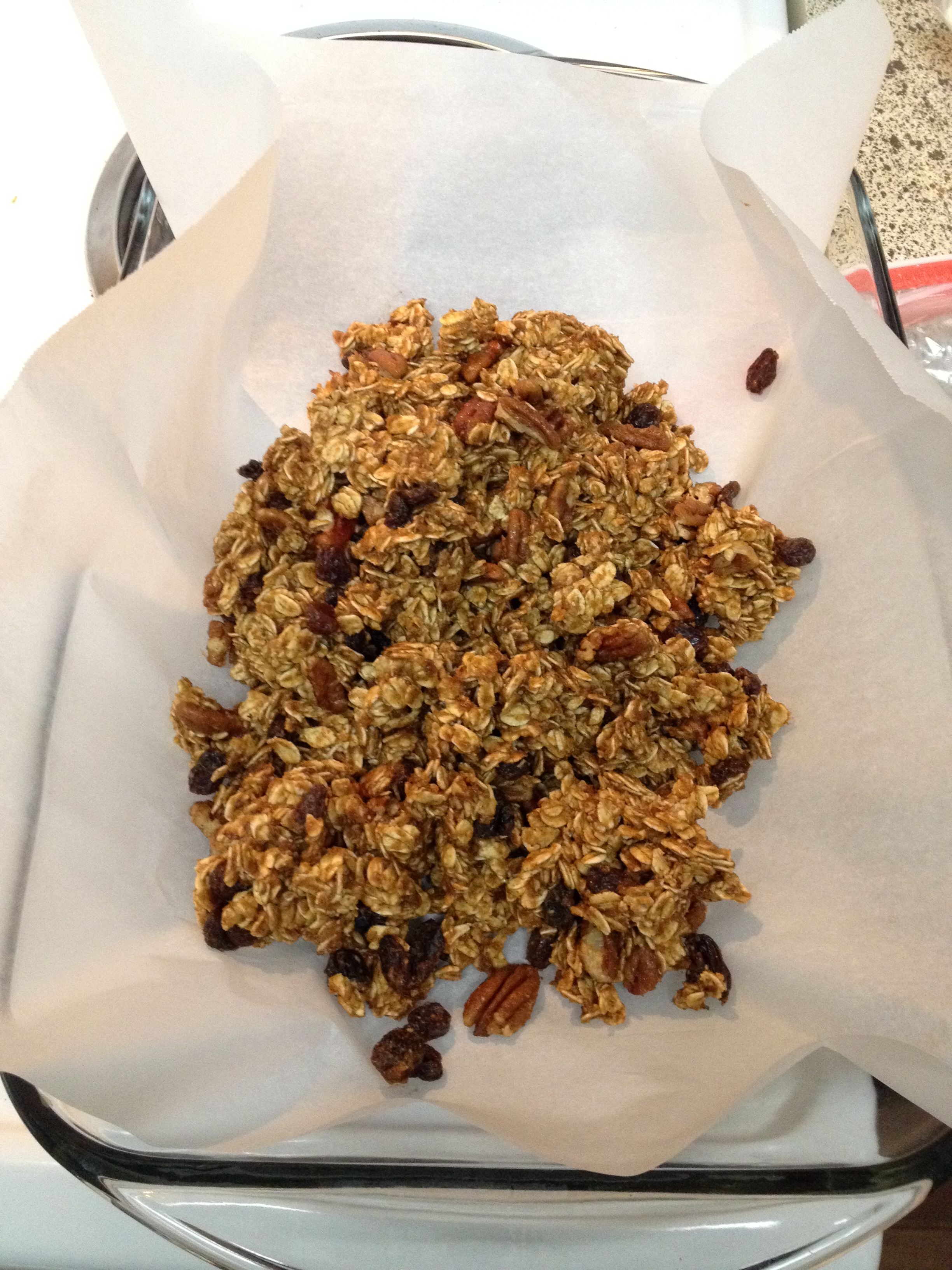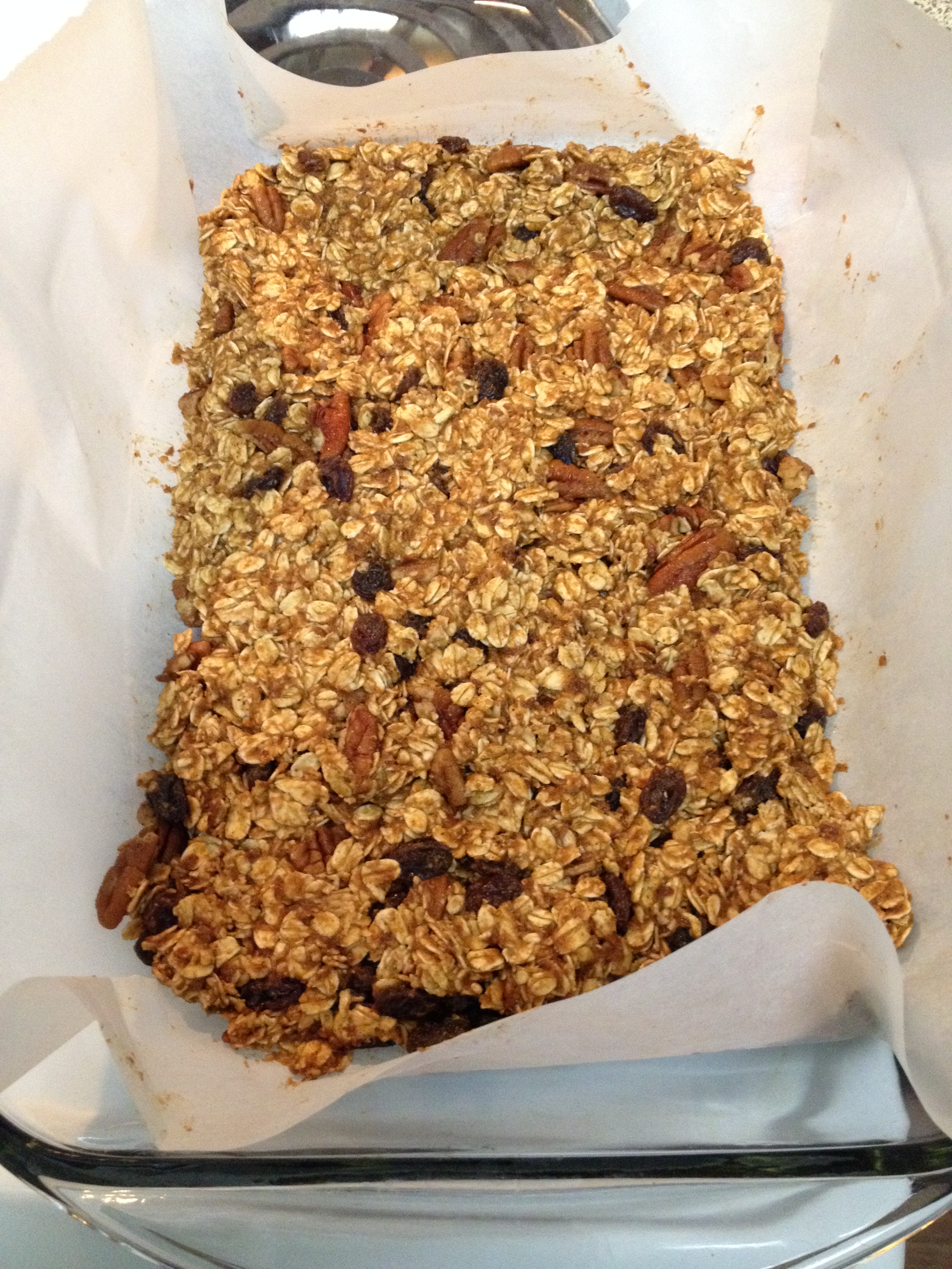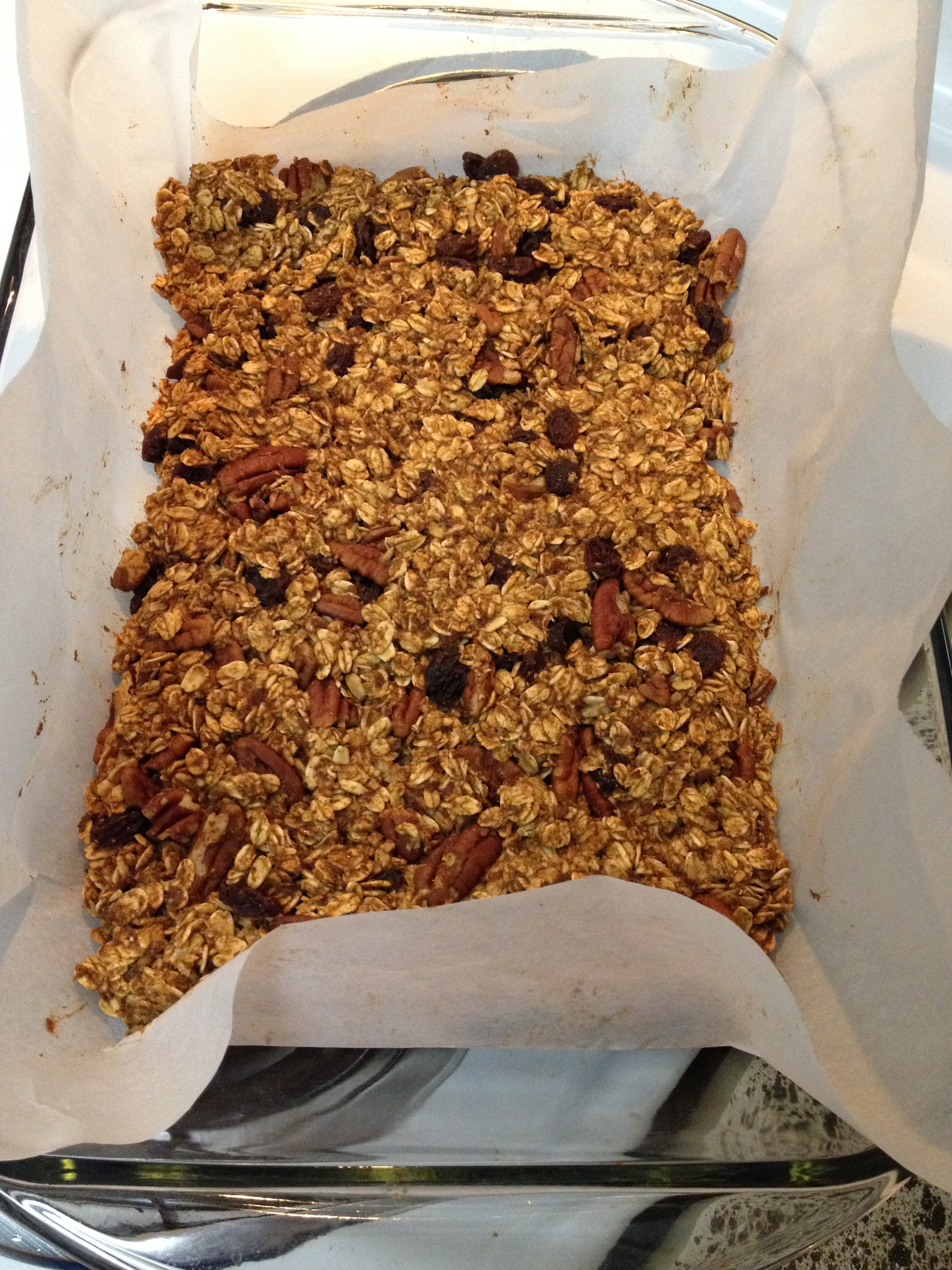 5. In parchment covered baking dish pour oat mixture. Spread evenly and pat down.