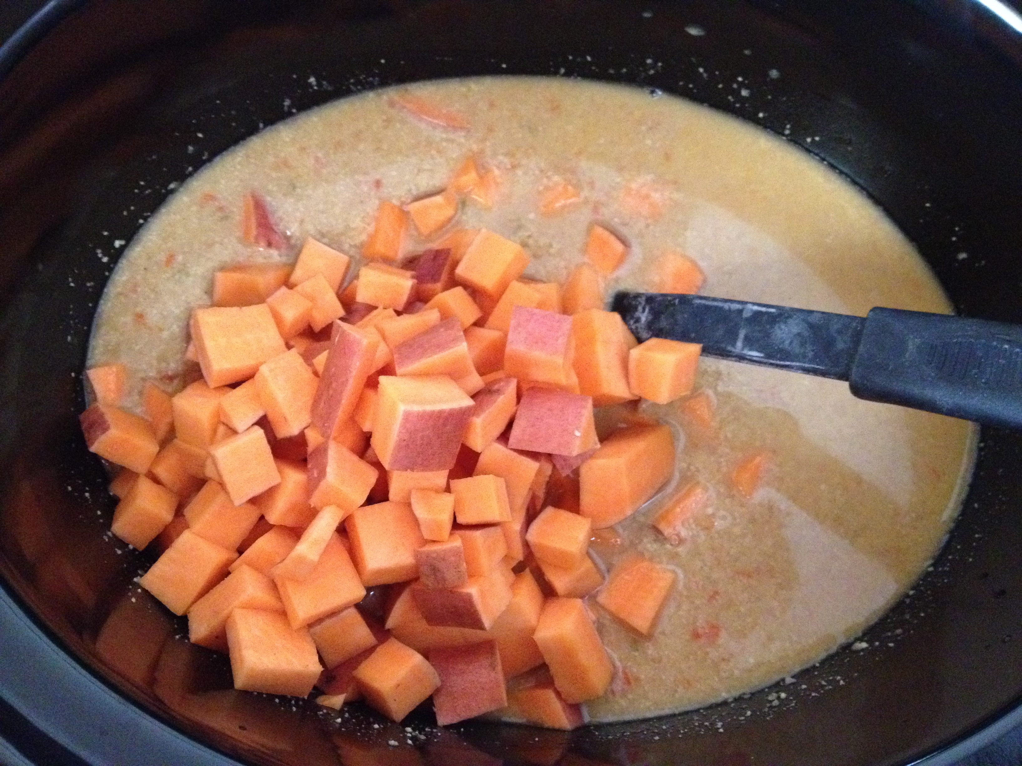 2.  Wash and chop the sweet potato and mushrooms and add to pot.