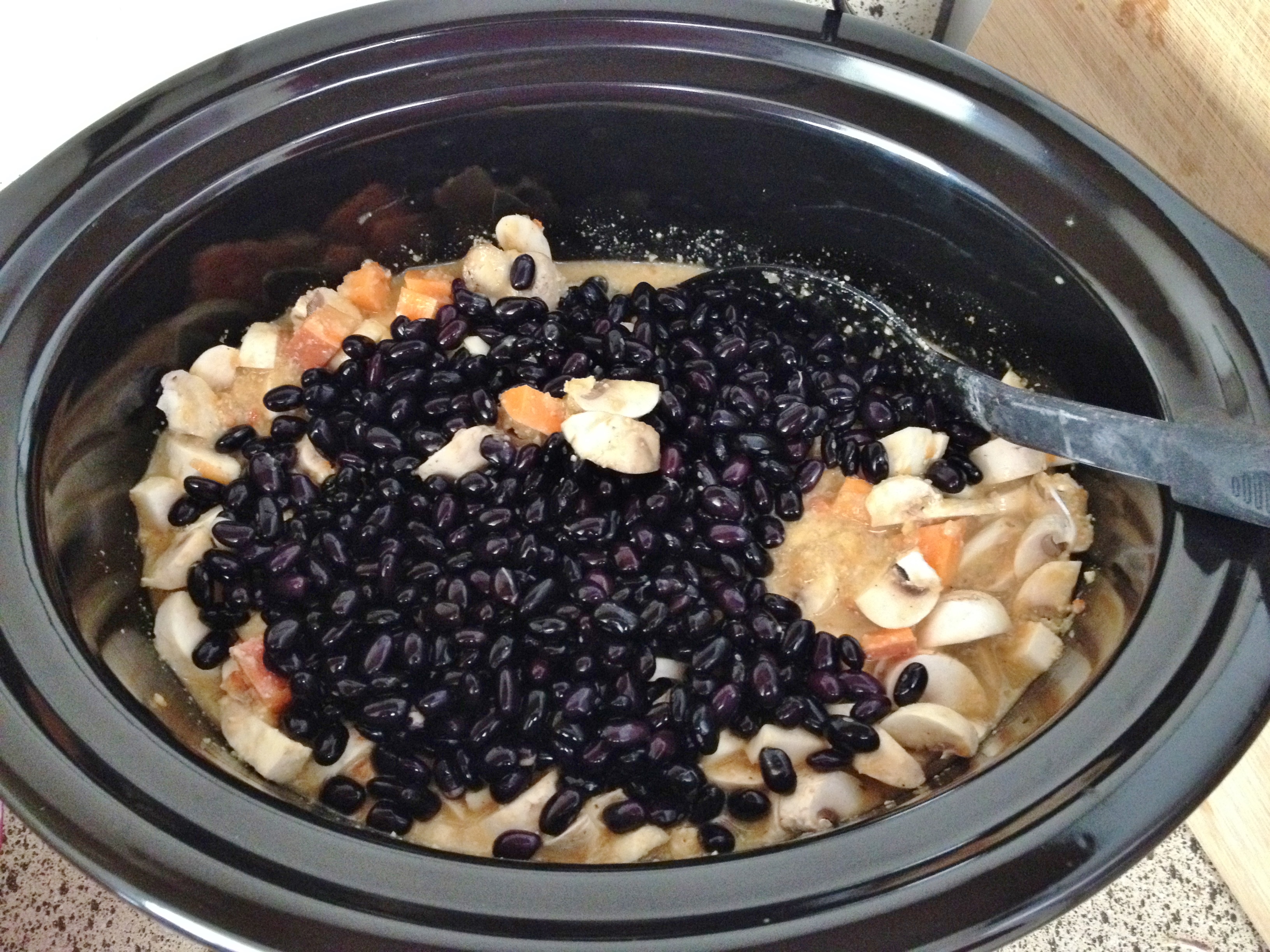 The veggies were simple, just one large sweet potato and one package of whole button mushrooms.  Below is in the ingredients picture two packages are shown, but after chopping the sweet potato, I didn’t think I would have a lot of room left for the second package.  I added the four cups of beans and that was it.