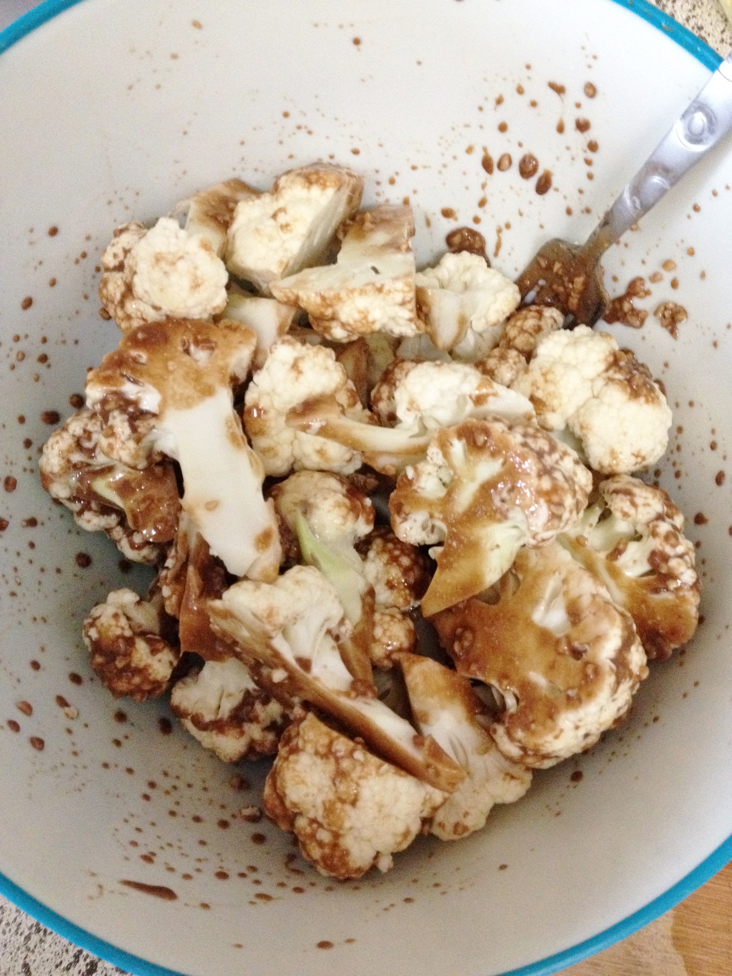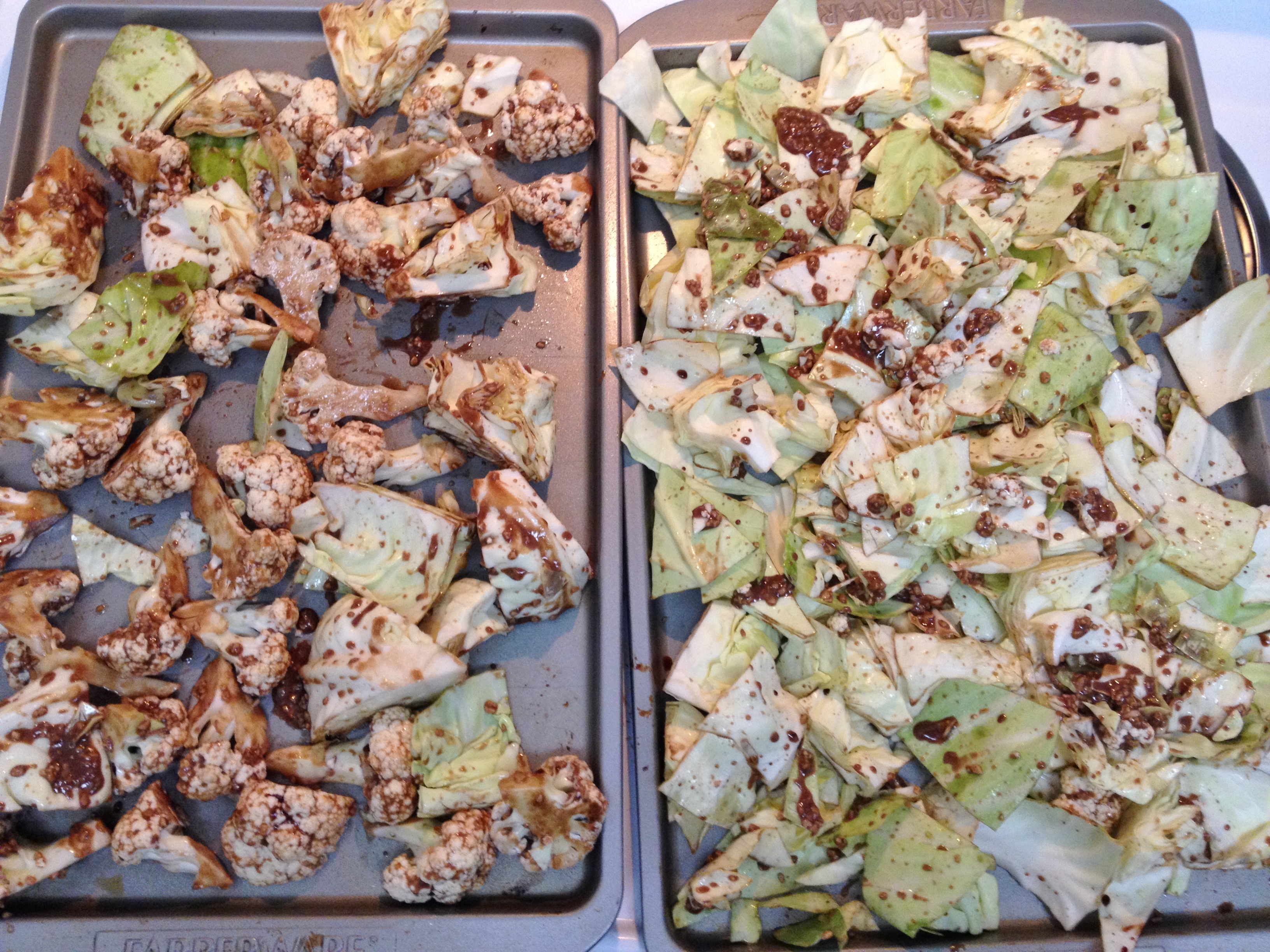 Normally I have large ziplock bags for this but I ran out, so a large bowl was it. I didn’t get a chance to mix it while it was marinating but it still turned out great. In the bottom of the bowl add dressing ingredients and mix. On cutting board carefully chop cauliflower into small florets and add to the bowl. Mix really well. Carefully chop the cabbage into quarters then each quarter in half. Place in bowl and toss, then add more and toss. Cover bowl with saran wrap and let sit in fridge for two hours. Bake at 400 degrees for 25 minutes. These don’t need long to crisp up – my cauliflower and cabbage were both on the small side, if you want crisper add minutes.