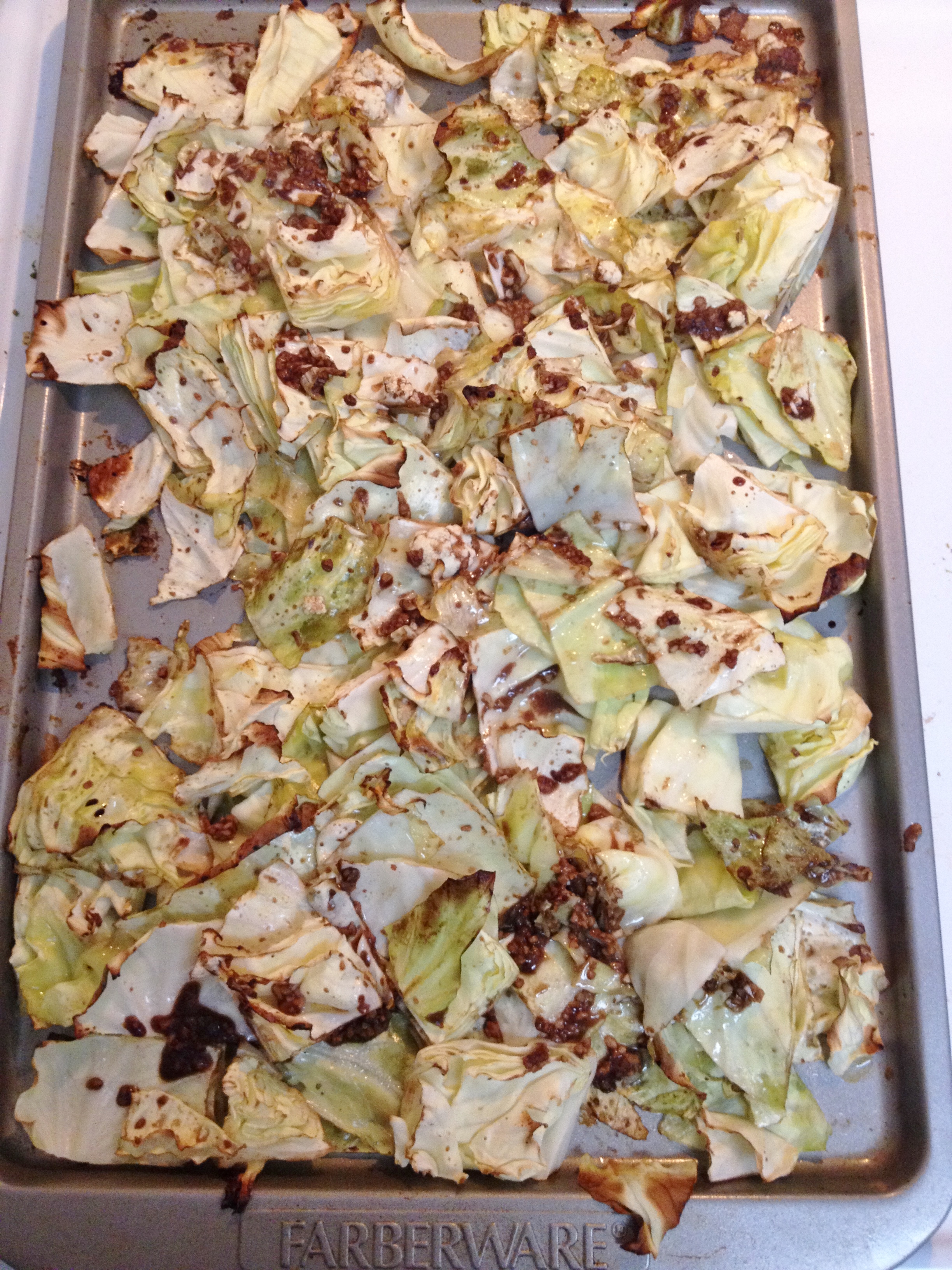 So, let me also caution you. You may notice that I did not use foil or parchment paper…Well, I ran out of parch, and told myself over and over to line the pan with foil. Well I forgot and ended up losing a baking sheet in the burning process – but crispy cabbage is awesome tasting. It tasted nutty and caramelized the sugars in the vinegar and Dijon.