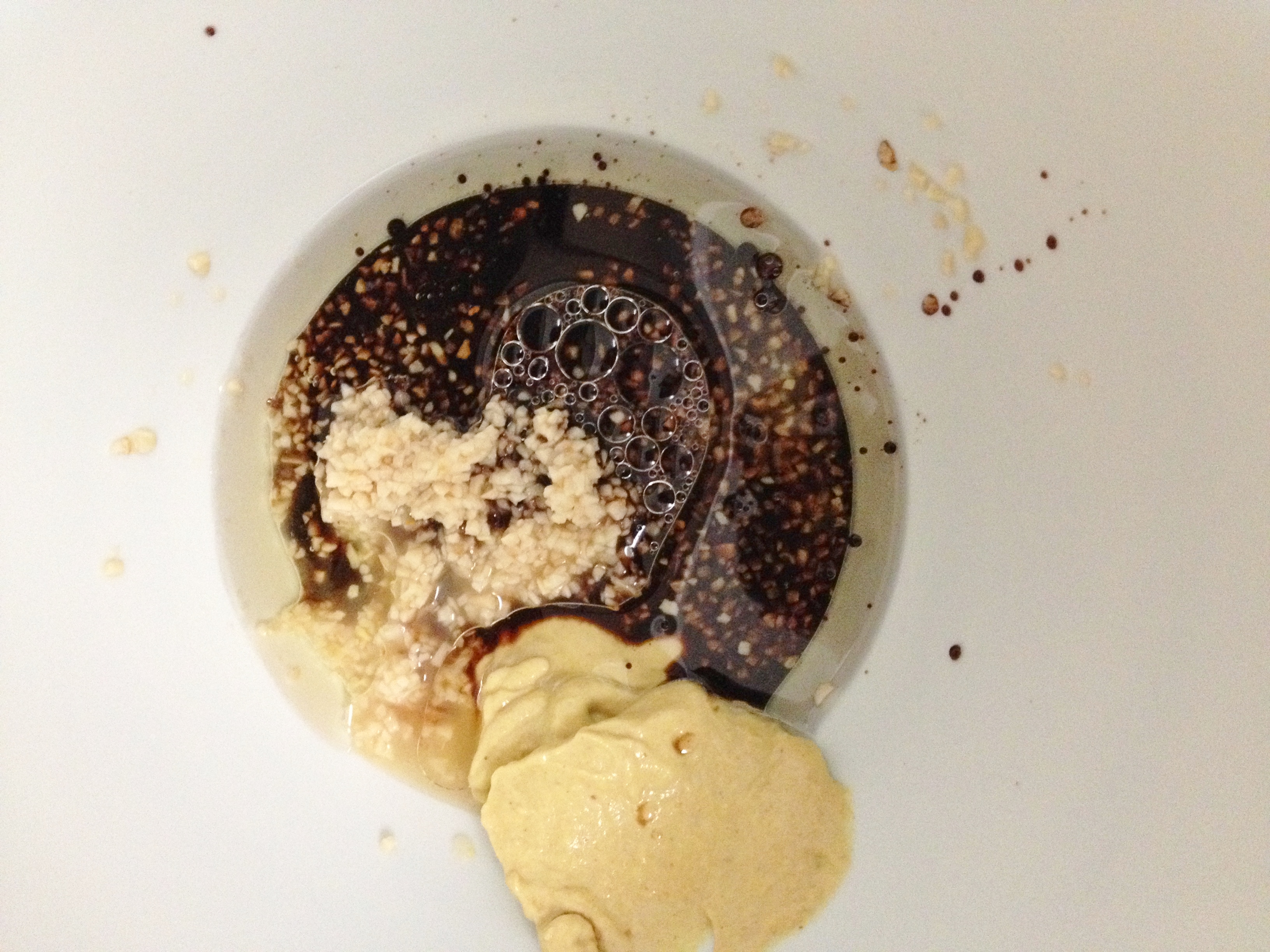 1. In bowl add oil, vinegar, mustard and garlic and mix.