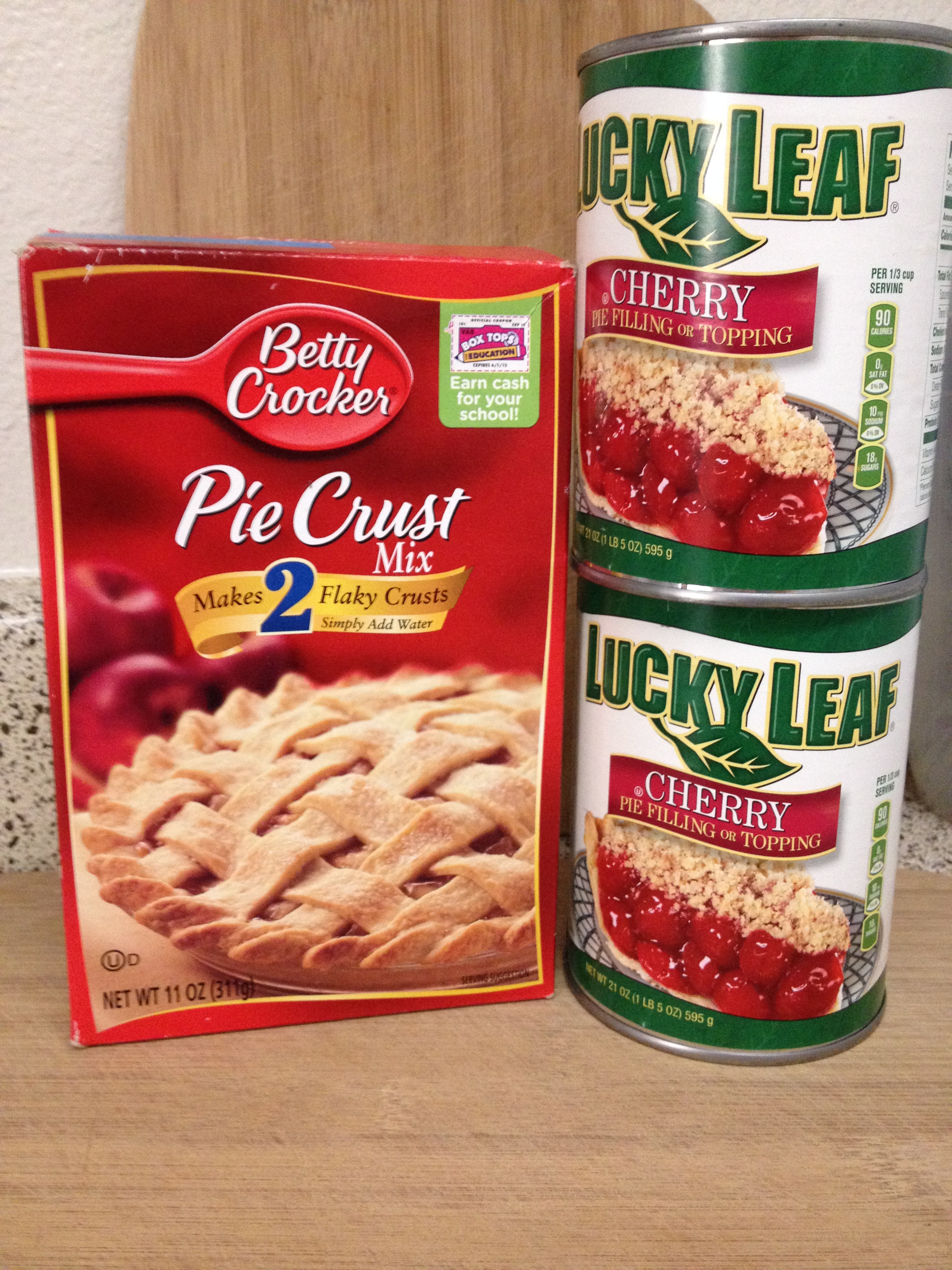 The two ingredients are one box of Betty Crocker Pie Crust mix two cans Lucky Leaf Cherry Pie Filling. The pie crust just uses 1/3 cup of water. Want to add a little more flavor? Add some spice to the crust, cinnamon to the cherry filling. Luckily, the filling is so super-sweet that you don’t need much of anything else. My coworkers really enjoyed the mini’s and I got my sweets craving satisfied.