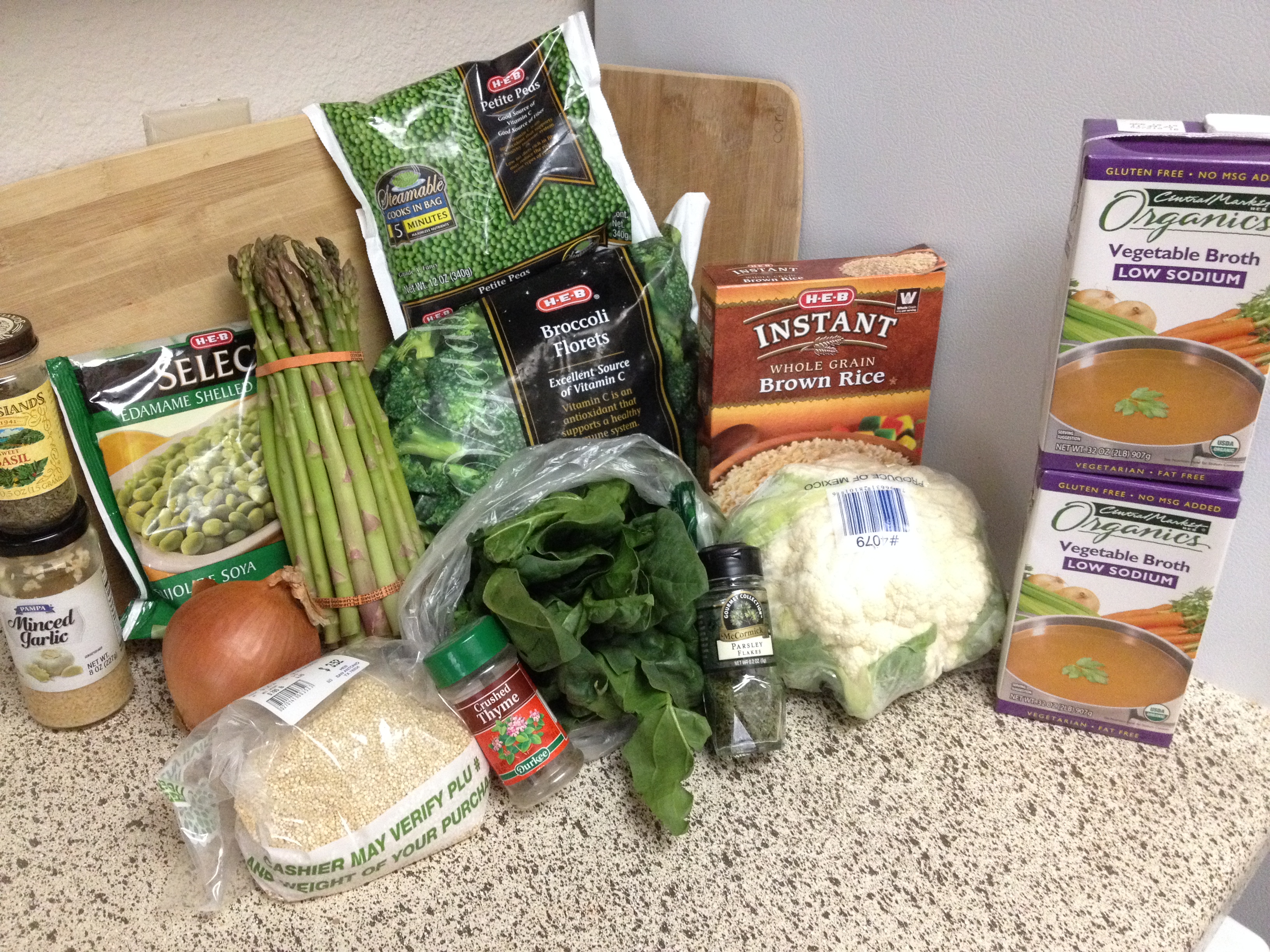 I put the big pot back on a burner on low heat. In a big saute pan on another burner on medium heat add 2 cups of more veg stock and the broccoli and onion and put the lid on. Pour the peas and edamame into the rice pot and mix. Add the asparagus then spinach to the broc pan and mix. Keep the lid on so the spinach steams through. After cooked add everything to the rice pot and mix well. Portion out and enjoy!