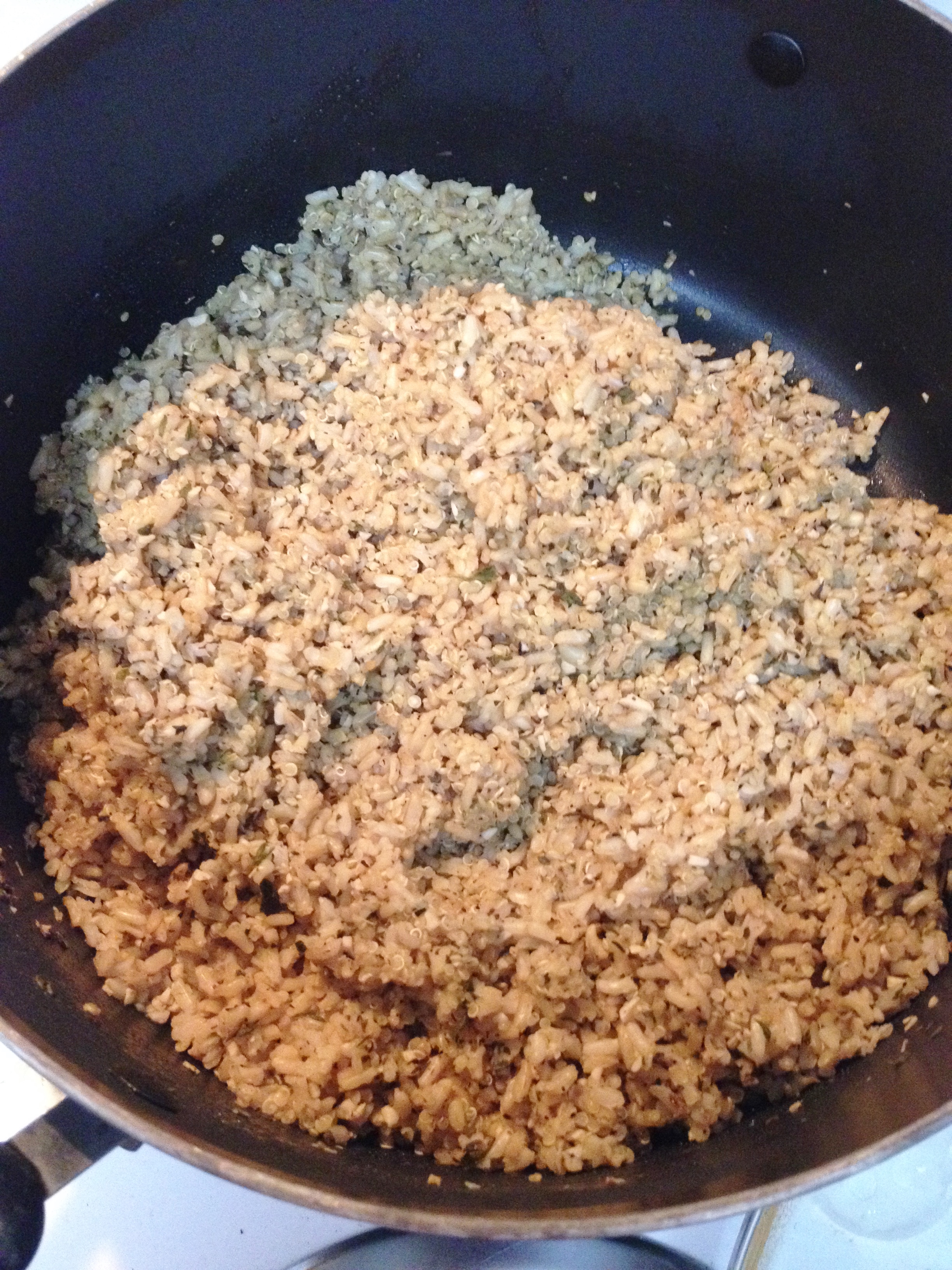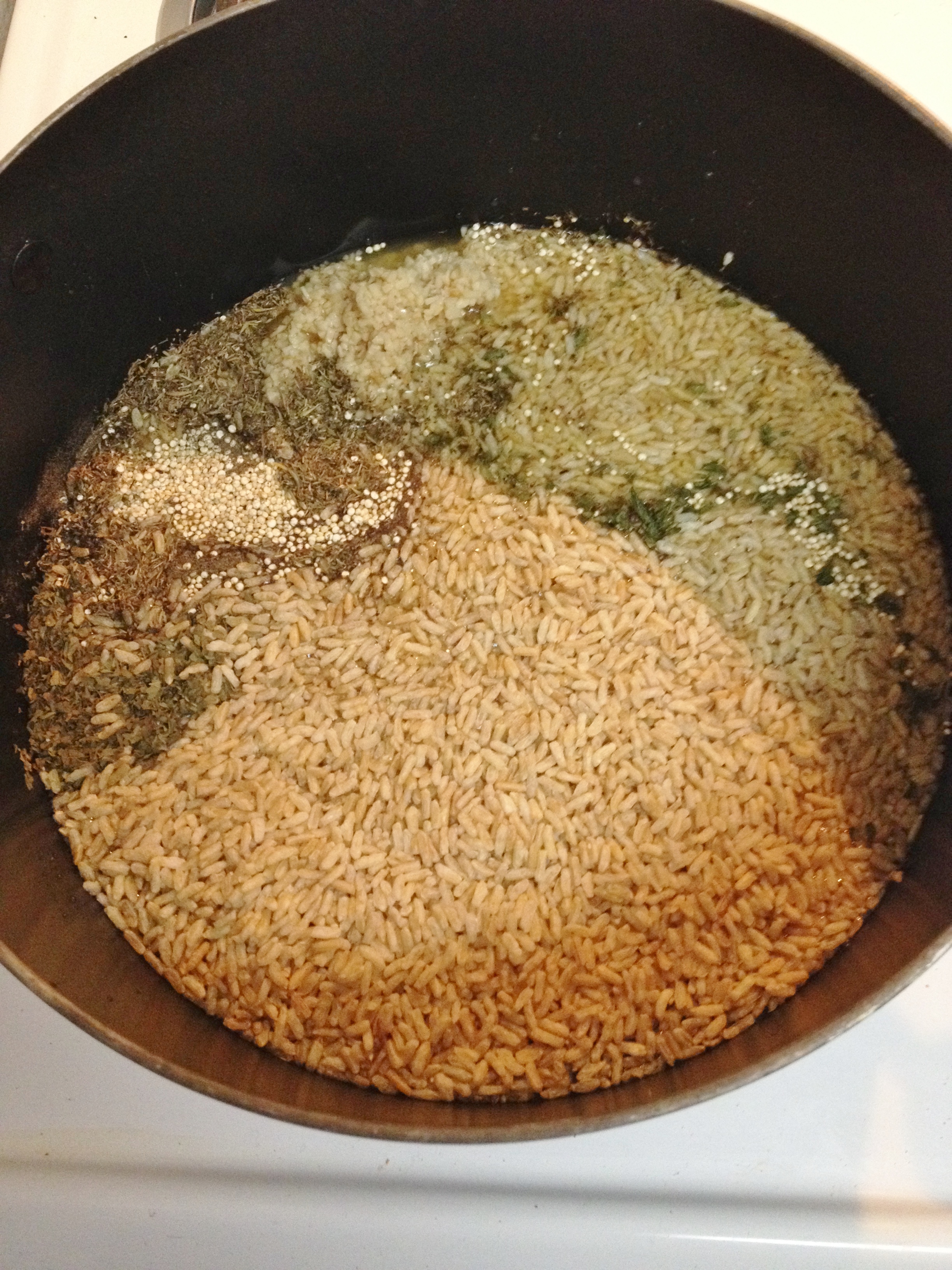 1. Bring rice, quinoa, stock, and spices to a boil then simmer for 20 minutes. When done take off burner.