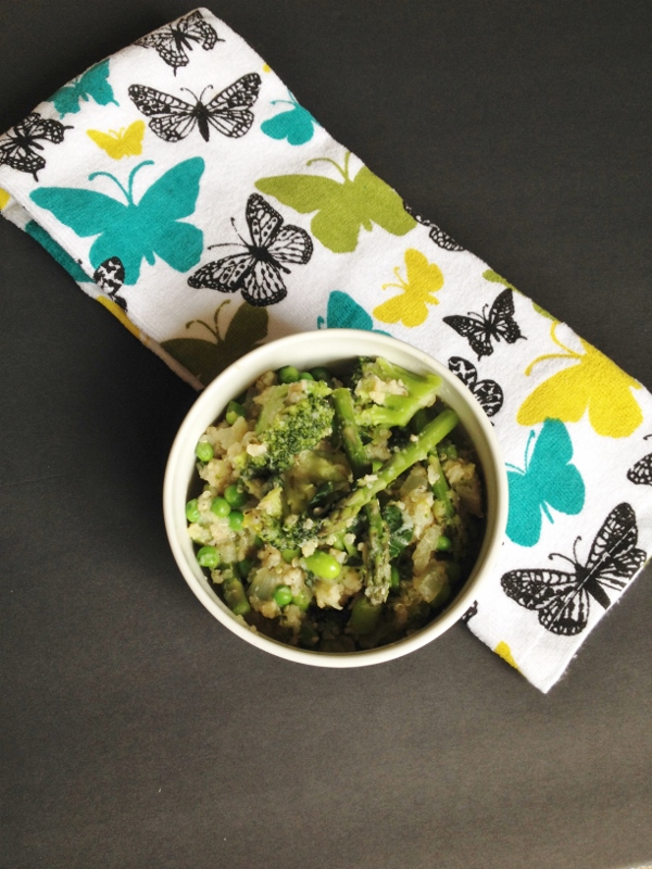For my risotto I used a mix of brown rice and quinoa and instead of water I used low sodium veggie broth. I made this first with the spices and garlic in my largest pot; while cooking cut up onion, asparagus, and spinach. After the rice was cooked I took it off the burner and set aside. Then I cut up the head of cauliflower into big chunks and dumped all of it along with the last of the container of veg stock. Toss the peas and edamame into the microwave for 6 minutes (if it’s a steamable bag). After it was steamed through I poured the cauliflower and veg stock into the food processor and let it rip until creamed. I then poured all that into the big pot with rice and added another 1/2 cup of stock and mixed. Super creamy!