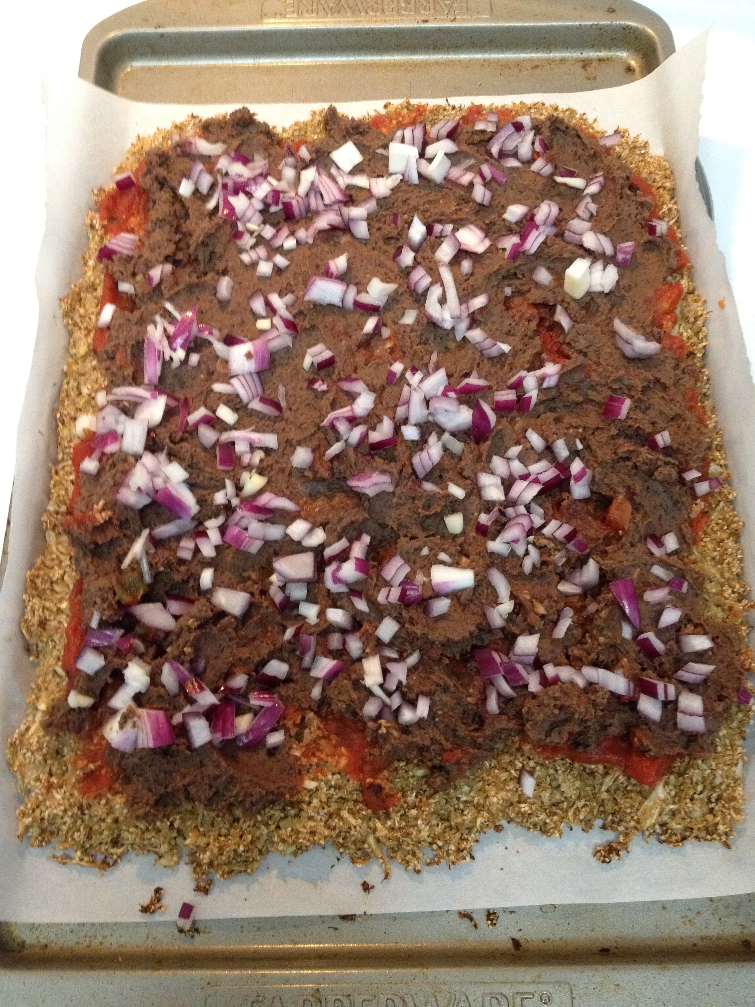 On the crust pour your sauce and spread with a spoon.  Then spoon the beans on top of the sauce then carefully (because the crust will split) smooth them out with either the spoon or your fingers.  Then sprinkle the chopped onions, taco filling (this is not gf, unfortunately), mushrooms and olives, then top with cheese.  Bake for 20 minutes then eat up.  Be careful when putting on plate – the crust is flimsy and should be eaten with a fork.  Savor this and know that you have made a less-calorie pizza crust and your own “refried” beans!