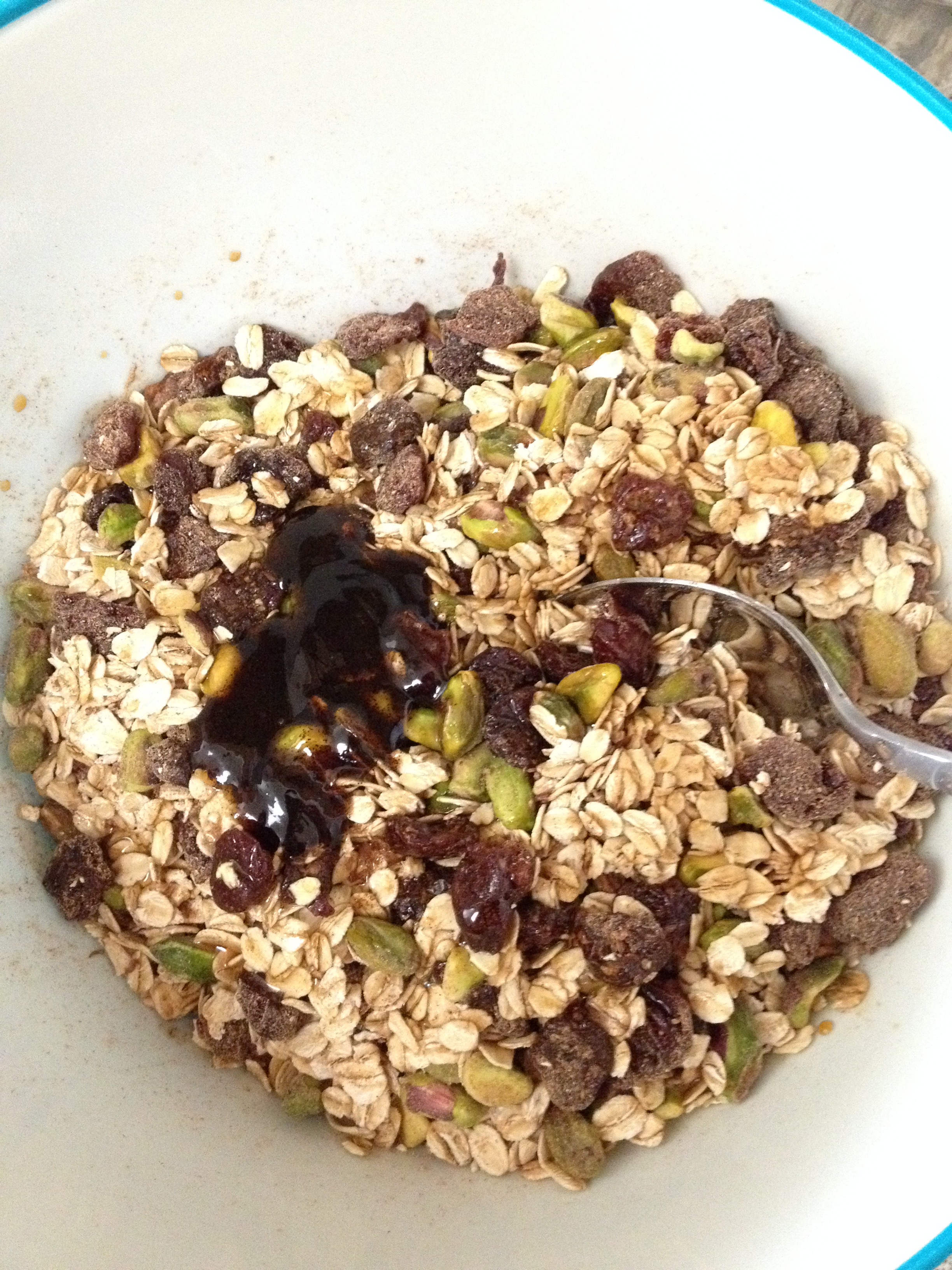 3. In large bowl add all dry ingredients, cherries, and pistachios, mix well.