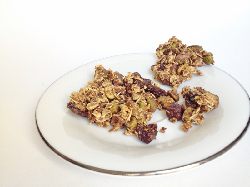 I have never loved granola more than when I started making it myself. And when I say love, I mean that I eat through it more quickly than necessary. Probably why I never bought it before, was because there was so much sugary-goodness in it to make me see sugar stars. Here is my no-refined sugar Cherry Pistachio Granola Chunks that is vegan and gluten-free.