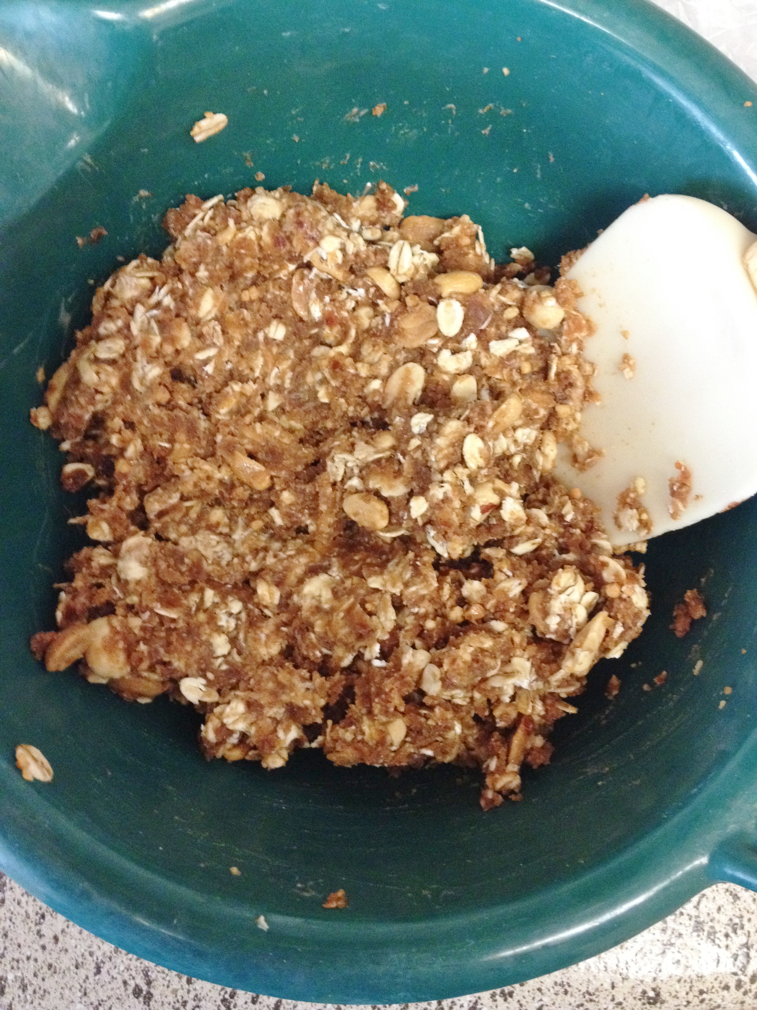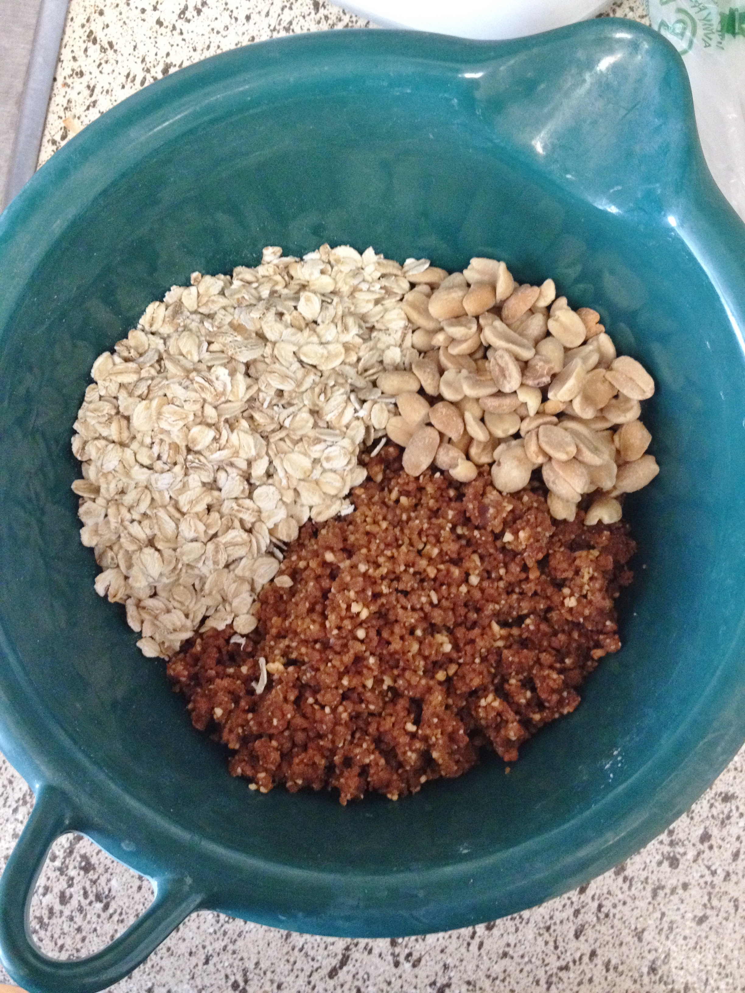 3. Pour mixture into a bowl and add oats and peanuts. Mix with spatula or spoon.