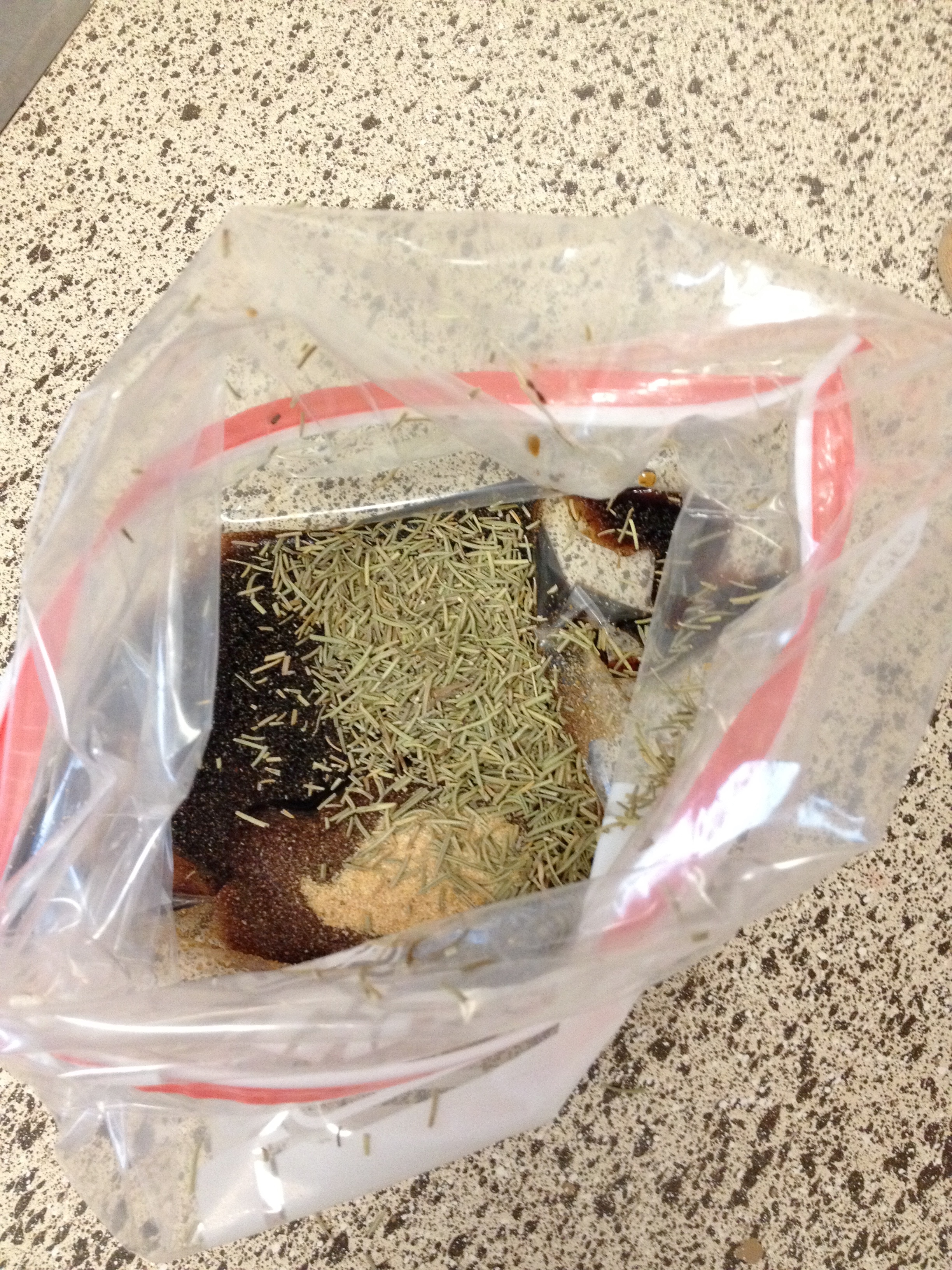 1. In a large ziplock bag pour soy sauce, vinegar, garlic, pepper, and rosemary. Mix a little.
