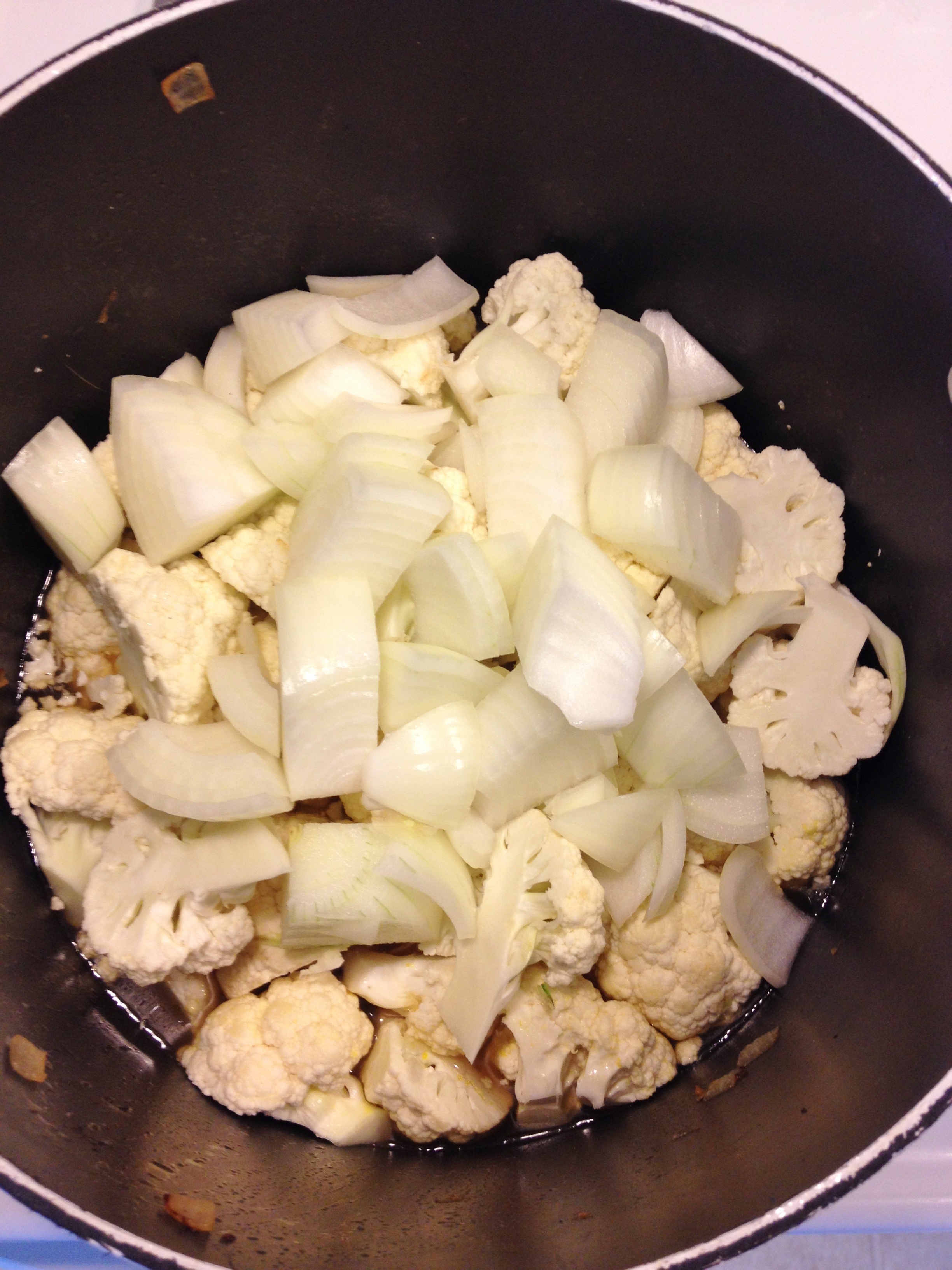 2. Wash and chop cauliflower into small chunks and pour with vegetable stock into soup pot. Chop second onion and add to cauliflower. Boil with lid on until soft.