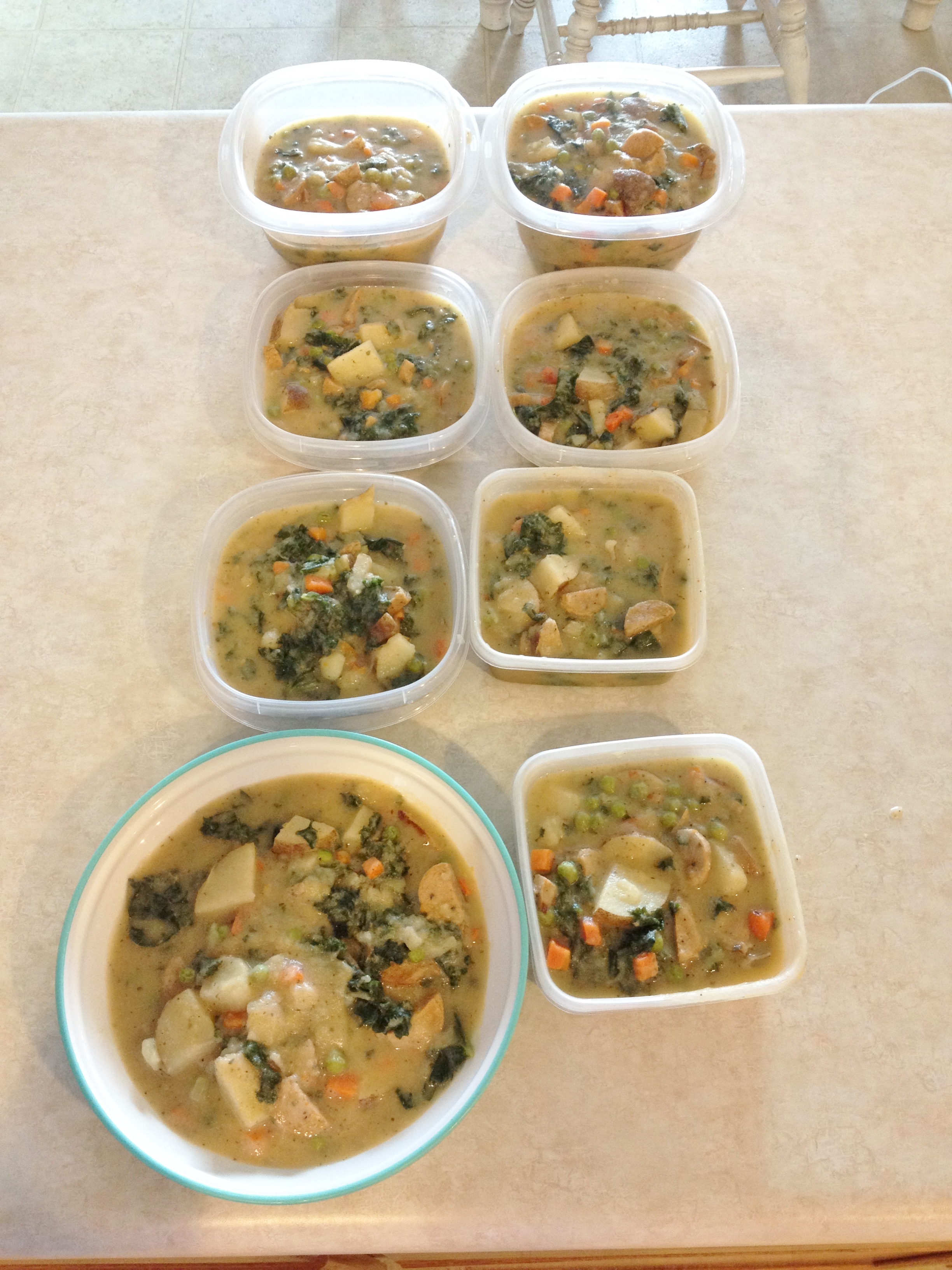 While the cauli and onions are boiling wash the potatoes and chop into small chunks. Once the cauli/onions are done, very carefully pour or scoop into a food processor or blender. I got to use a Ninja blender this time. Woohoo, for cooking at the family’s house! Process until smooth. Pour back into soup pot and add the potatoes, bagged peas and carrots, and sauteed onions and sausage. Mix really well then add about four cups water and spices. Let cook until potatoes are just getting soft. Add chopped kale and let cook until potatoes are done; this is a semi-spicy soup, yum. Also, be careful when pouring the pureed cauliflower back into the hot soup pot and adding the other ingredients. It will be hot, and it will spit out HOT cauliflower puree at you. It burns – let me tell ya!