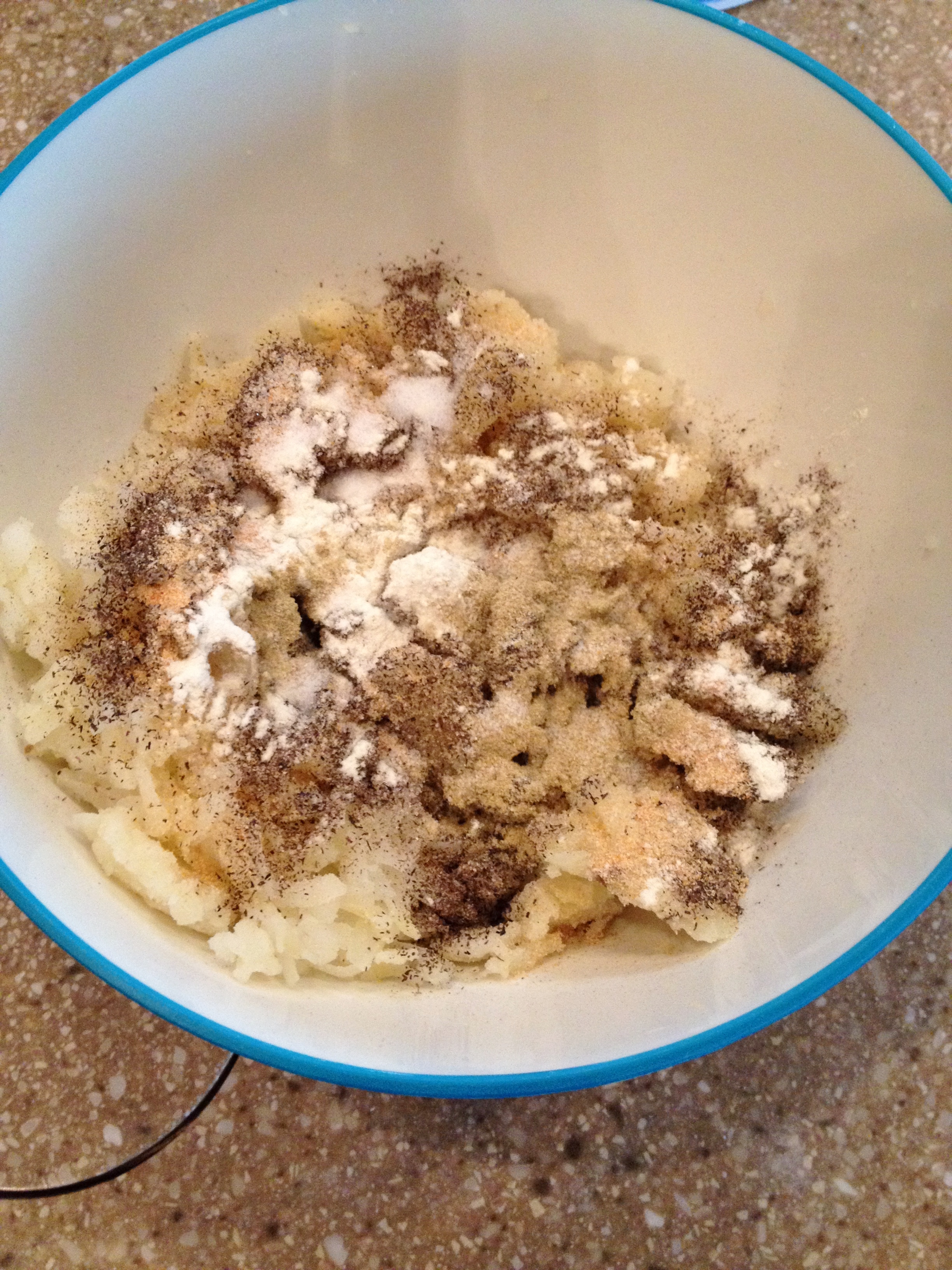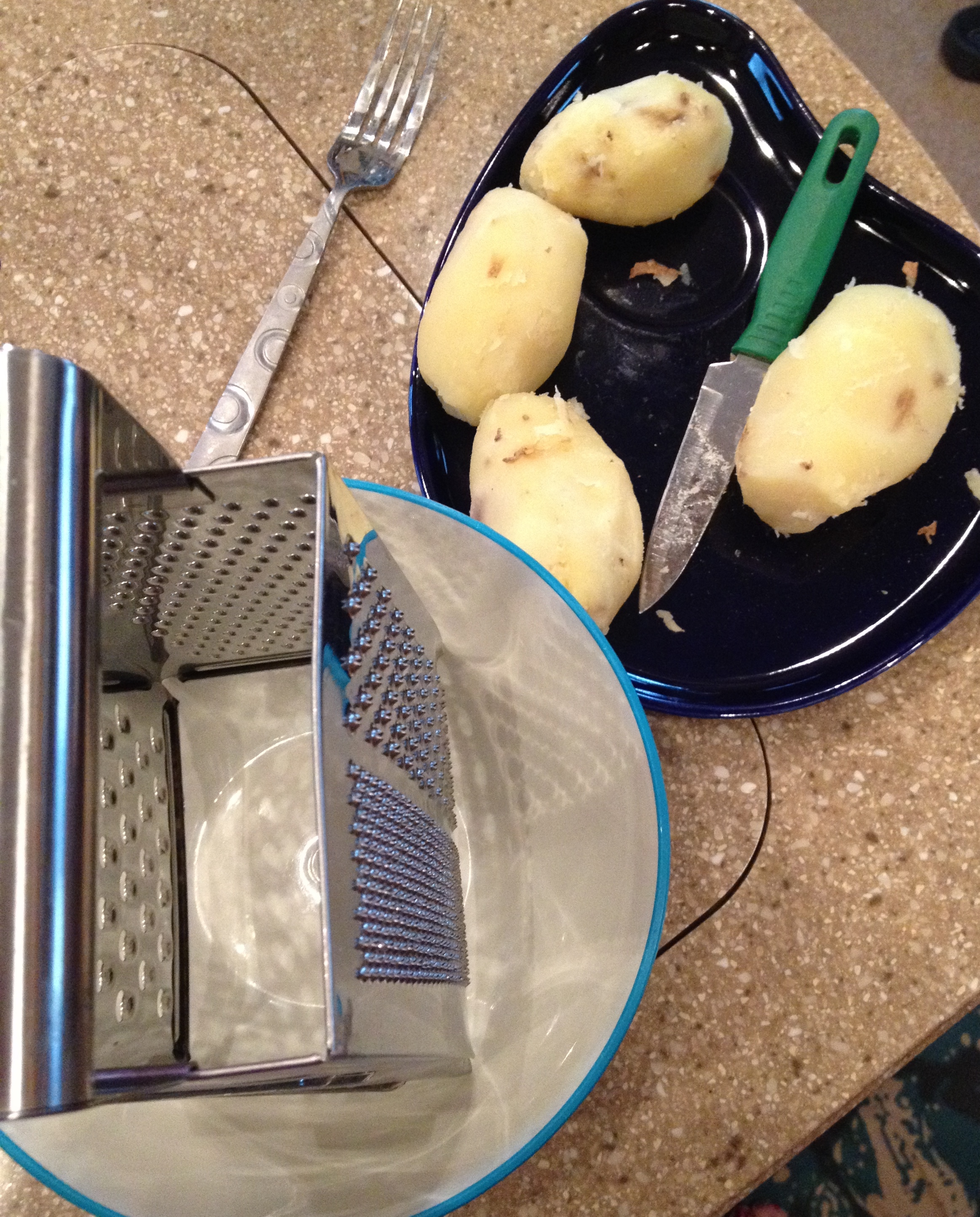 3. Once cool peel and shred potatoes either in food processor or with a cheese grater.