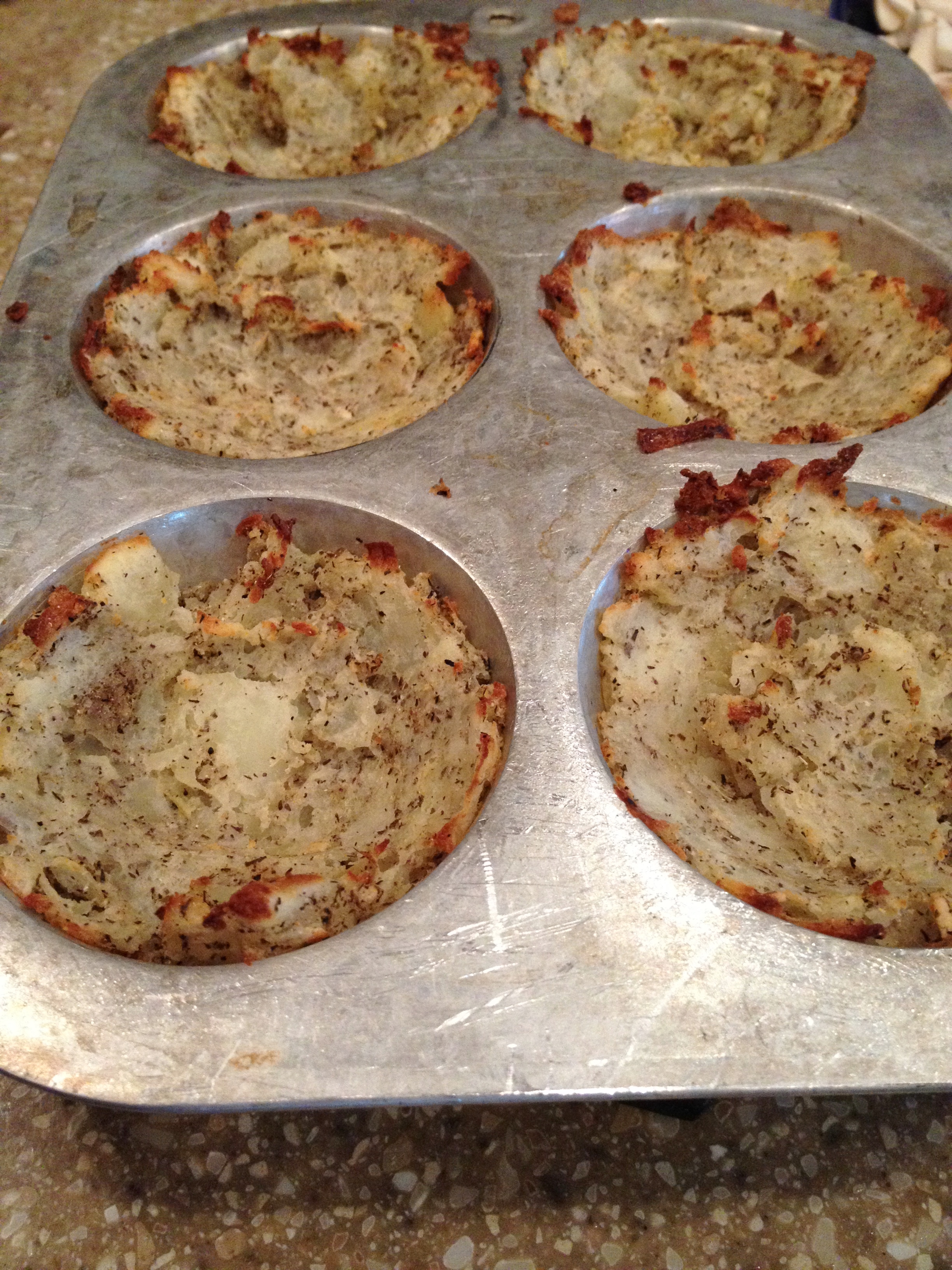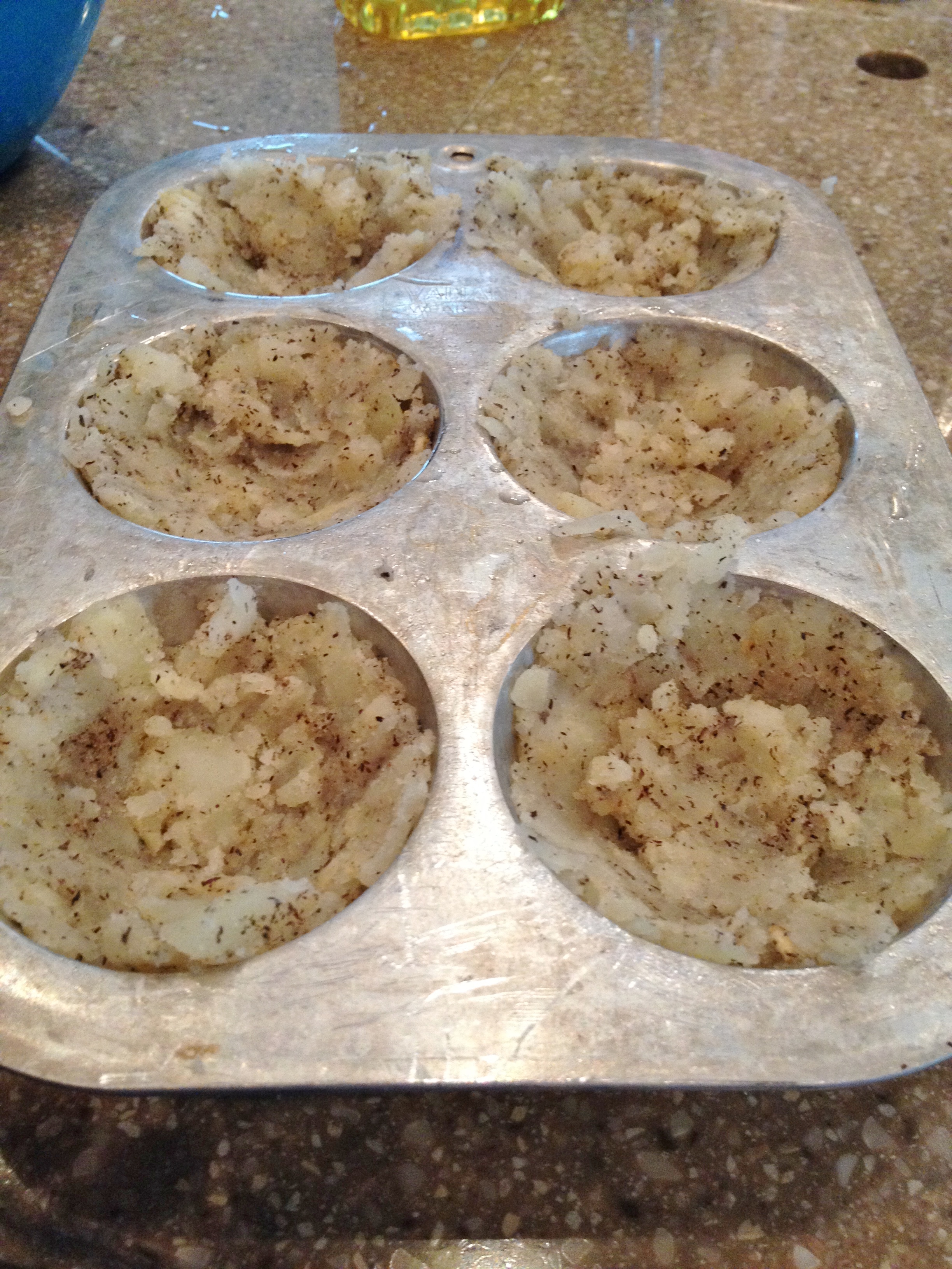 5. Using your finger place small portions of potatoes in muffin tins and press in and up sides – about 3 tablespoons.