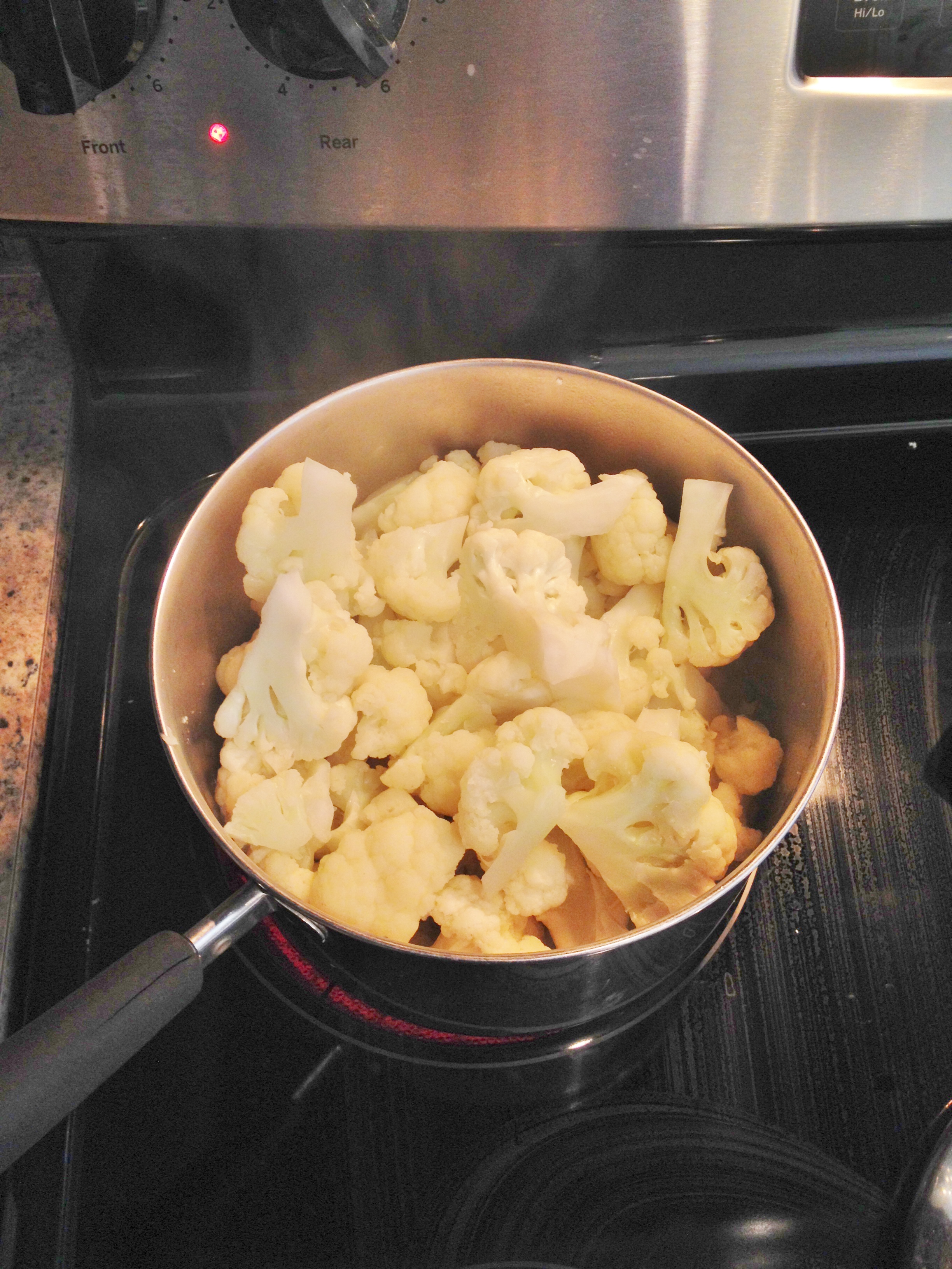 1. Chop and boil cauliflower in 2 1/2 cups vegetable stock until fork tender.