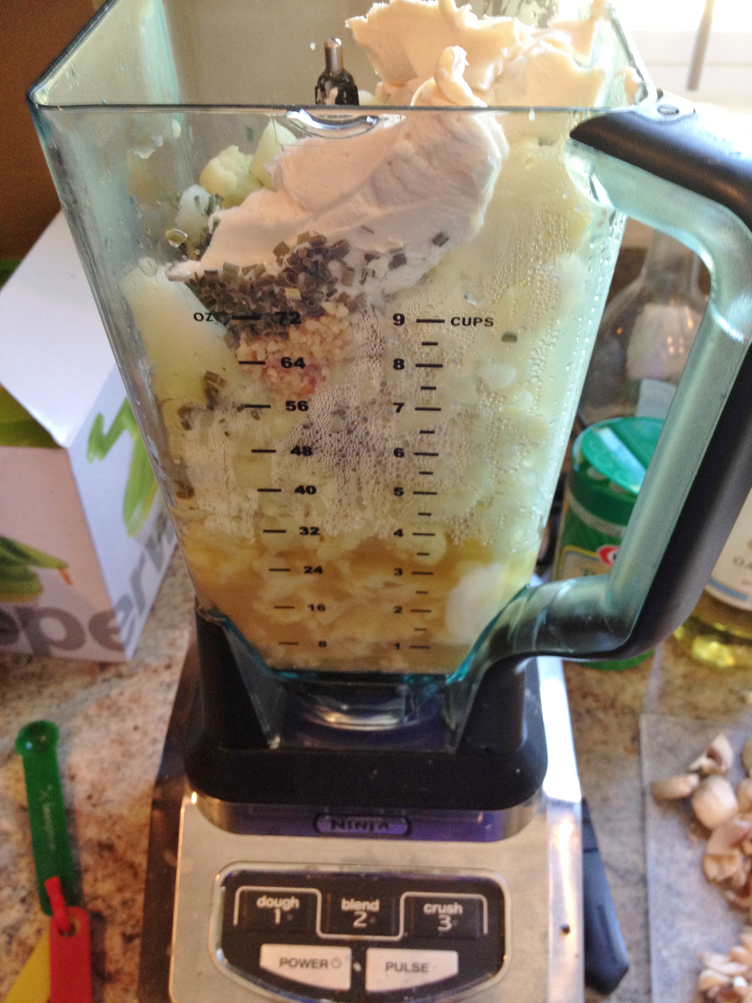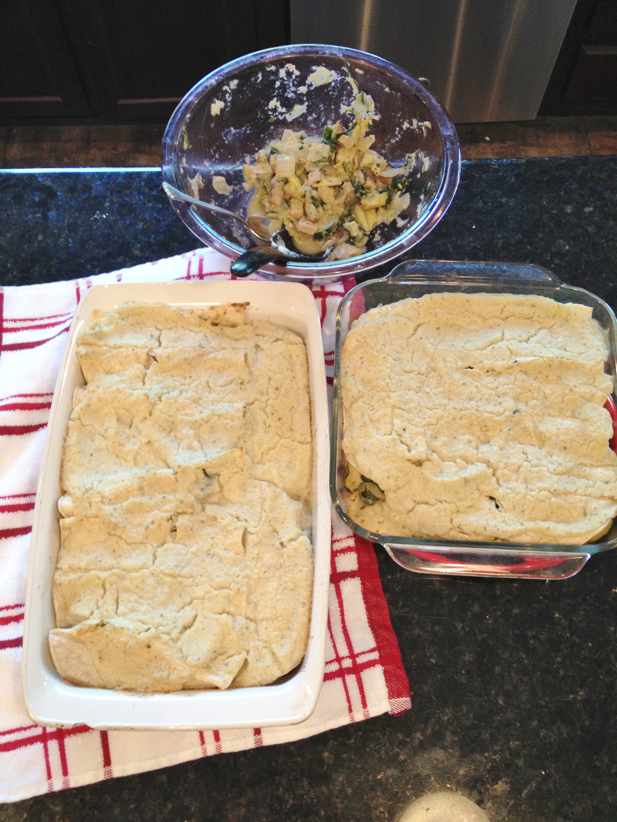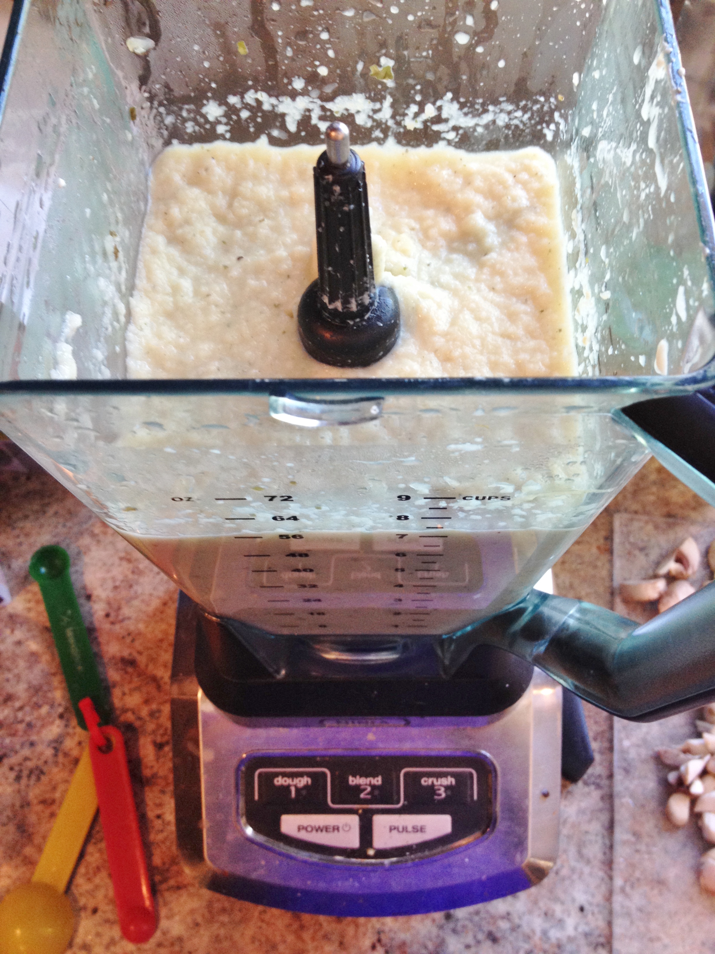While the cauliflower is boiling chop your onion and mushrooms, and defrost the spinach by putting it in a bowl with hot water. Sauté the onion and minced garlic with about two tablespoons stock until just soft – you can do the veggies all together, but my area is smaller so I started with the onion and garlic then poured into a mixing bowl when done. Then I sautéed the mushrooms with about three tablespoons vegetable stock until stock was gone, then poured into the bowl. While mushrooms were cooking I chopped the zucchini then added that to the pan after mushrooms were done. Sautee that with stock until just tender, then pour into bowl. Squeeze liquid out of spinach and drain artichokes, and chop chicken into small chunks. After zucchini is done add those three to pan and sprinkle with salt and pepper to season the spinach. Sautee with stock until stock is gone.