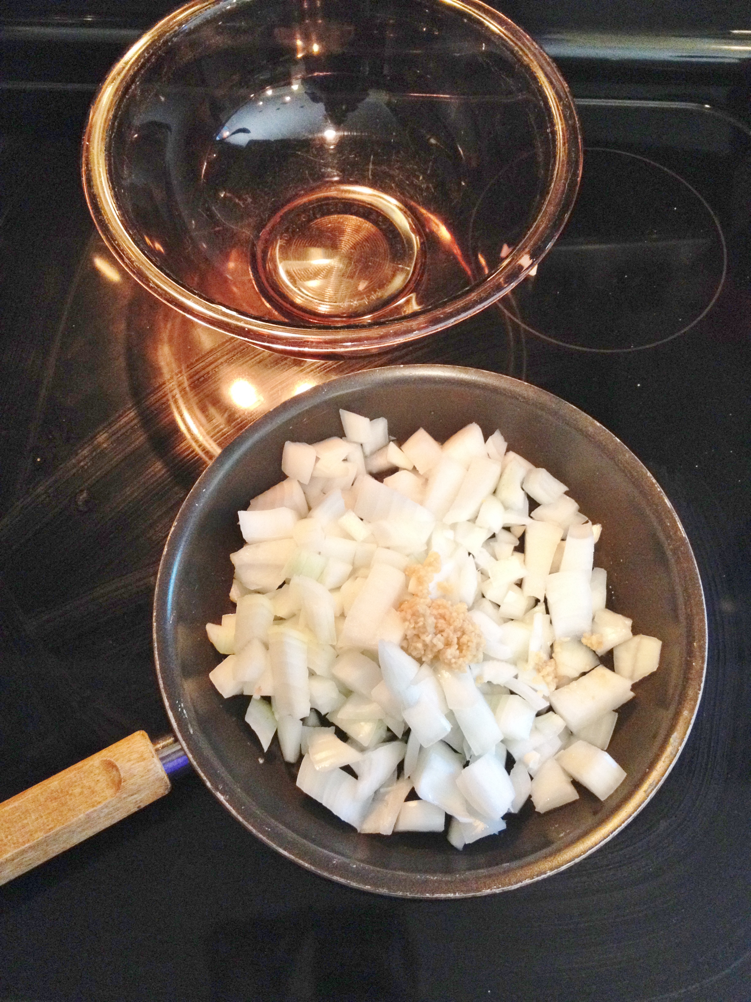3. Chop onions and add to saute pan with garlic and 2 tablespoons stock. Sautee until just tender. Pour into mixing bowl.