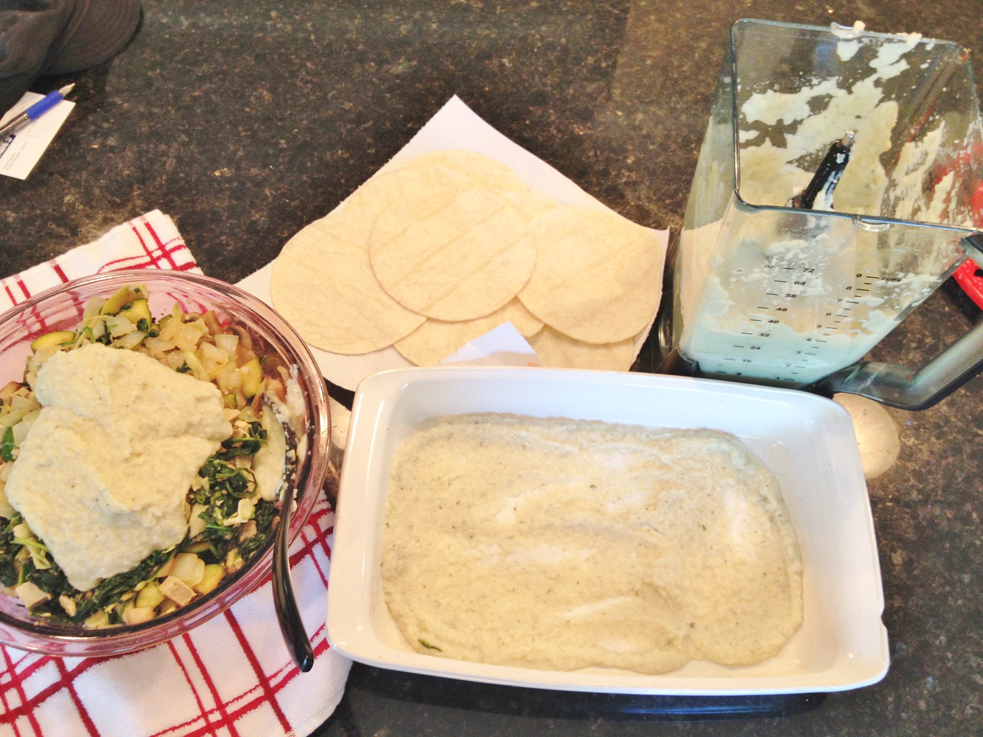 I figured since I have done so many Southwest-style recipes lately that I would do something a little different. And, with cauliflower on sale for one dollar this was just the different I was looking for! Cauliflower Alfredo is yummy all on its own and smothering noodles. This time I decided to make a little looser version like a normal enchilada sauce. I just boiled one large head of cauliflower in about 2 1/2 cups vegetable stock then pureed the cauli with Rice Dream milk, tons of minced garlic, herbs, and Daiya plain cream cheese. Yum.