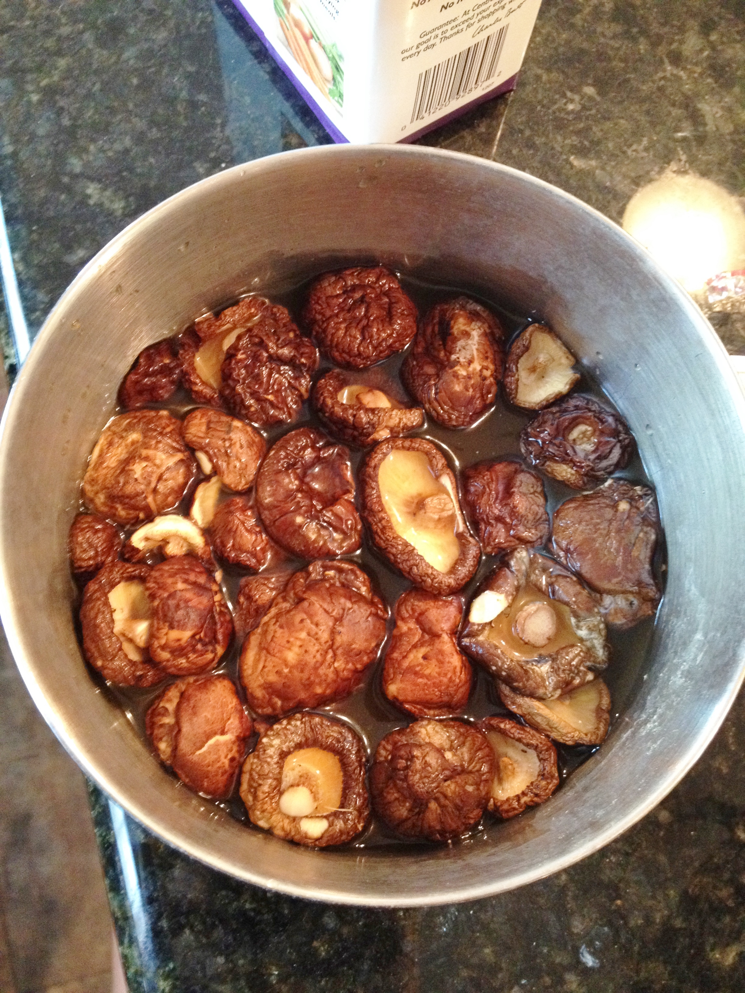 I have had a hankering for homemade spaghetti sauce for a long time, and even though it is late spring early summer, I was making it. I had never used dried mushrooms or reconstituting anything before so I figured what better way to learn than making it into a spaghetti sauce. The only place in town that sells dried mushrooms? Whole Foods. And they are a little expensive, but the clerk said that you can reconstitute Shiitake’s twice, so if you wanted to make a stock to freeze and the sauce you could. Me? Too much time. The clerk also said that the Shitaake’s are a meetier mushroom which is perfect for spaghetti.