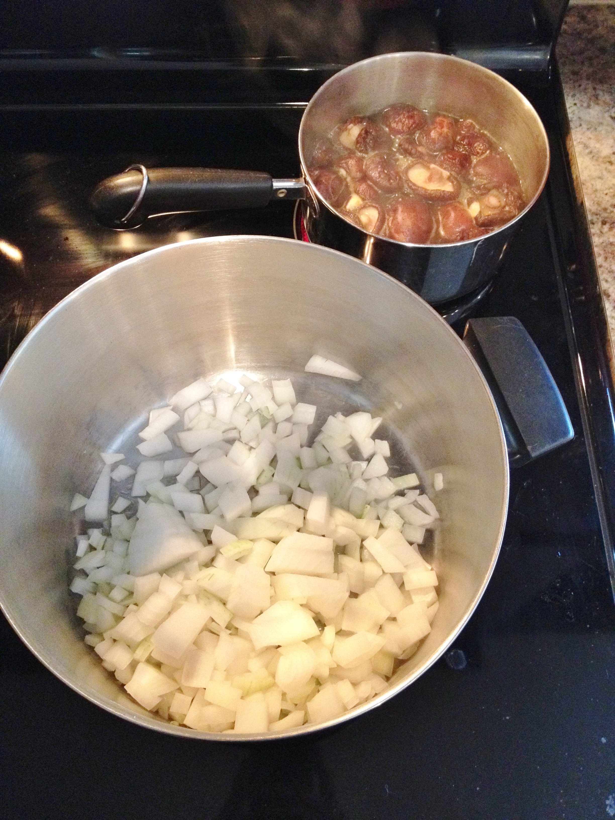 2. In large pot pour a little olive oil then chop your onion and add, turn burner to medium-high.