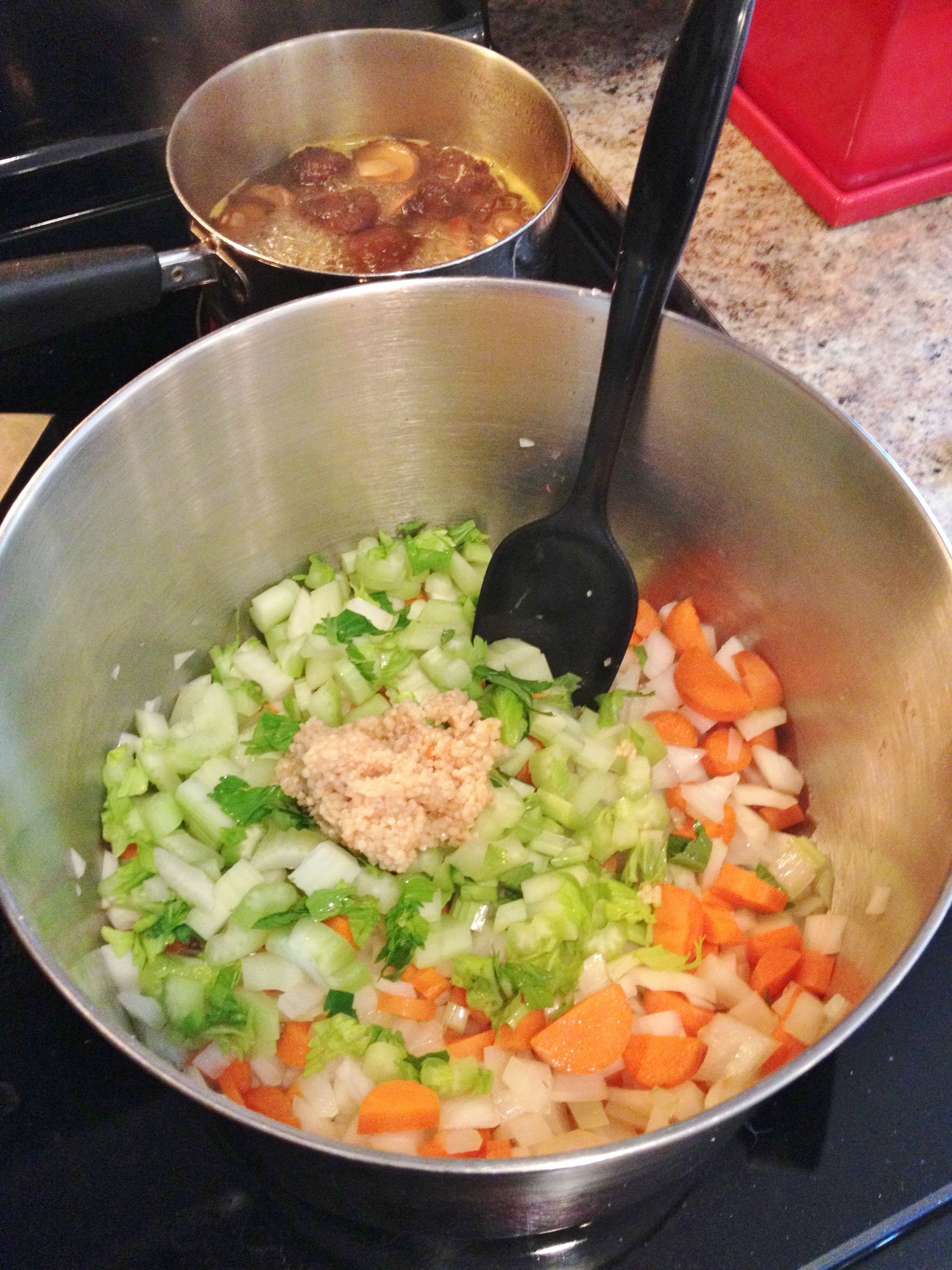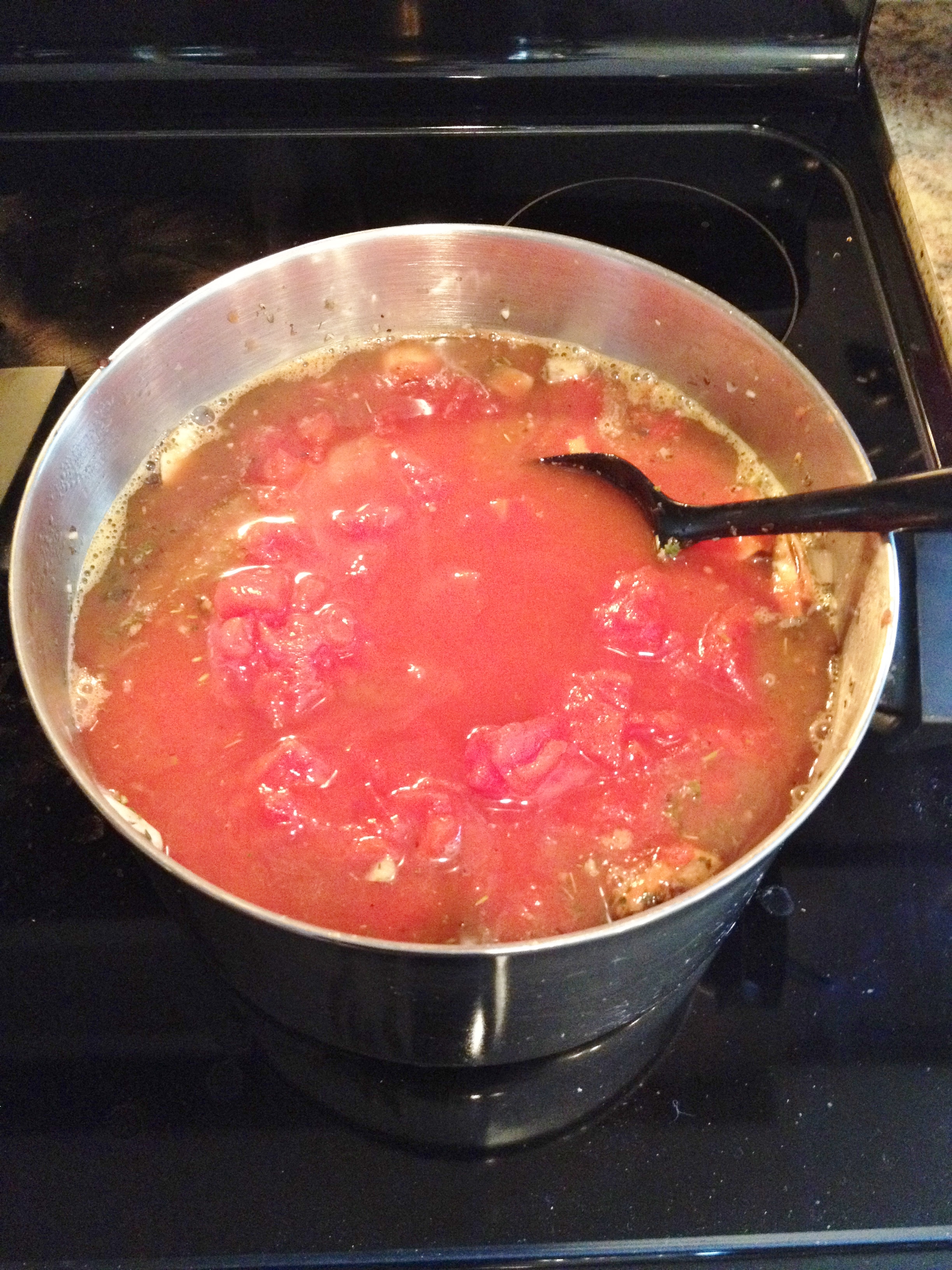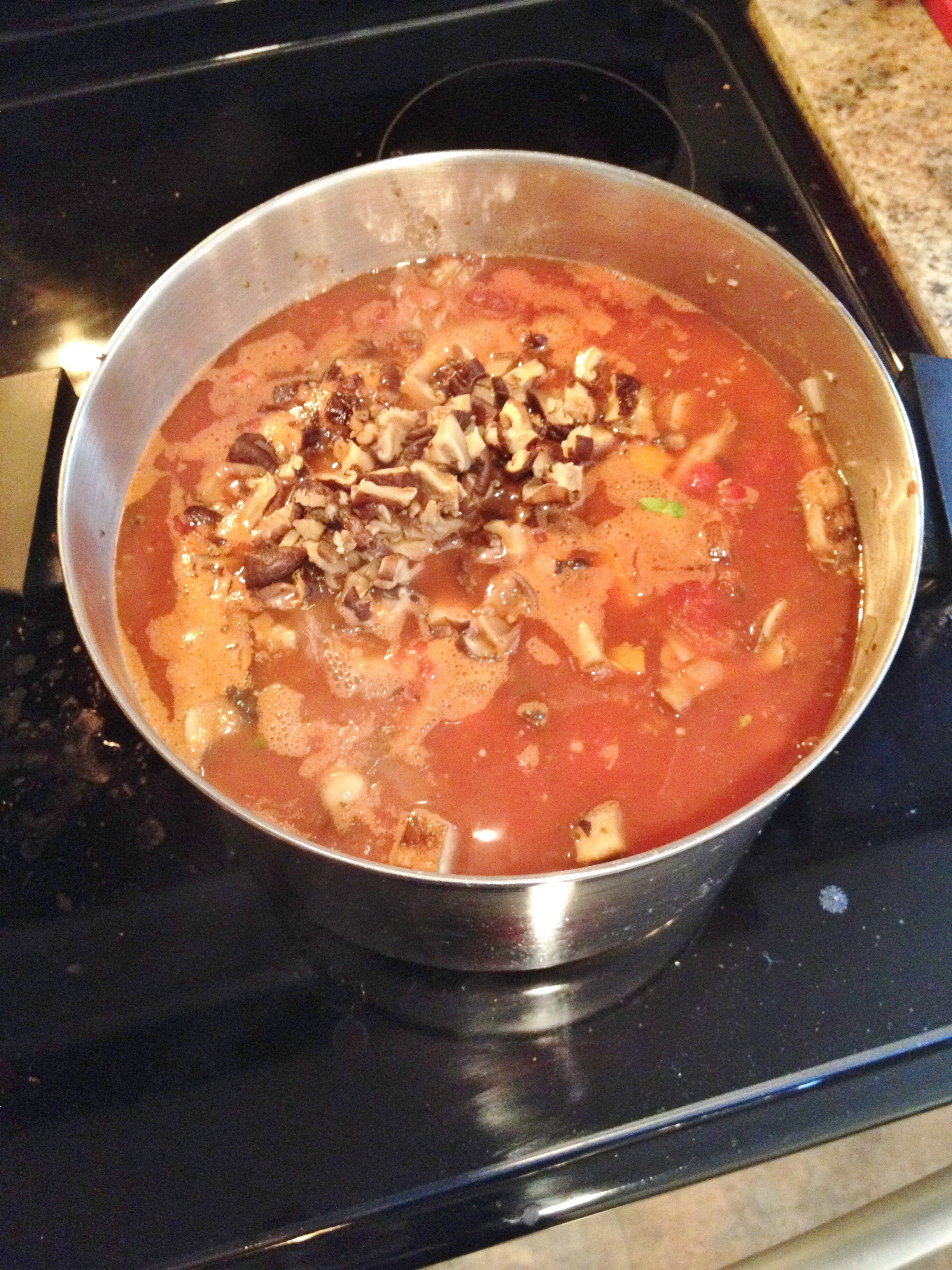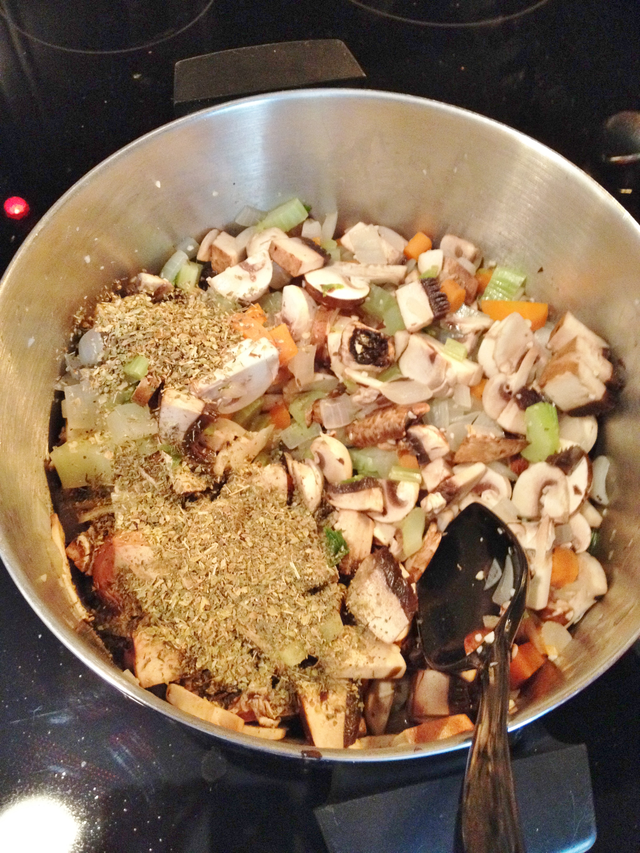 I started with pouring the Shiitake’s in a medium pot with half a box low-sodium vegetable stock and set to boiling. Then start with chopping the onion small and dumping into a huge pot with olive oil. Start cutting your carrots and celery (greens and all) into small pieces and adding to your pot and add minced garlic. Let sweat out as you chop your button, baby-bella, and portobello mushrooms. Add the mushrooms with the rest of the stock and the seasonings. Mix that really well for a few minutes then add the diced tomato and chopped tomatoes. Spoon out the Shiitake’s and place on cutting board. Let cool slightly and chop into very small pieces and add to pot. Spoon out stock (the bottom will have grit and dirt so be careful when spooning) and pour into large pot. Set burner to low and let go for about 2 hours.