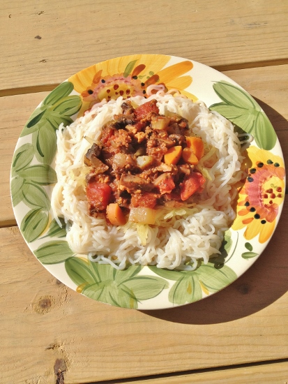 10. Scrape out squash shreds, wash off Nasoya noodles and add to bowl, and spoon your mushroom spaghetti over.