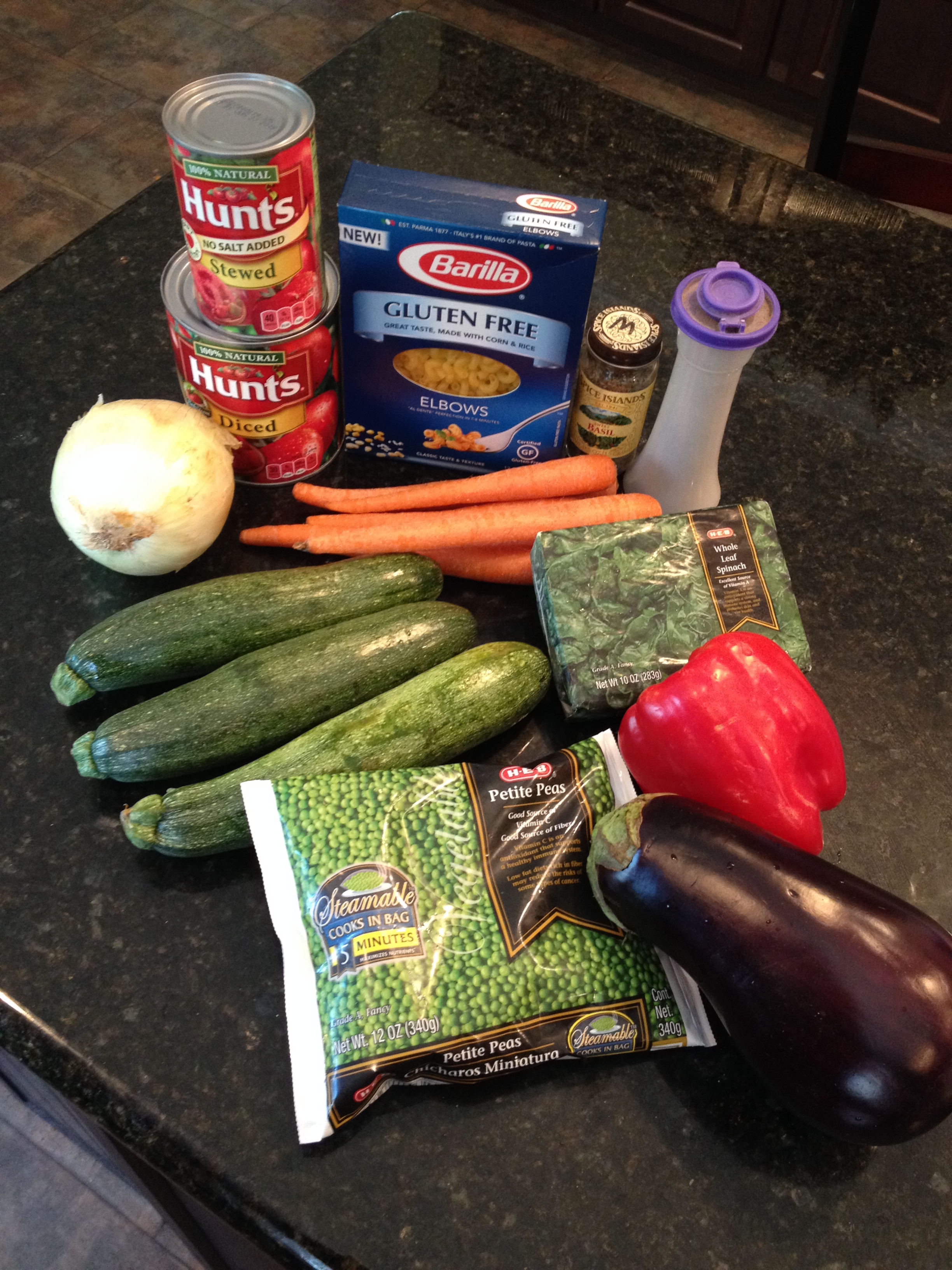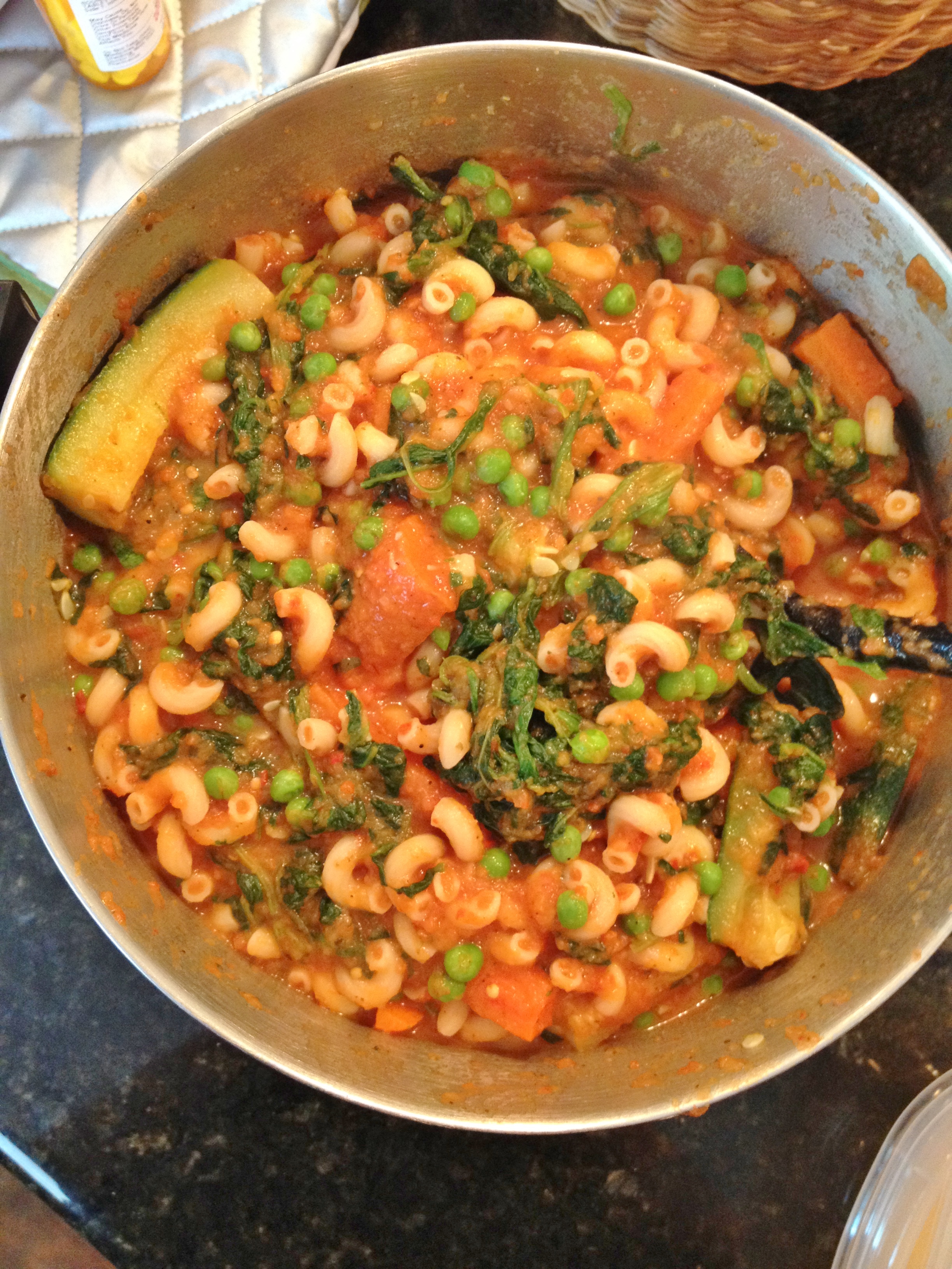 While the eggplant and garlic are roasting, chop your onion and let sweat out in pan with a little olive oil and basil and black pepper. Add tomatoes and let stew until eggplant and garlic are done roasting. Defrost spinach in microwave – once cool, squeeze out all liquid. Chop zucchini and carrots into thinnish spears. Once eggplant is cool enough to touch scrape flesh out of skin and into food processor or blender. Squeeze in roasted garlic. Using a paper towel wipe off burned pieces on red pepper, then slice and scrape out seeds. Add pepper and tomato sauce to blender. Process until smooth and creamy. Boil zucchini and carrots with macaroni until mac is just done. Drain all and pour back into pot. Add eggplant sauce and mix then add peas and spinach. Mix again until combined. Turn burner to low and let heat through until peas are cooked. Enjoy!