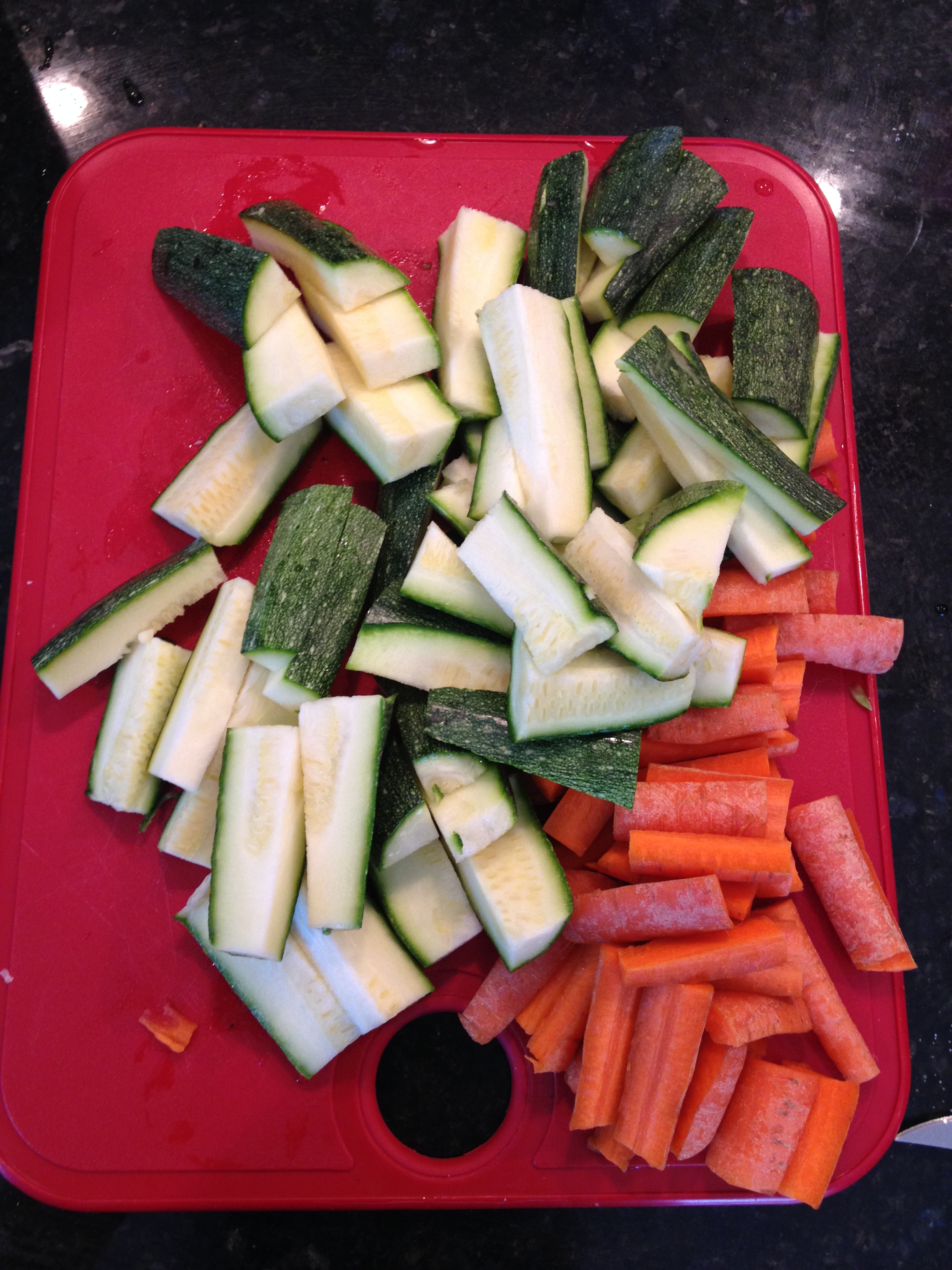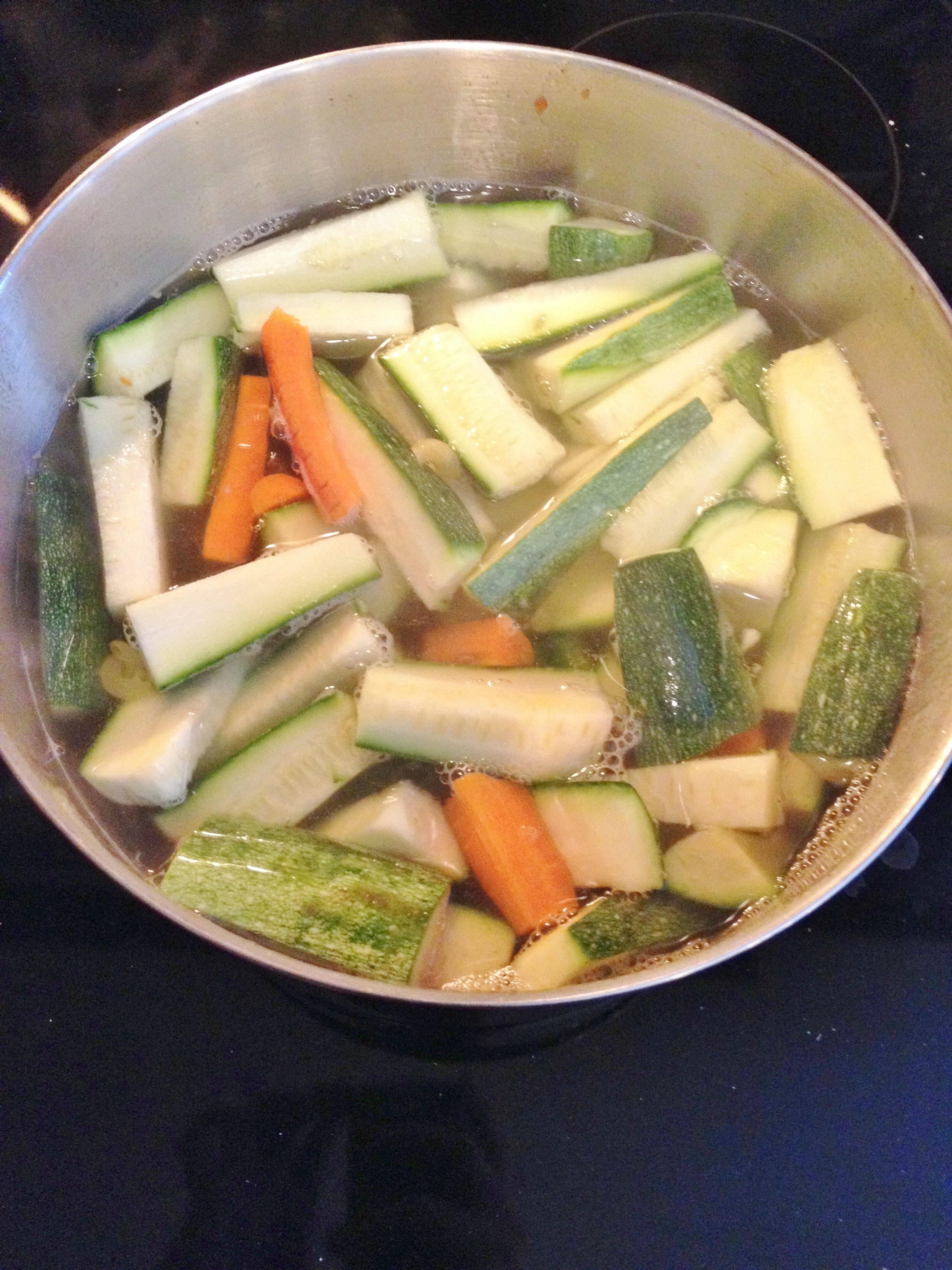6. Defrost spinach in microwaveable bowl. Once cool squeeze all liquid out. Cut zucchini and carrots into thick spears and boil with noodles until noodles are just done.