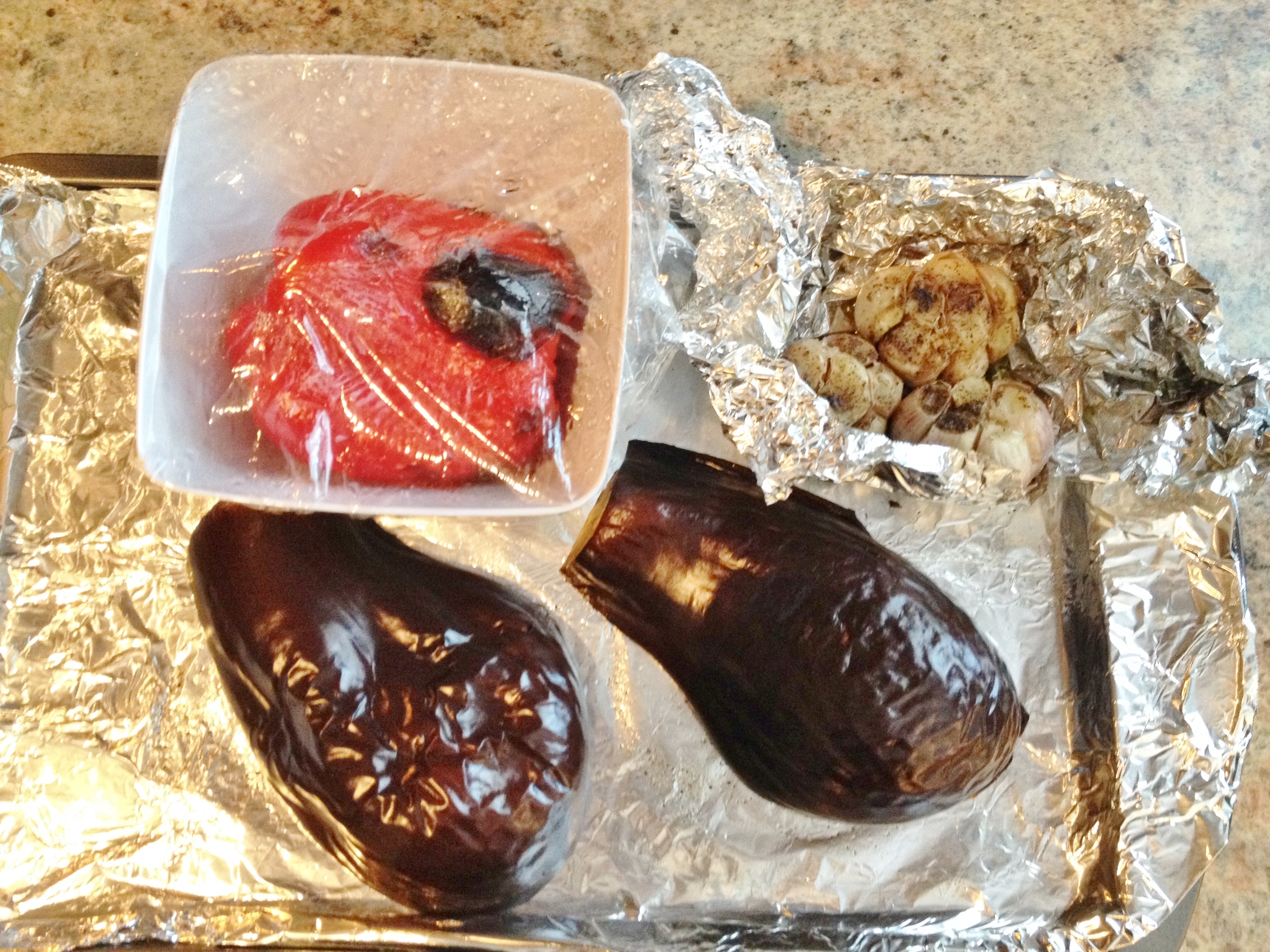 Start off with cutting your eggplant in half longways. Sprinkle olive oil on a baking sheet, then score around the eggplant about halfway down along the sides then across the top in a crisscross pattern. Sprinkle with salt and pepper then place cut-side down and roast at 350 for 30-35 minutes. Cut the top off your garlic making sure to reveal all garlic pieces and take as much flaky skins off as possible. Place in a semi-big sheet of tin foil and pour a few tablespoons of olive oil over them. Sprinkle with salt and pepper then close foil over them. Roast garlic for 35-40 minutes. You may need to take the eggplant out before the garlic is done. Once the are both done, take out then turn broiler on. Let eggplant and garlic cool until you can handle them. Broil the red pepper (with the oven door open slightly) until blackened on all sides. Take out and place in bowl and cover with plastic wrap.