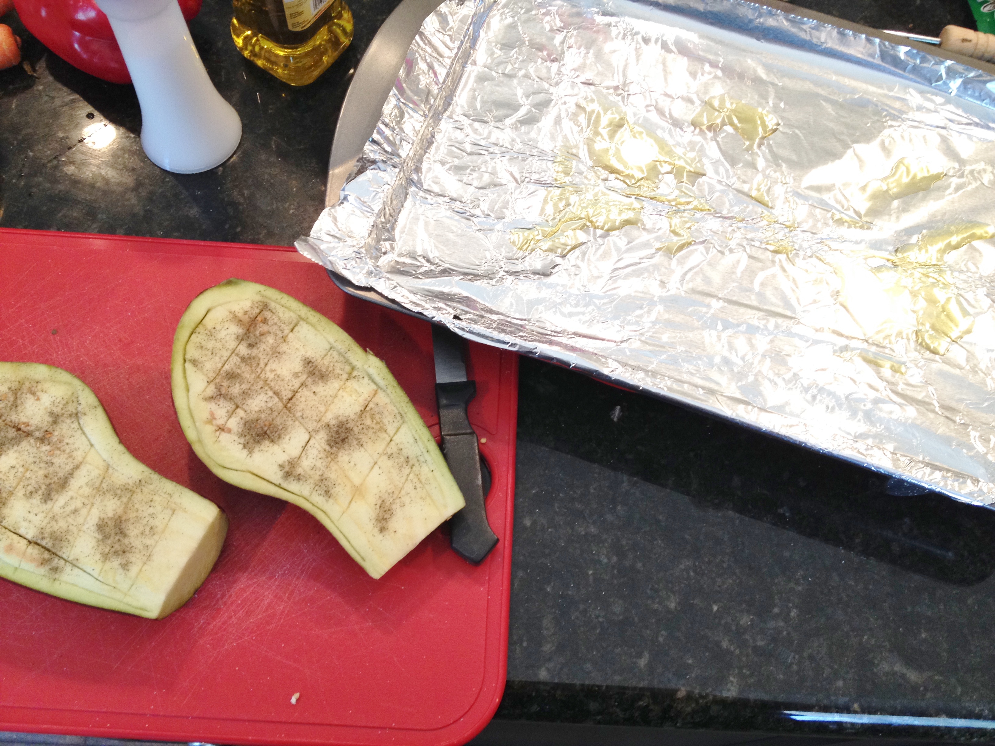 2. Wash eggplant then slice in half longways. Sprinkle olive oil on baking sheet. Score the eggplant down the sides about halfway down and across the top in a crisscross pattern. Sprinkle with salt and pepper. Roast 30-35 minutes.