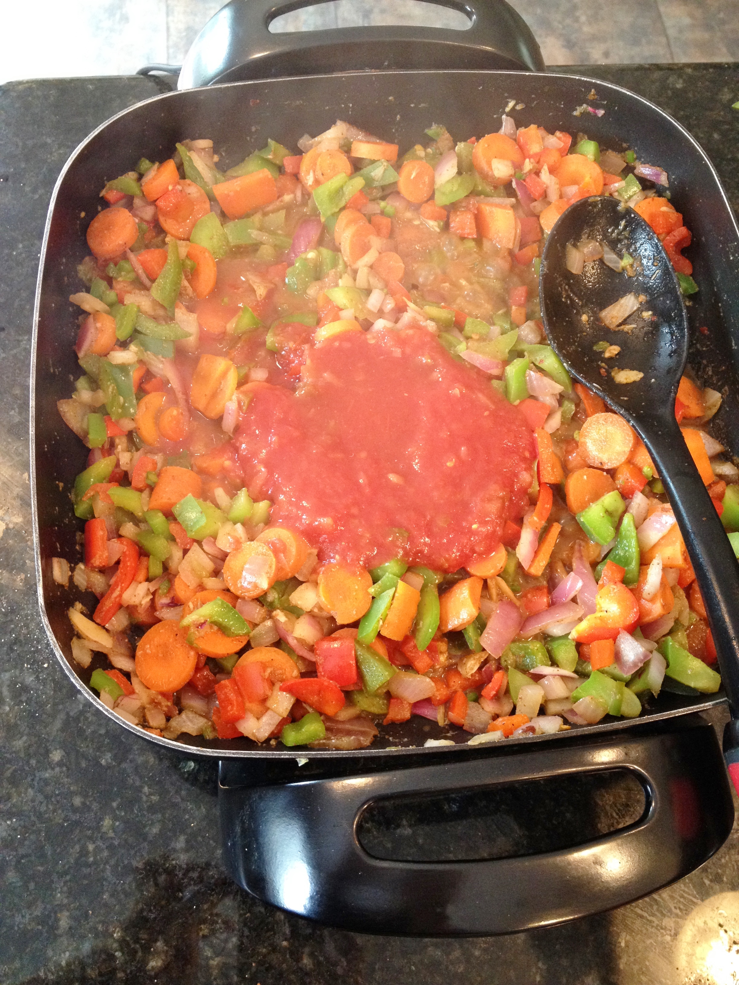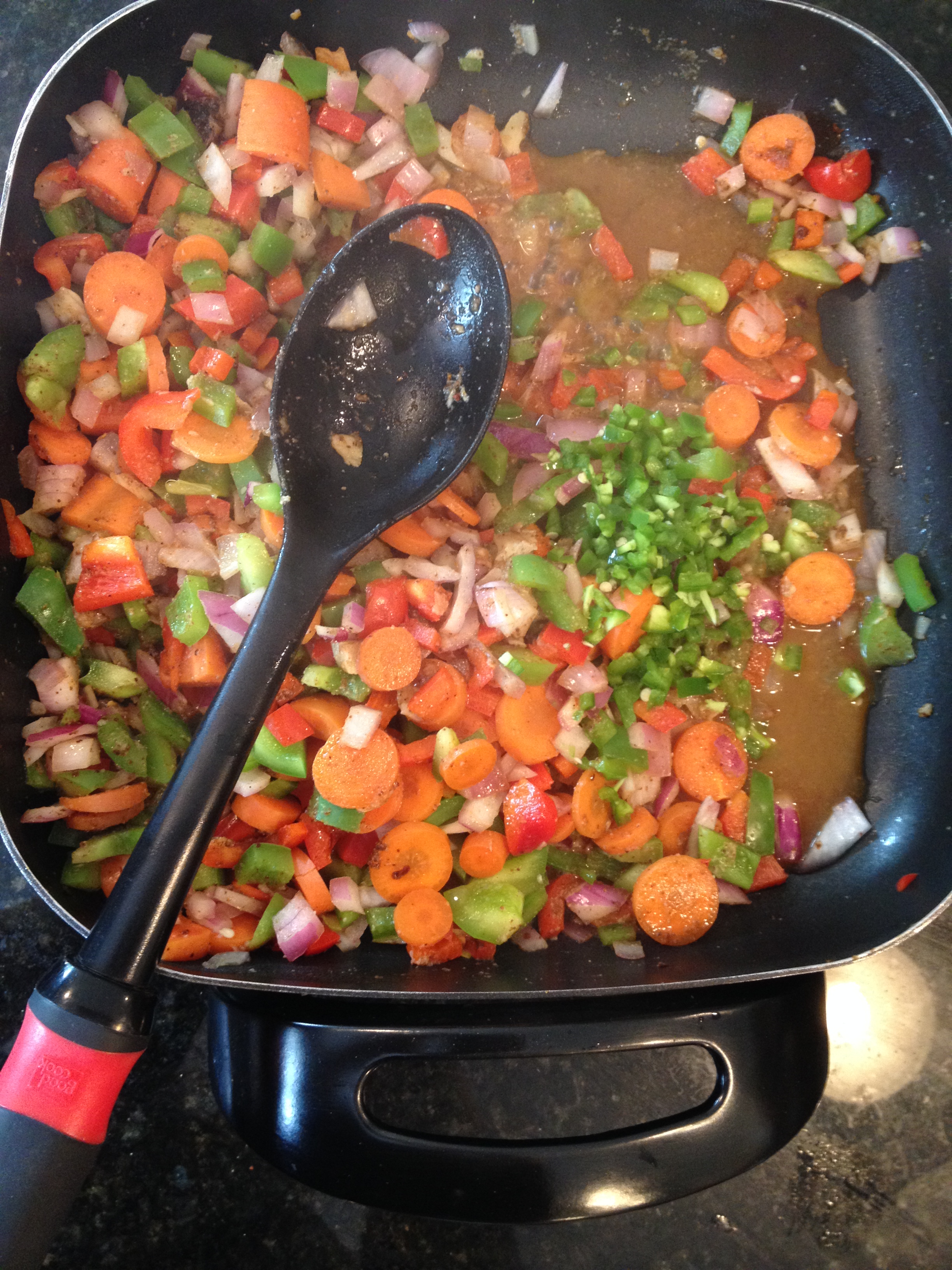2. Chop onion, peppers, and carrots and add to skillet with a little olive oil.