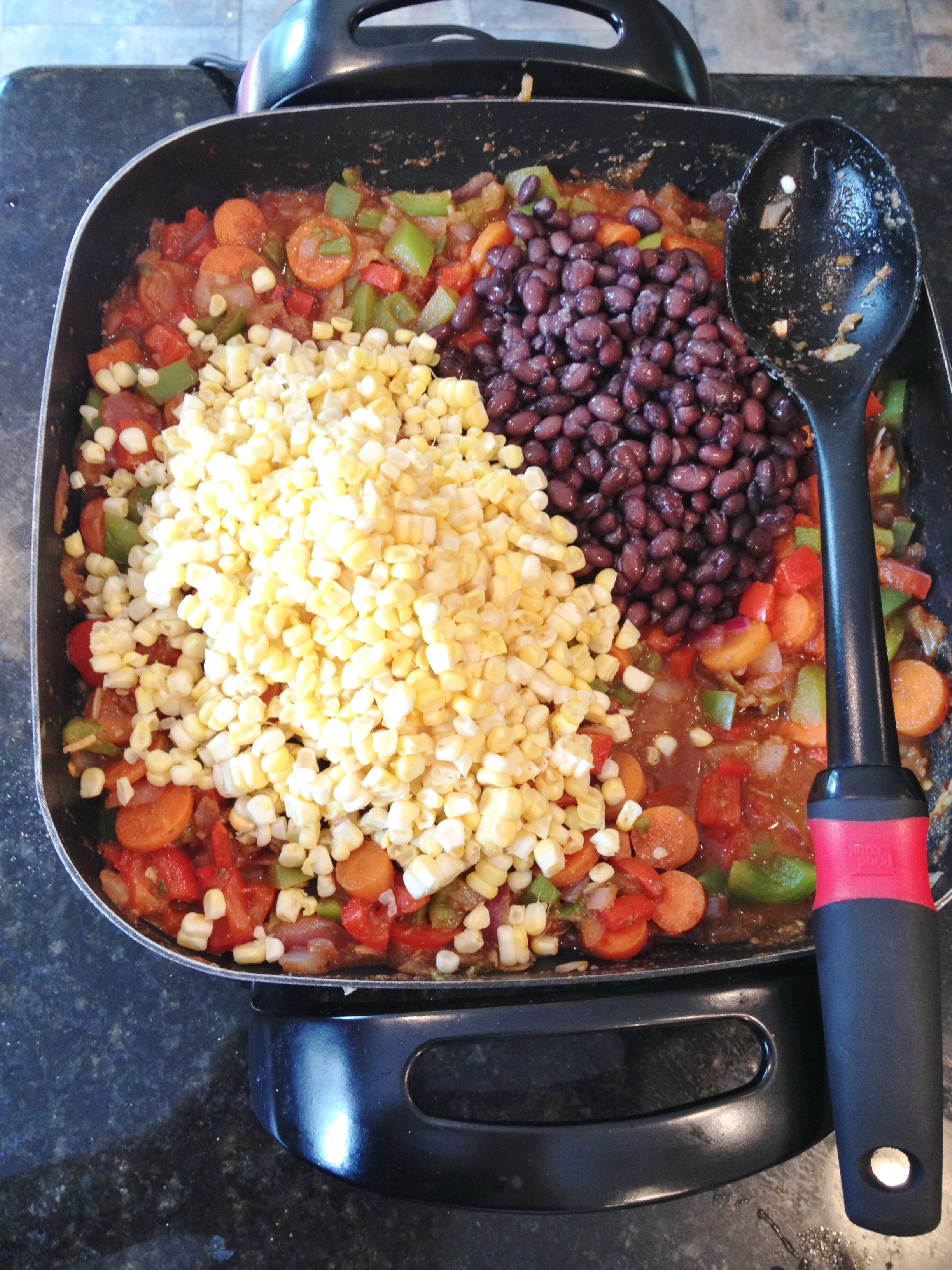 5. Once veggies are just softened add black beans and corn. Mix then let cook through.