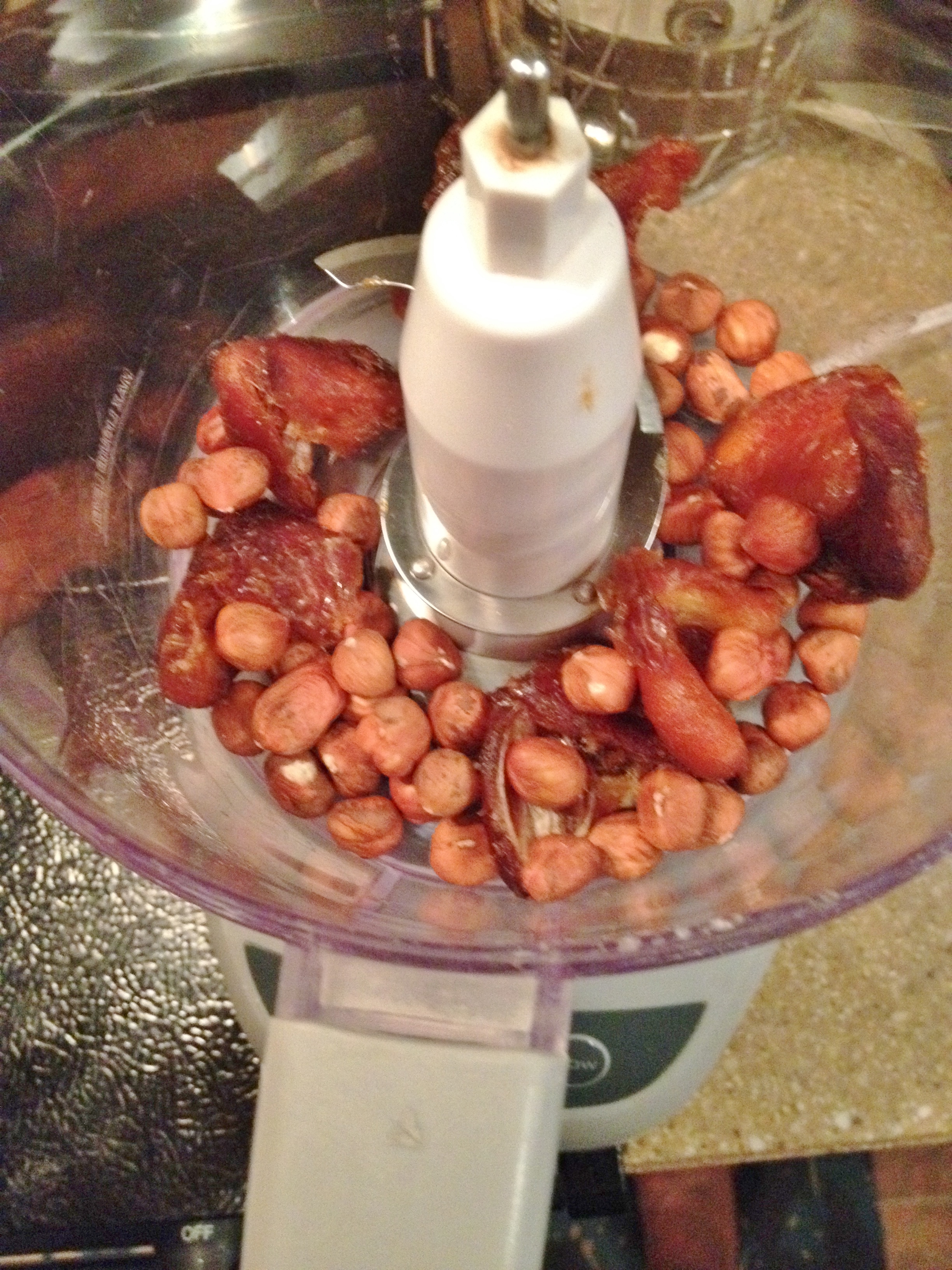 3. Add dates and hazelnuts to food processor and pulse until crumbly.