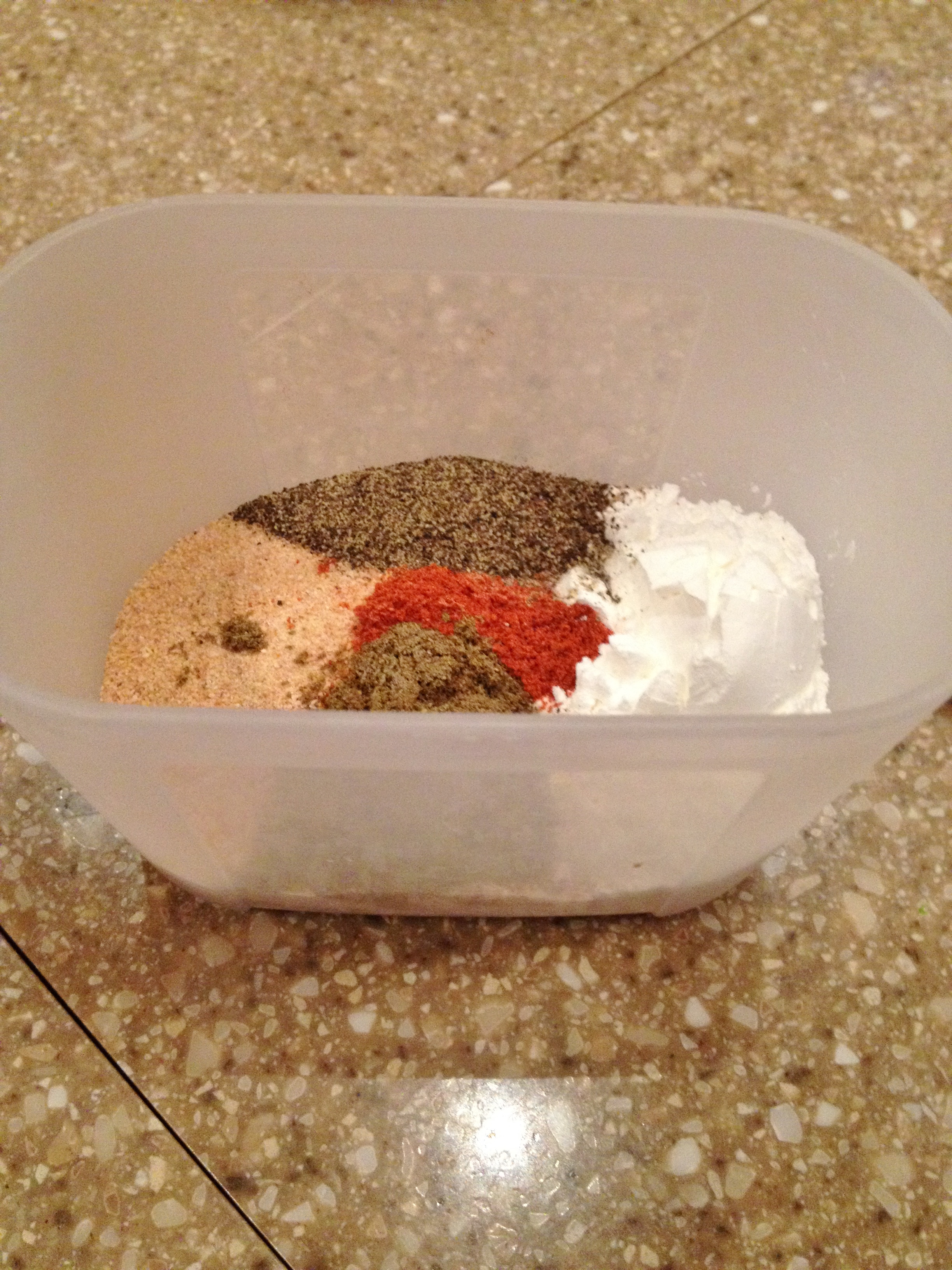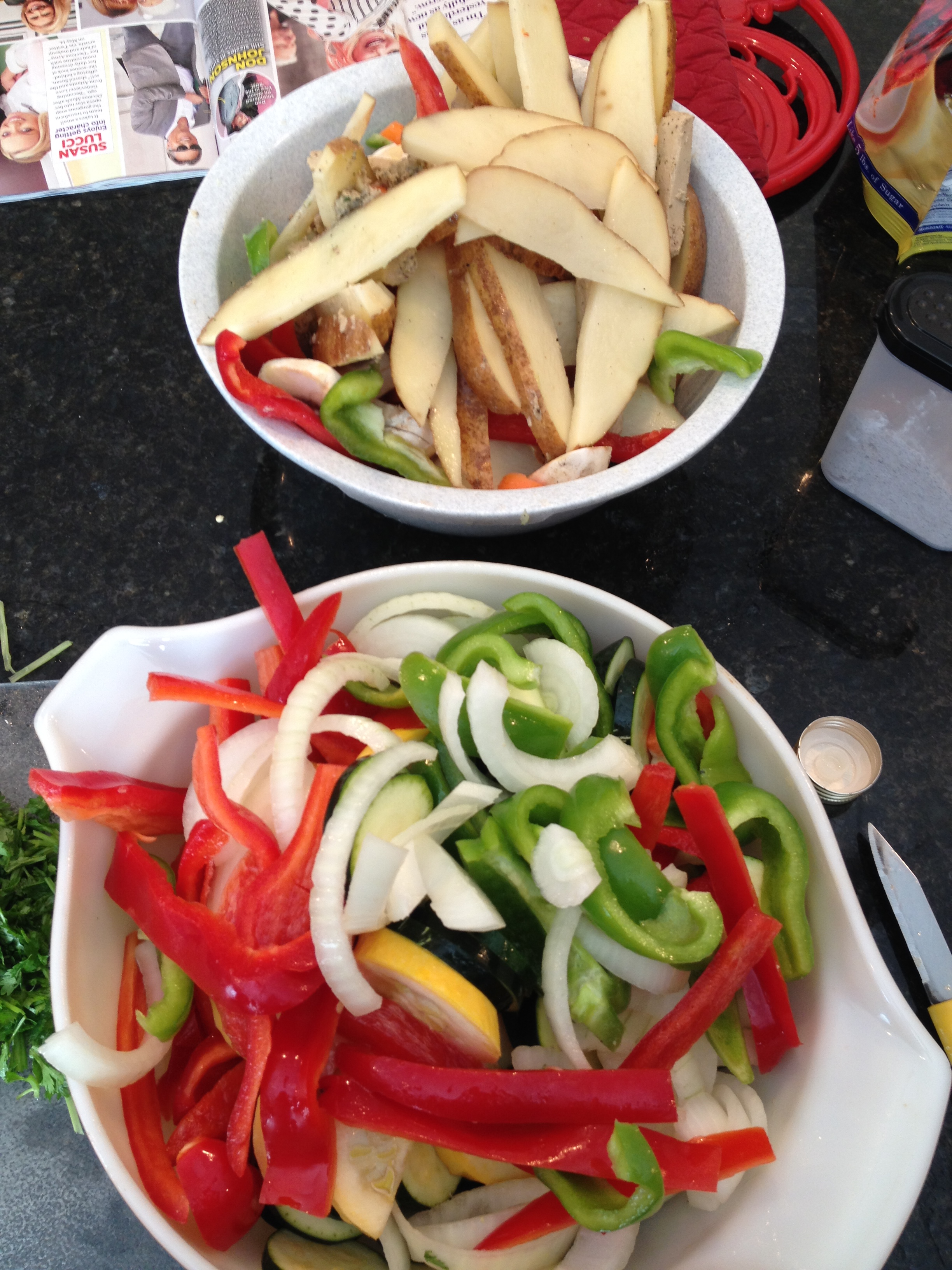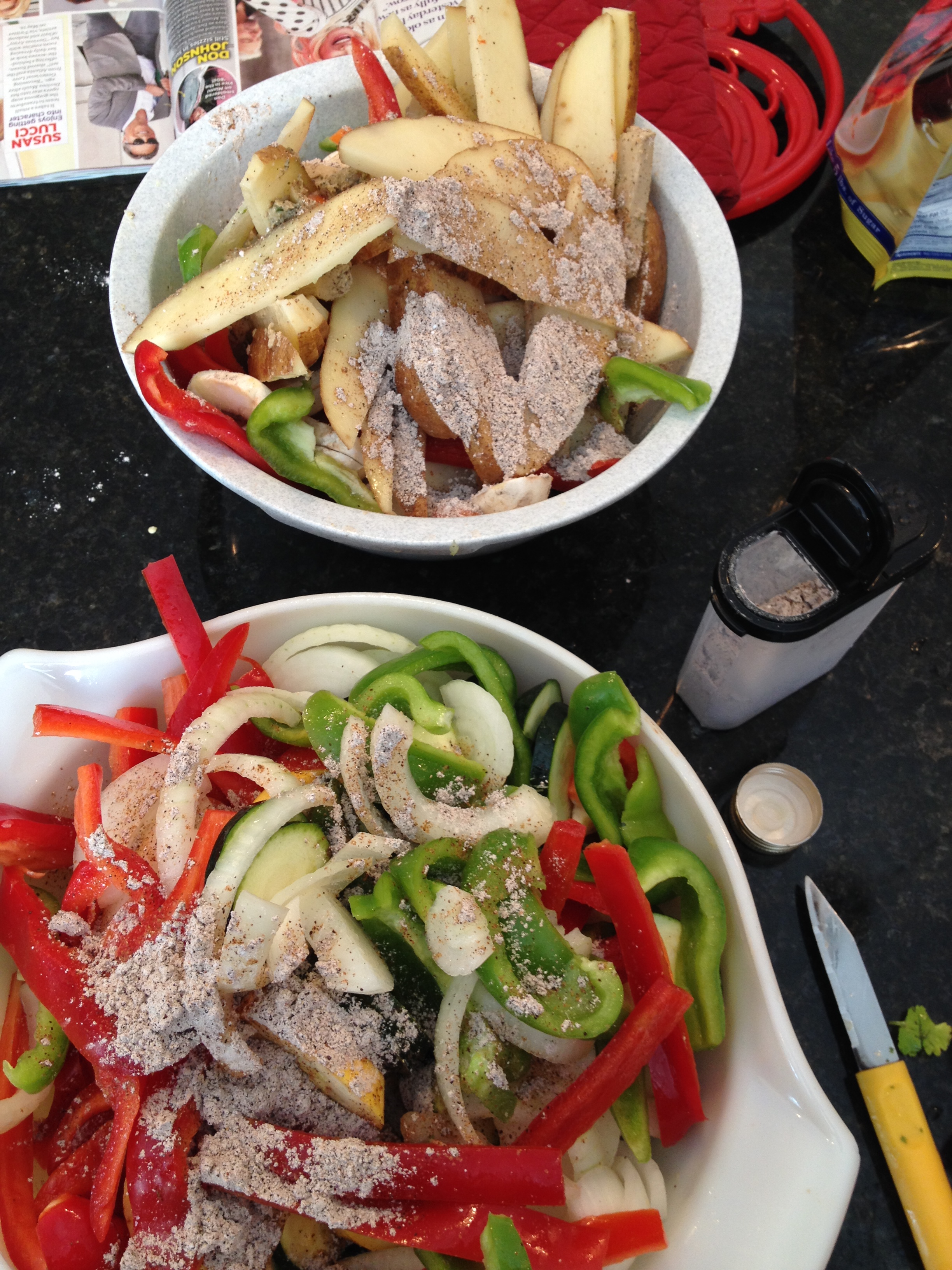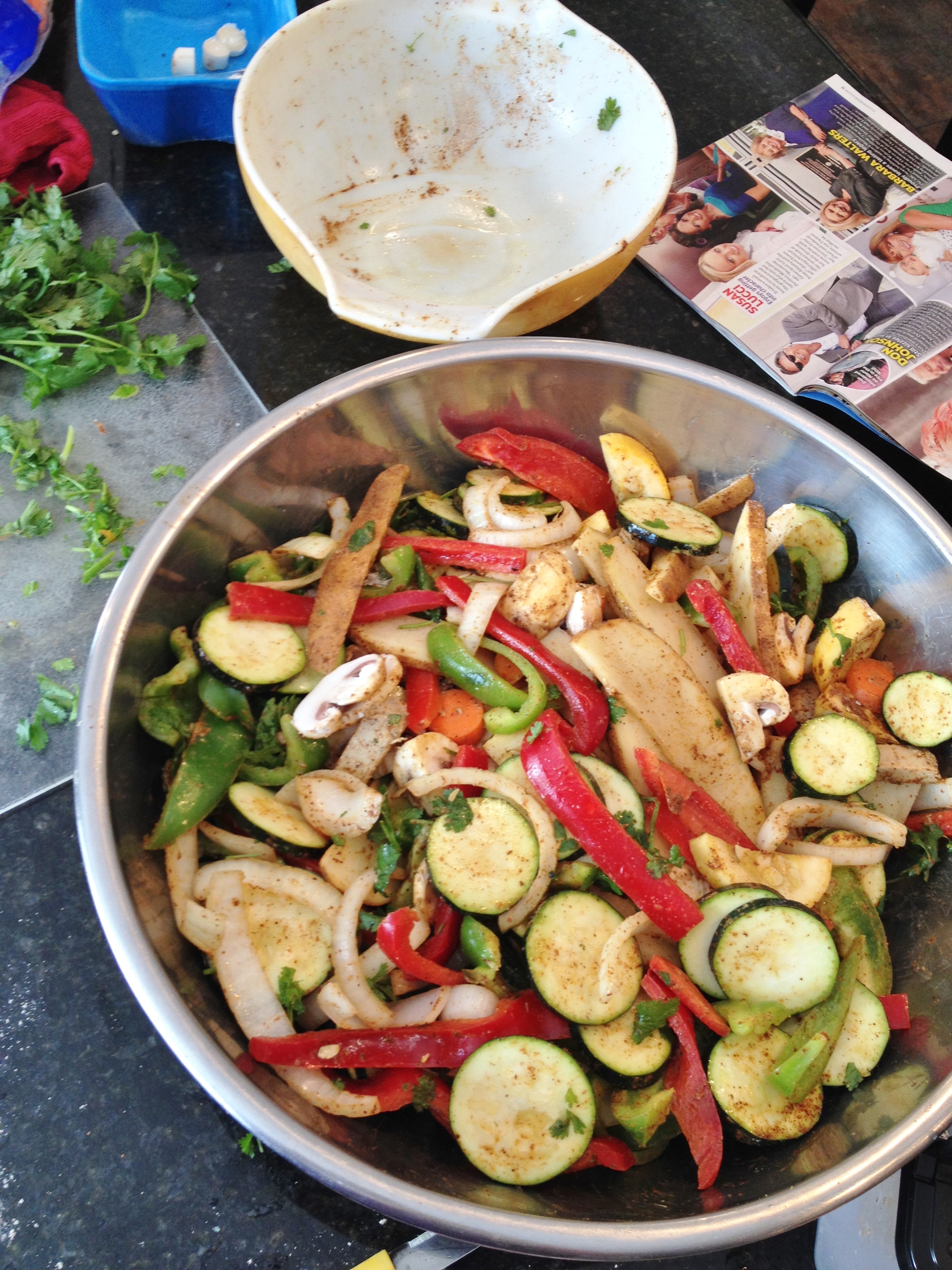 Chop all the veggies, carefully, using a knife or madolin. This turned into more veggies than I thought (like normal) so my one bowl turned into two then turned into one humungo bow holding all the vegl. Pour oil and squeeze limes over veg and mix with hands then dump on your homemade fajita seasoning and let sit about an hour. Start up the bar-b-que and get two long pieces of foil and fold long sides together for one long-wide piece. Lay carefully over bbq grates then spray with Pam – which we learned after the first batch was necessary. Also pouring more oil over the veg after you get it spread out is needed.