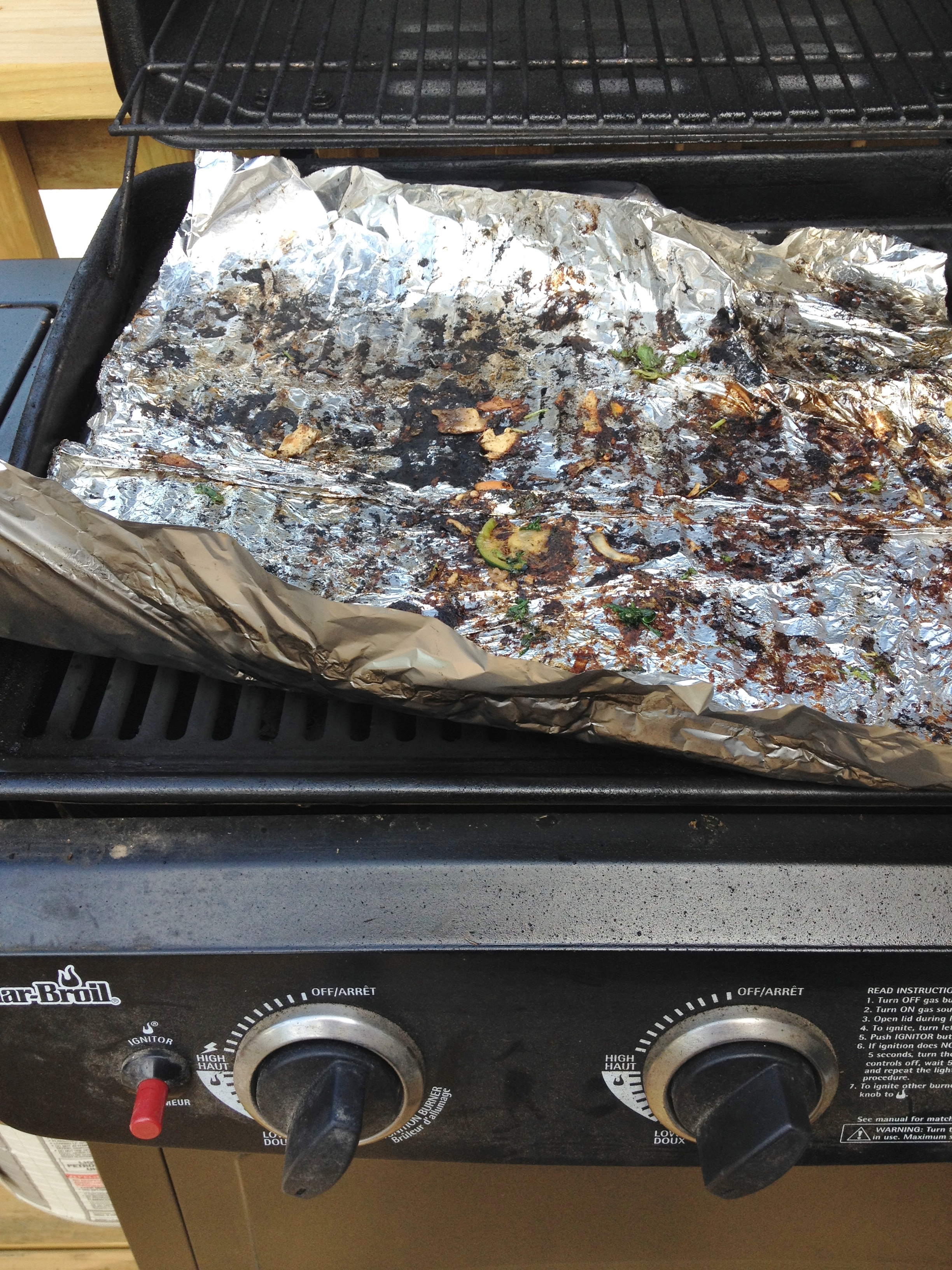 7. Heat up BBQ. Place long sheets of foil over grates.