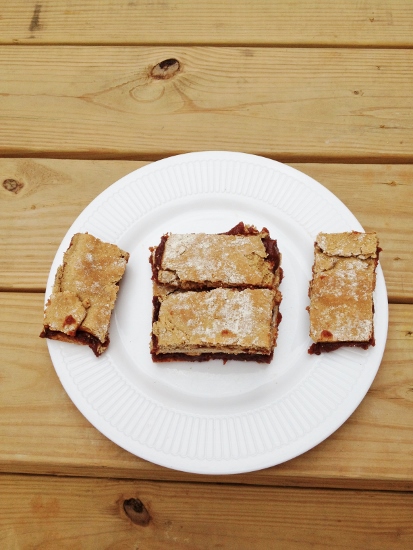 After an hour heat oven to 350 degrees and take out your baking dish and parchment paper. Tear a piece big enough to leave extra over the top. Take your dough out of fridge and cut in half after taking off the plastic wrap; sprinkle more flour and get your rolling pin. Be sure to sprinkle flour over top of dough and on pin. Spread thinnish, then cut into fourths. Use a knife to get the dough off counter then lay on bottom of parchment covered dish. Continue then press all dough together. In a small bowl pour the butter and 2 tbsp Splenda to sweeten the butter up a little – it will still be tart and yummy. Spread the butter over the dough then roll out the second half of dough then cut and lay on butter. Gently press the dough, but just laying it on top is fine. As you can see from mine the ends won’t melt down into each other, but it doesn’t deter from the awesome cookie, just not as pretty as the newton.