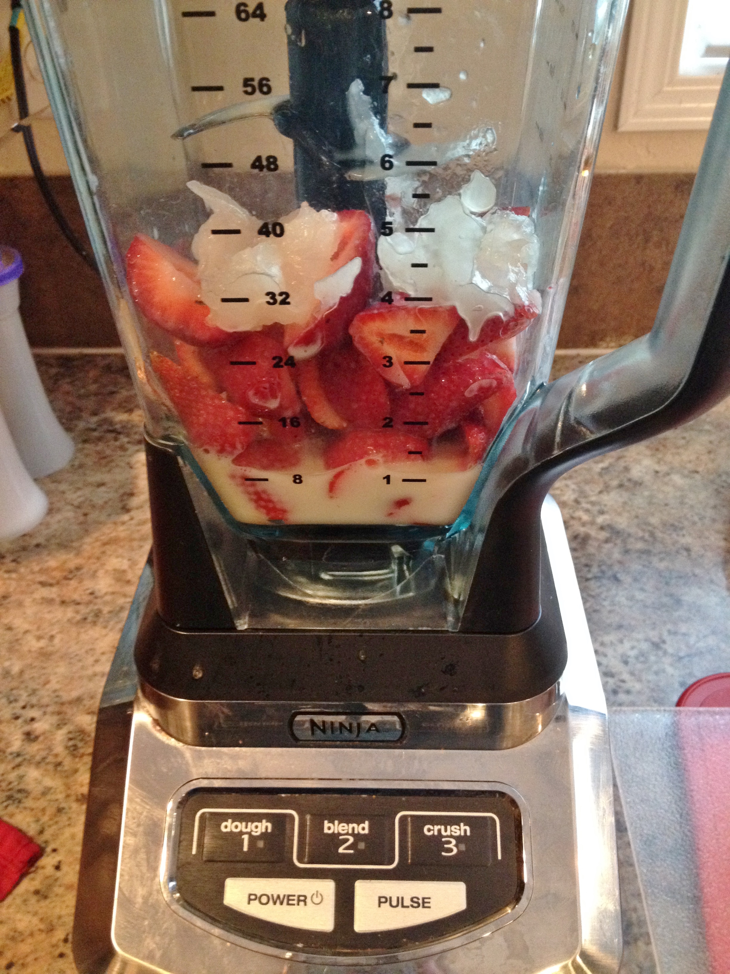 2. Cut tops of berries then dump in blender along with Splenda, cinnamon, vanilla, milk, oil. Blend until smooth.