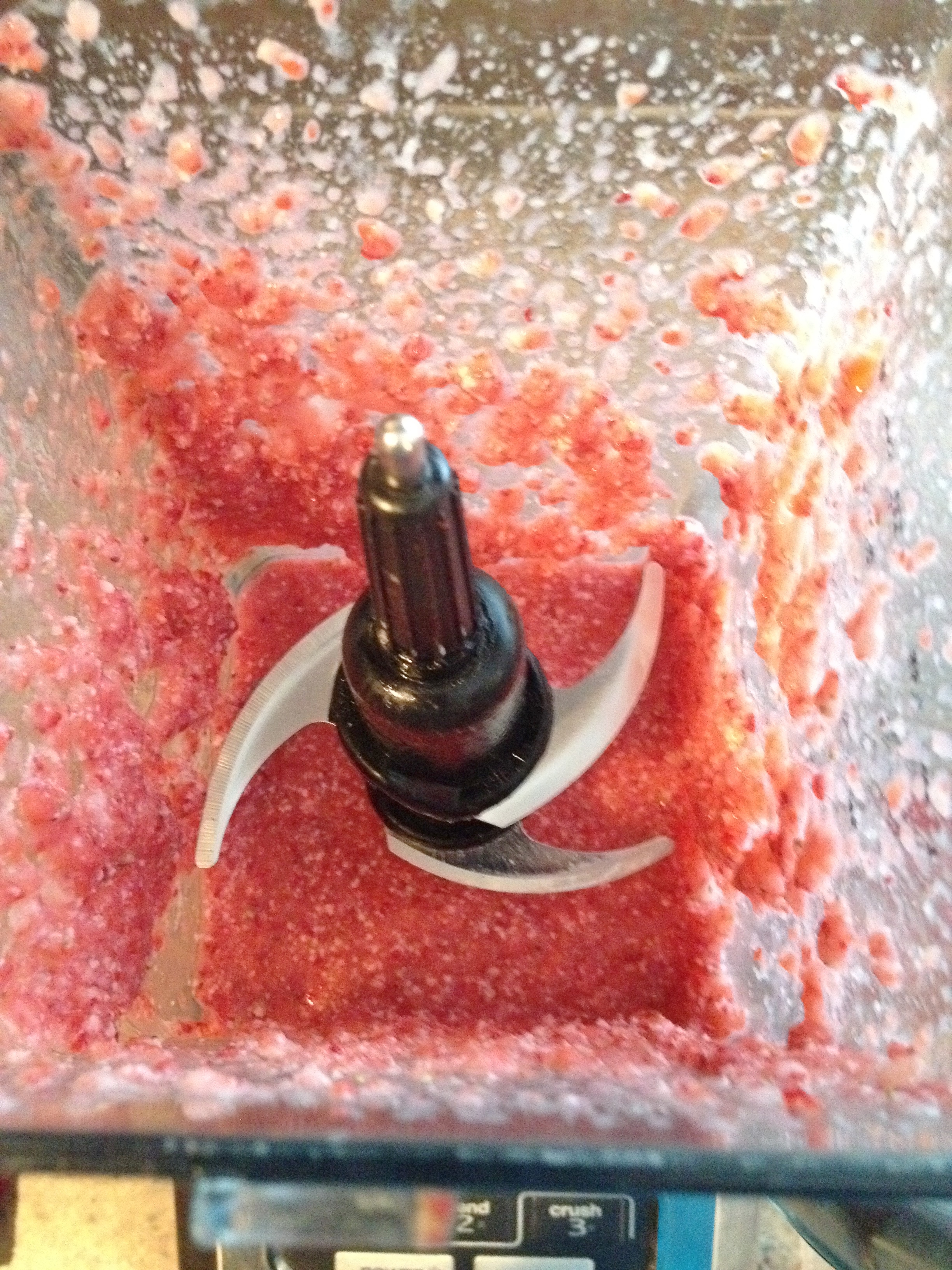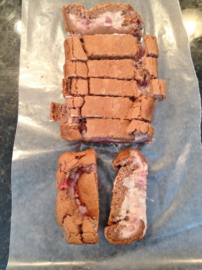 The best part about this recipe was blending it all in a blender! Just wash and chop the tops off 3/4 of the pint of strawberries and toss into the blender along with the Splenda, cinnamon, vanilla, vanilla soy milk, and coconut oil. Blend until creamyish – the oil will leave a little residue on the sides. Just scrape down then pour in one cup flour with the baking soda and powder. Blend again then add the rest of the flour. Blend until smooth. Pour half into a parchment lined bread pan. In a small bowl add the cream cheese, Splenda and vanilla and mix. Add chopped strawberries and fold in. Pour the cream cheese mixture over the batter and smooth down. Add the rest of the batter and smooth again. Bake at 370 degrees for 45 minutes. Let cool completely before pulling out of pan, then let stand for another hour before cutting. Cut carefully because of the collapse, and the creamy cheese will want to fall out the sides. If not all eaten immediately it will need to be refrigerated. Enjoy!