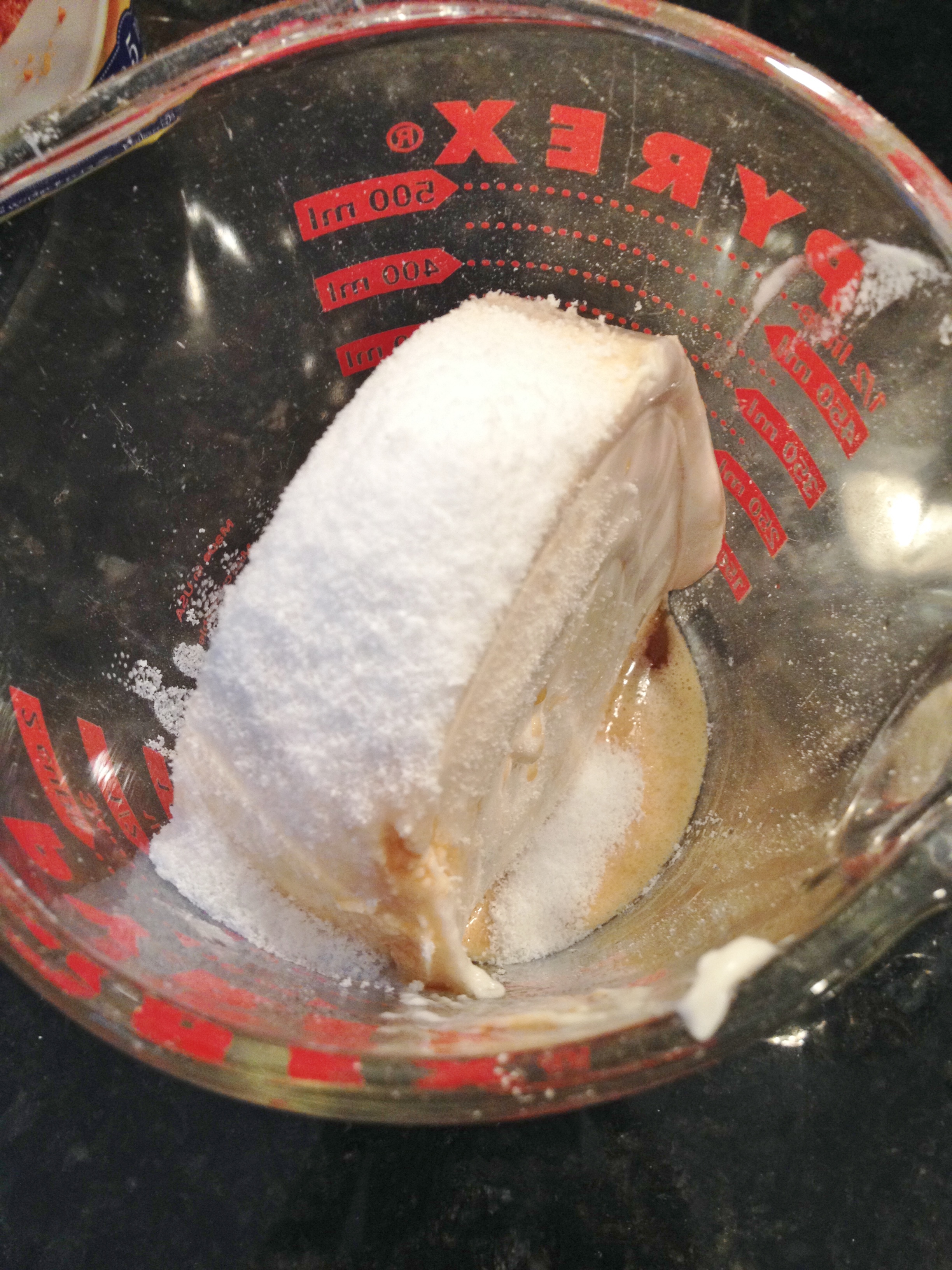 6. Pour cream cheese mixture over bread batter.