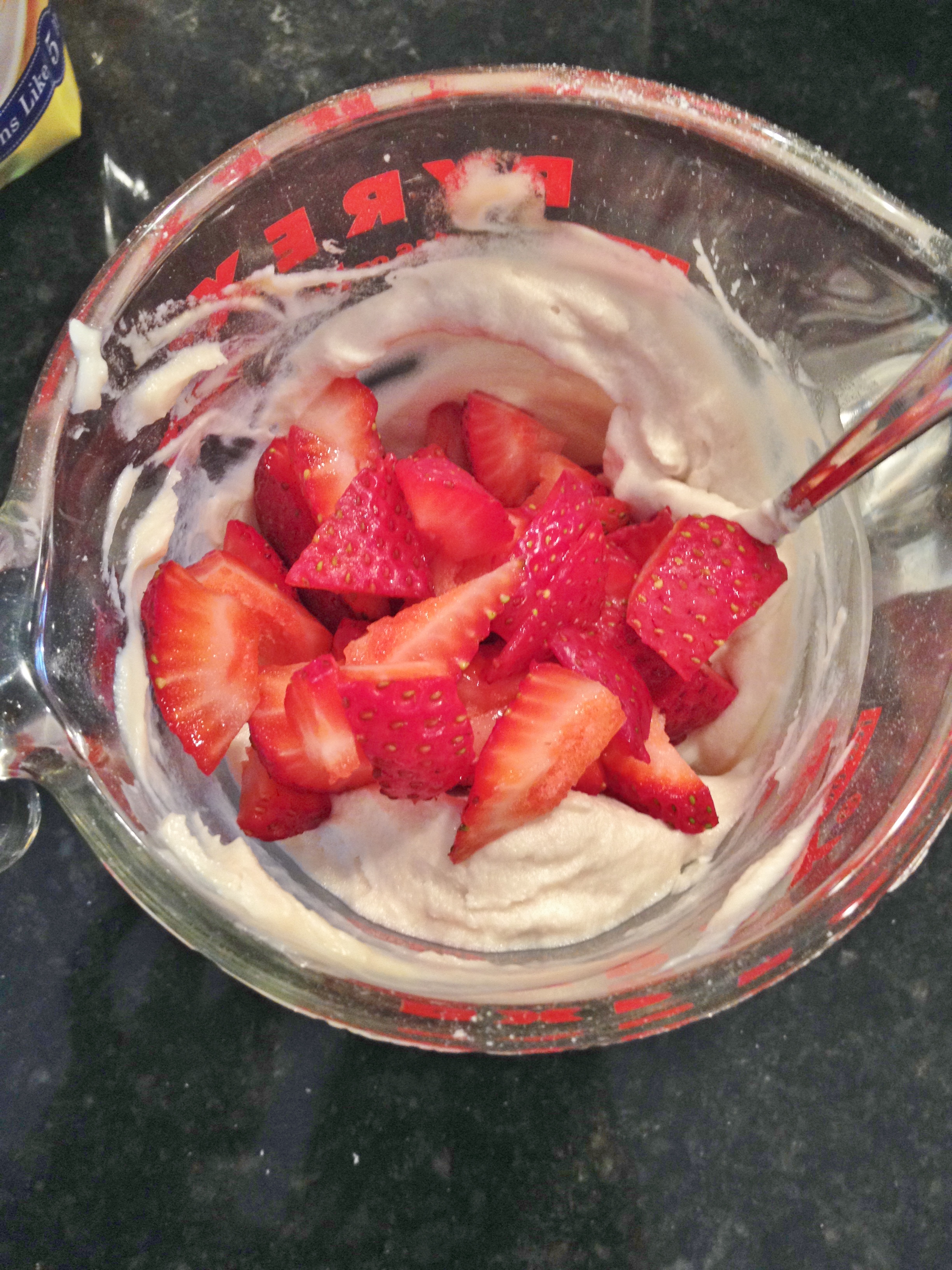 5. In a small bowl add cream cheese, Splenda and vanilla. Mix well then fold in chopped strawberries.
