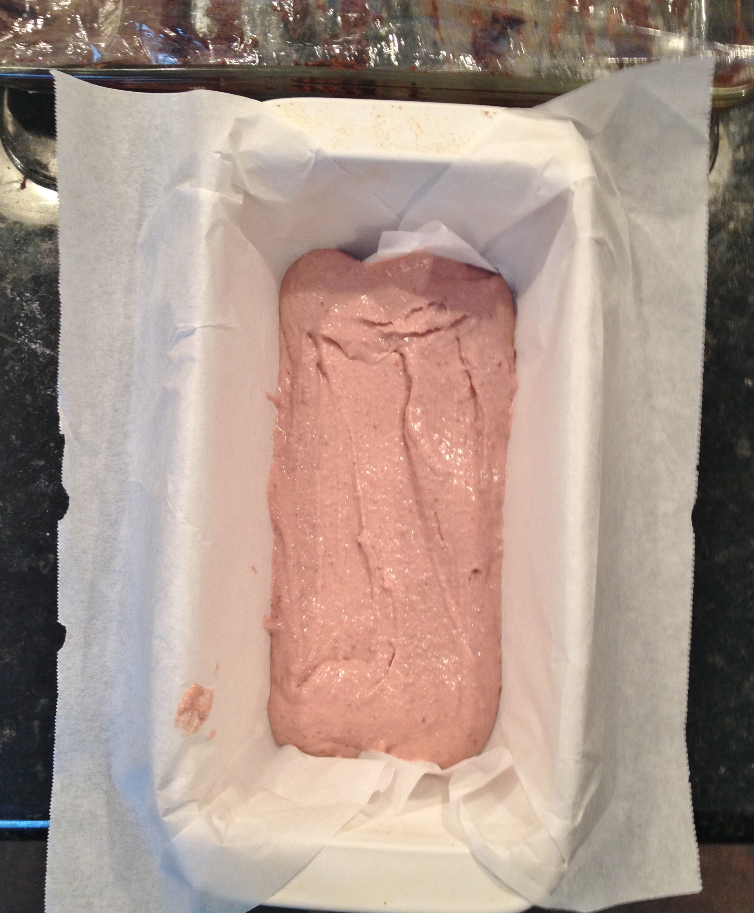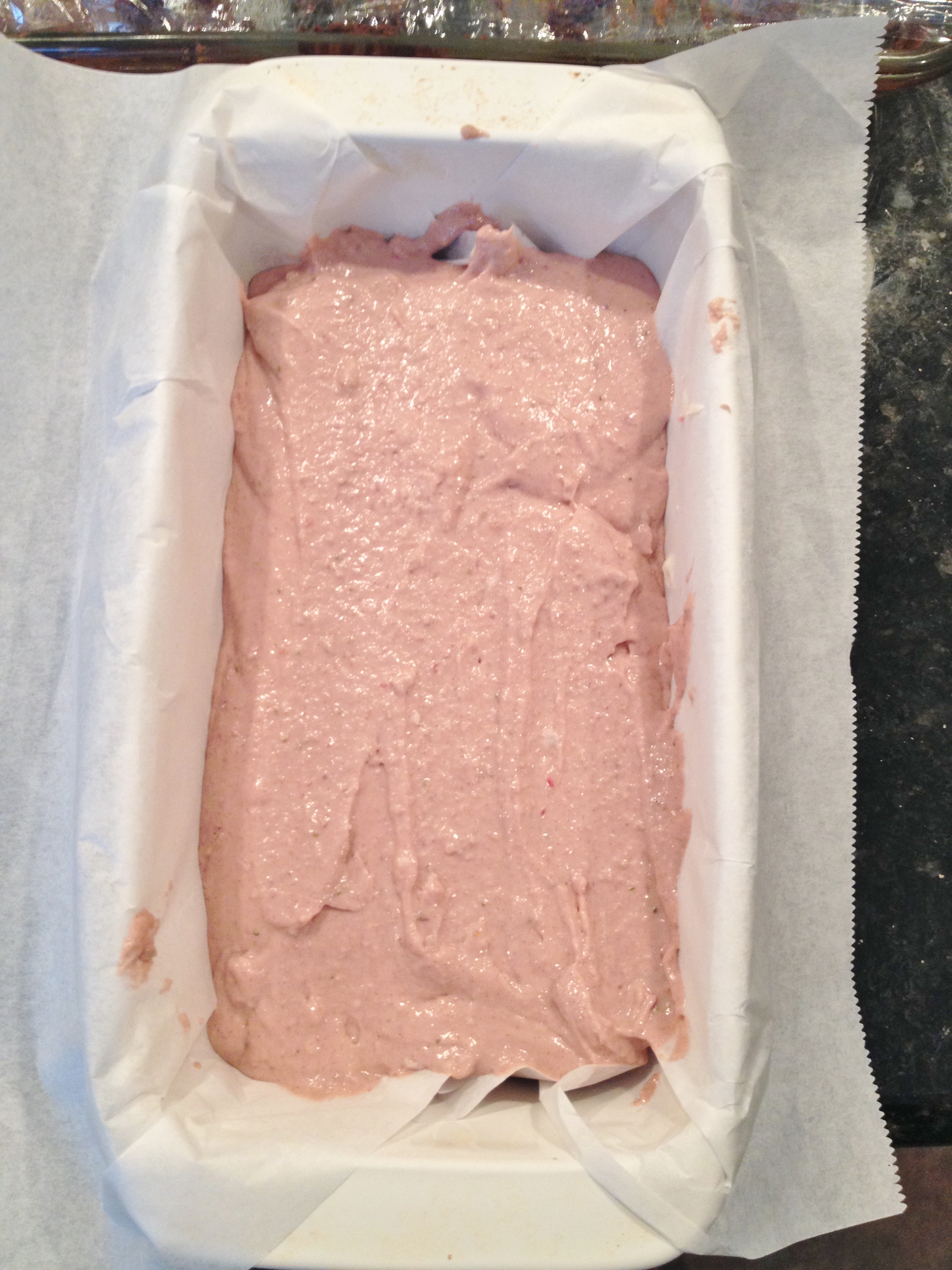4. Line a bread pan with parchment paper and pour in half the batter. Spread evenly.