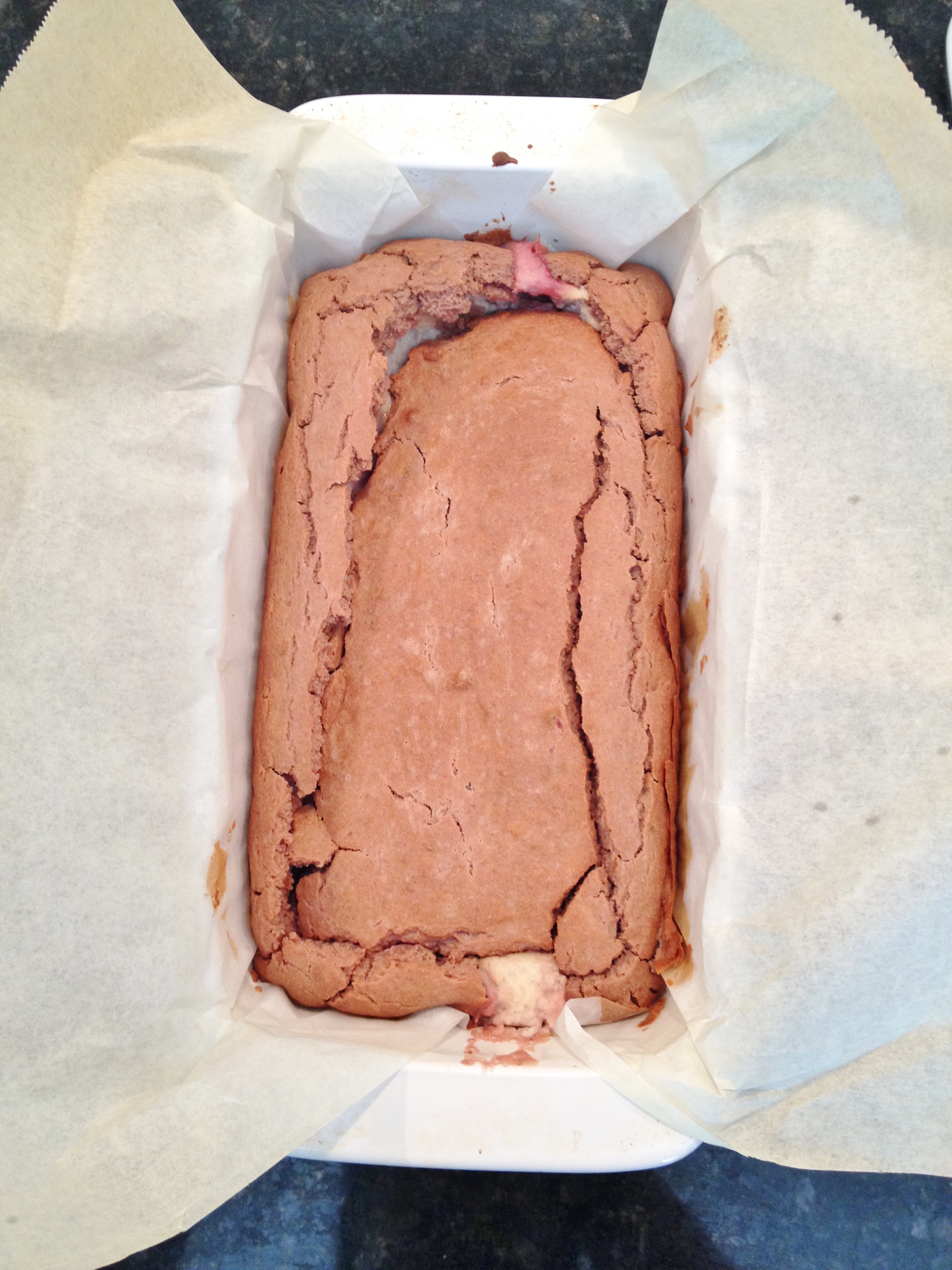 So this bread was inspired by the strawberries in my fridge and the unopened container of plain cream cheese that needed to be used. Do you ever by things just because you have coupons? And vegan or dairy-free coupons especially? That’s me, and why I had a container of unopened cream cheese sitting around – coupons! Love them. I decided to make the strawberry bread using a similar recipe to banana bread, but no bananas. I didn’t want any competing flavors with the gorgeous strawberries I had. And I also knew I didn’t want chunks of strawberries throughout either, because lets face it – I have no real food issues (concerning texture anyway) but almost everyone else does. So the only chunks of strawberries are in the cream cheese. And if you will notice from the pics – the cream cheese induced a collapse in the top of the bread. Now, you may think this makes the bread a fail – but I have come to learn when baking with cream cheese middles, that a collapse in the center is inevitable. I was fine with it and it was ooey, gooey good.