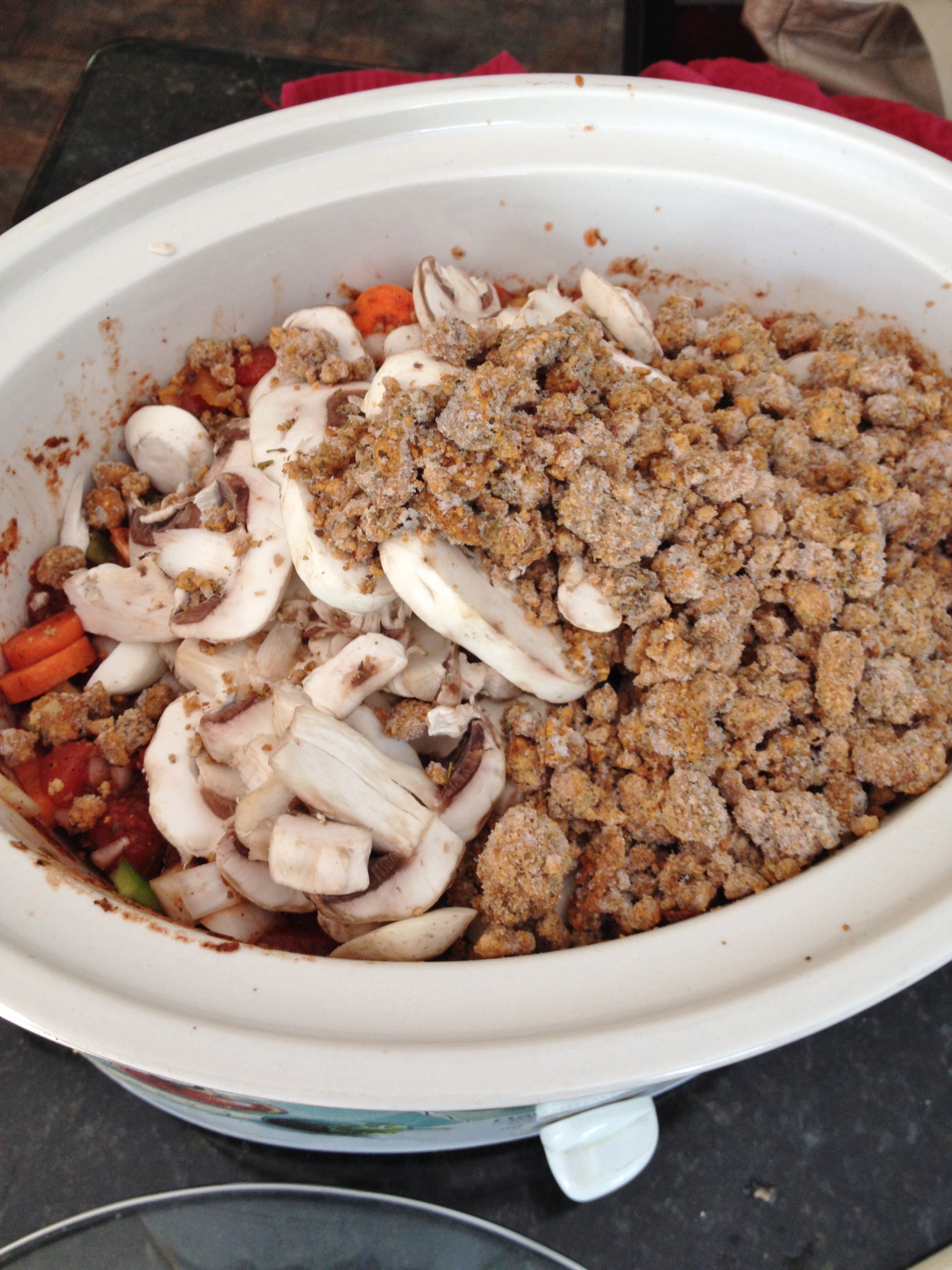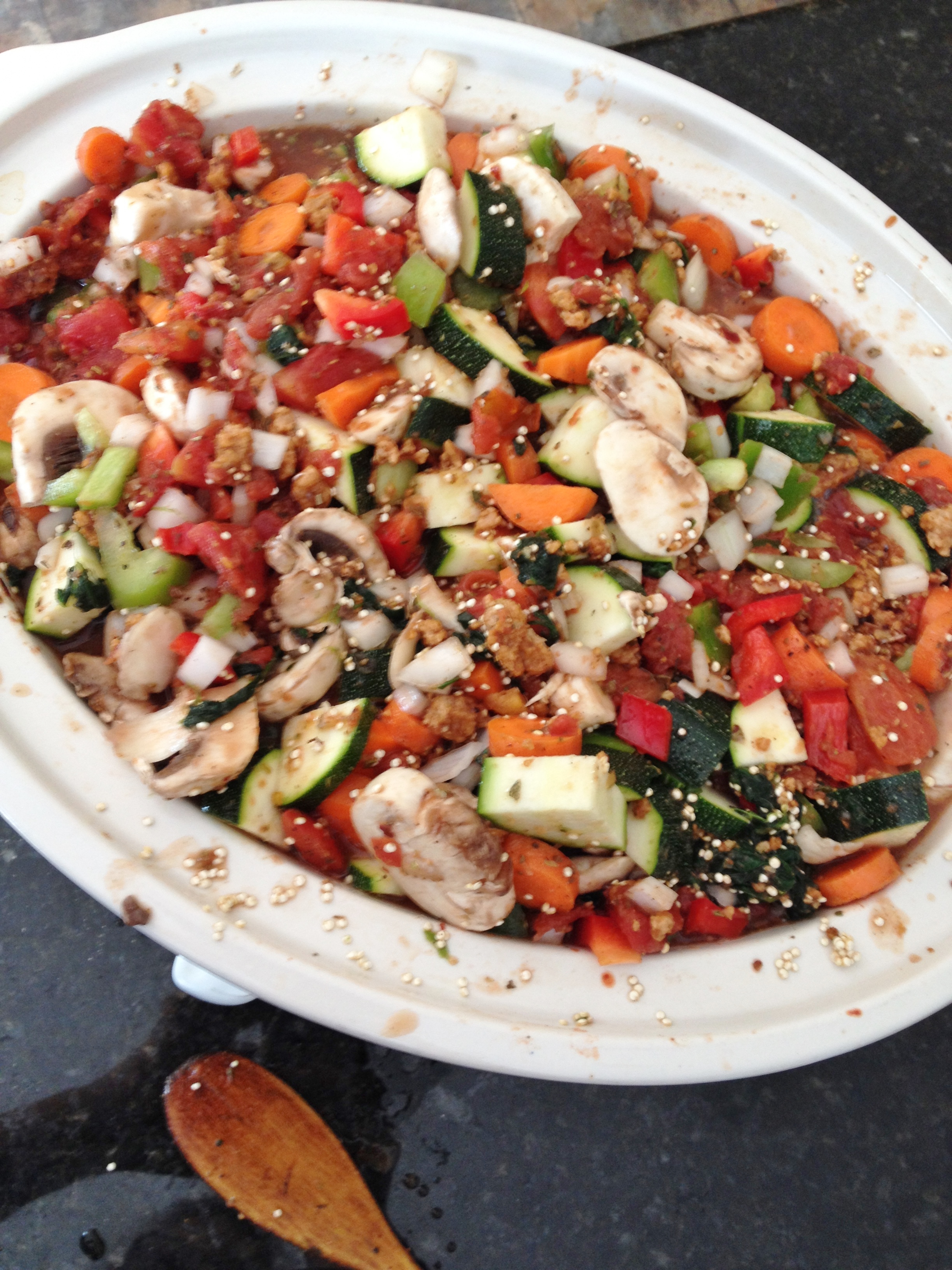 Plug in and turn the crockpot to high before getting everything together so it starts heating. Pour in the tomatoes and 1/2 the veg stock along with your seasonings, minced garlic and balsamic vinegar and stir. Put the lid on so it starts getting incorporated. Keep the lid on the pot while you slice up all the veggies. Slice veggies and dump in and mix as you finish each. Add the beefless crumbles, quinoa and defrosted spinach into the crockpot and mix it all up and put the lid back on and let it go. Stir occasionally until the soup is done. Yum!