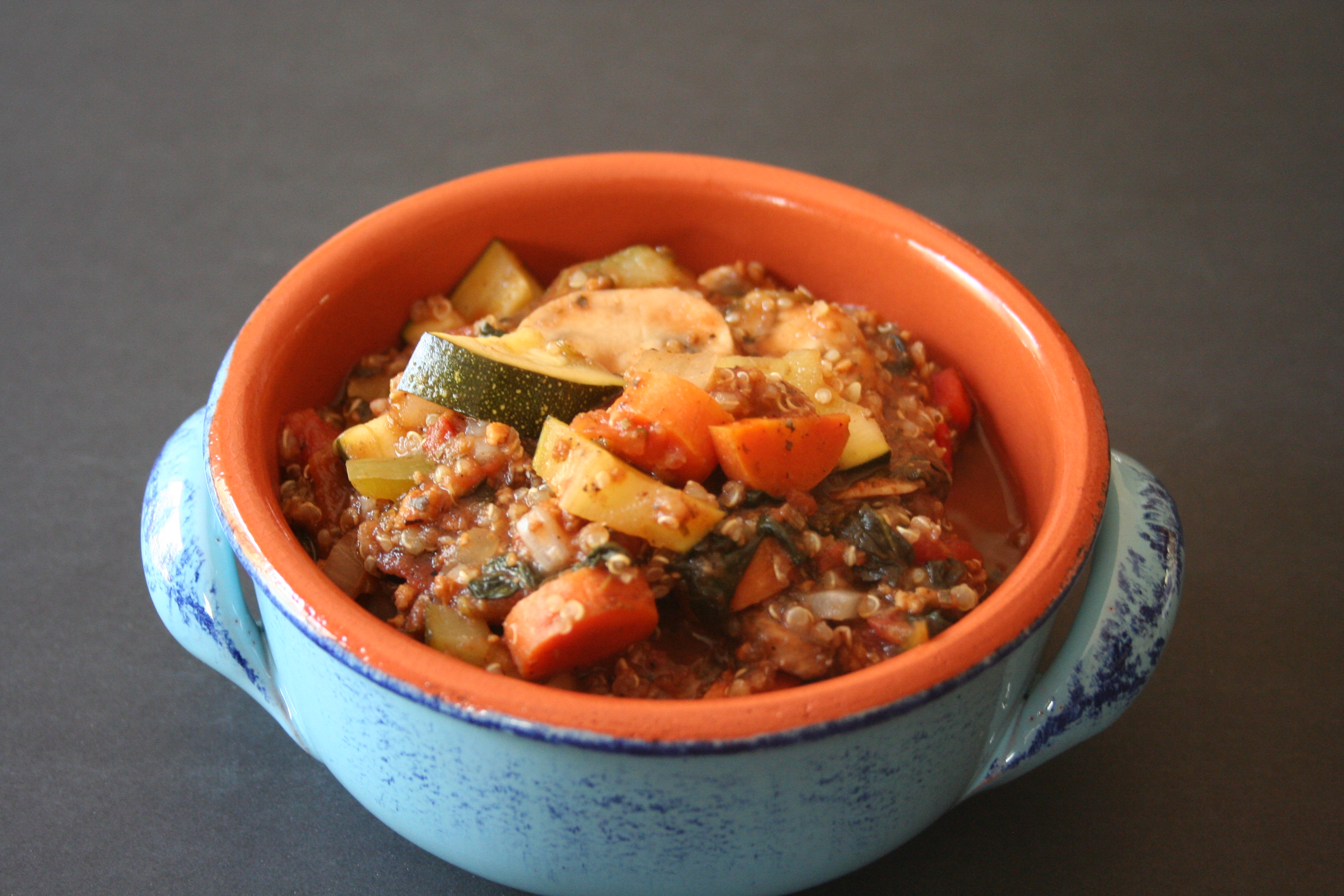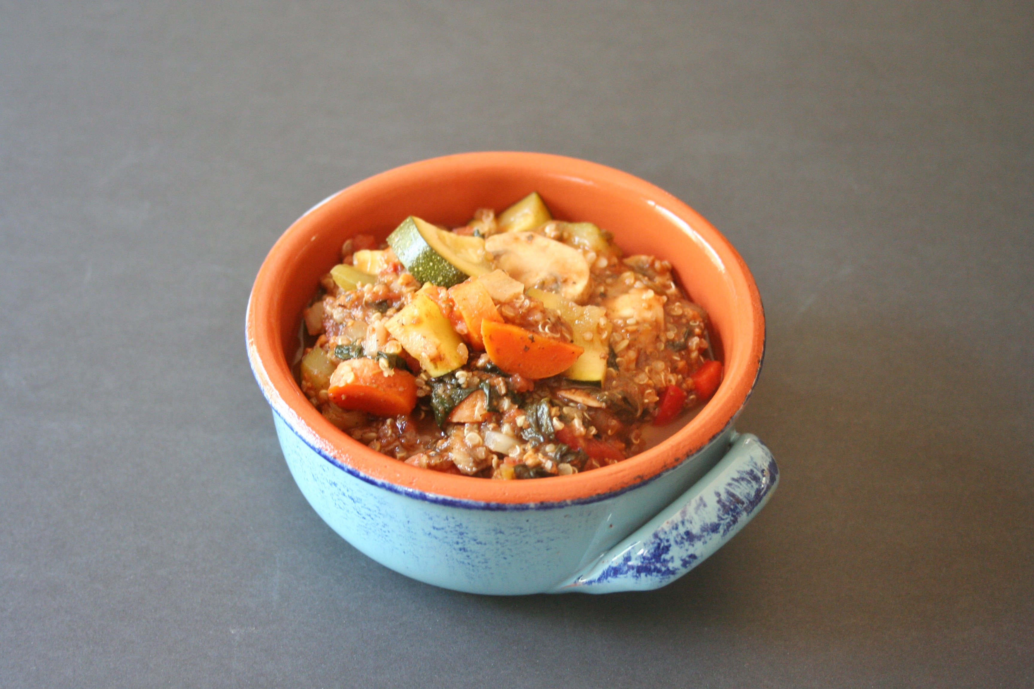 I love soups and stews no matter what time of year it is. Making them yourself ensures they are healthy, salt free, flavored right, no weird ingredients, and super-low in calories. That is the best part – low in calories. Low-cal means you can eat more and get stuffed on an awesome veg soup and not feel guilty. Which is what I feel when I overeat – grossed out and guilty. In comes an awesome stew. This stew is flavored like a lasagna – lots of Italian seasoning plus extra oregano and lots of veggies. Lasanga’s normally have tons of noodles and cheeses, but not this one. No cheese or noodles, I used quinoa instead to add a healthy bulk to it. The veggies are all things I would stick in a normal lasagna – onion, peppers, zucchini, carrots, and tons of mushrooms.