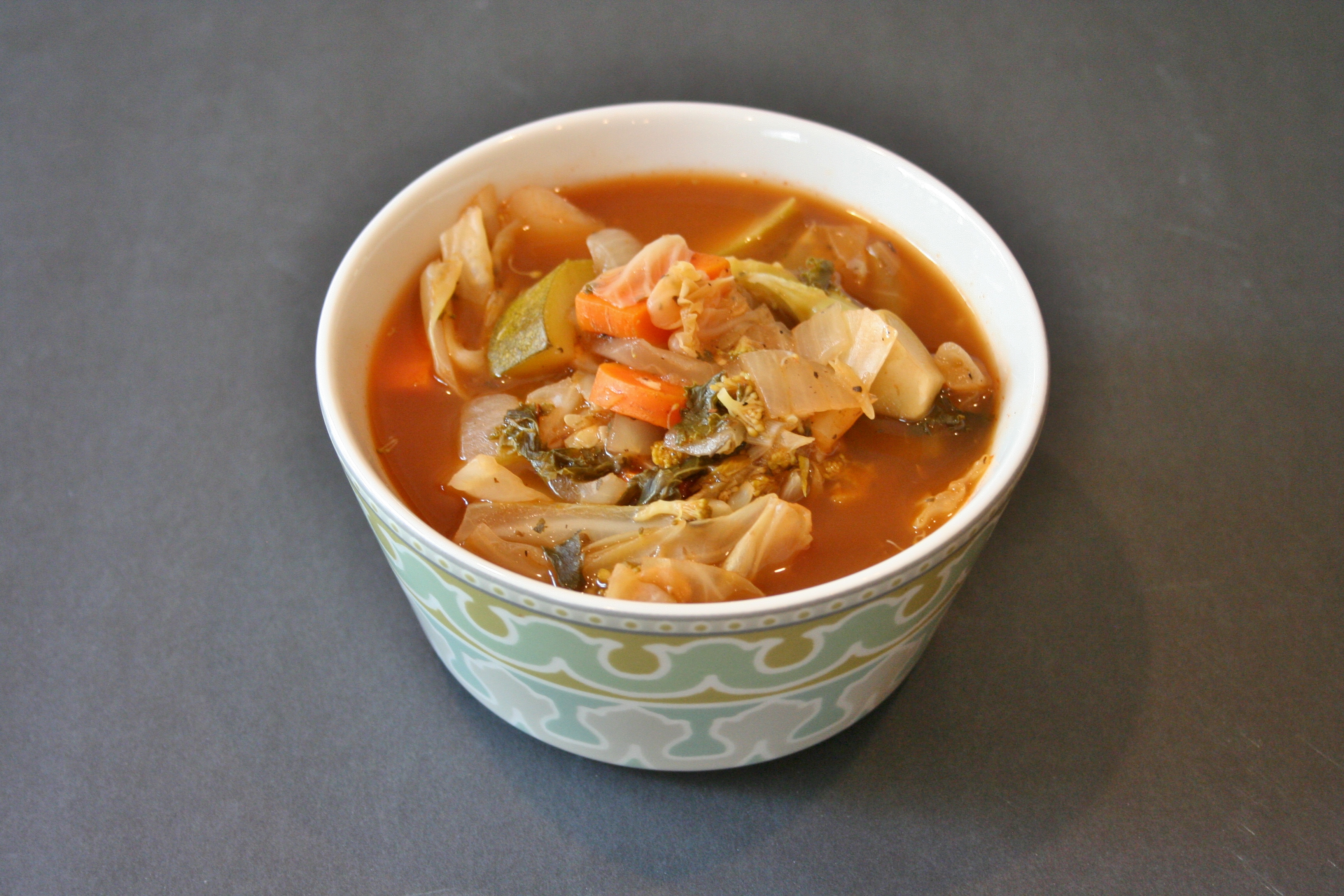 I started the pot off on high with the stock, tomatoes, balsamic (yum!), and spices and let it boil while I minced in the whole garlic bulb. I wanted the spices to wake up before all the veggies got in the pot. Then I just chopped everything and dropped them all in. The order doesn’t matter, but I did do the kale and cabbage last. As the veggies added up in the pot I added water (about 16 cups total). The entire cutting and cooking time was only about 2-2 1/4 hours. Not long at all for a huge soup. This makes a ton, so use what you can if you don’t have a mega-soup pot like I did. After portioning out the calories only equaled about 80 calories for a two-cup portion! Seriuosly! Enjoy!