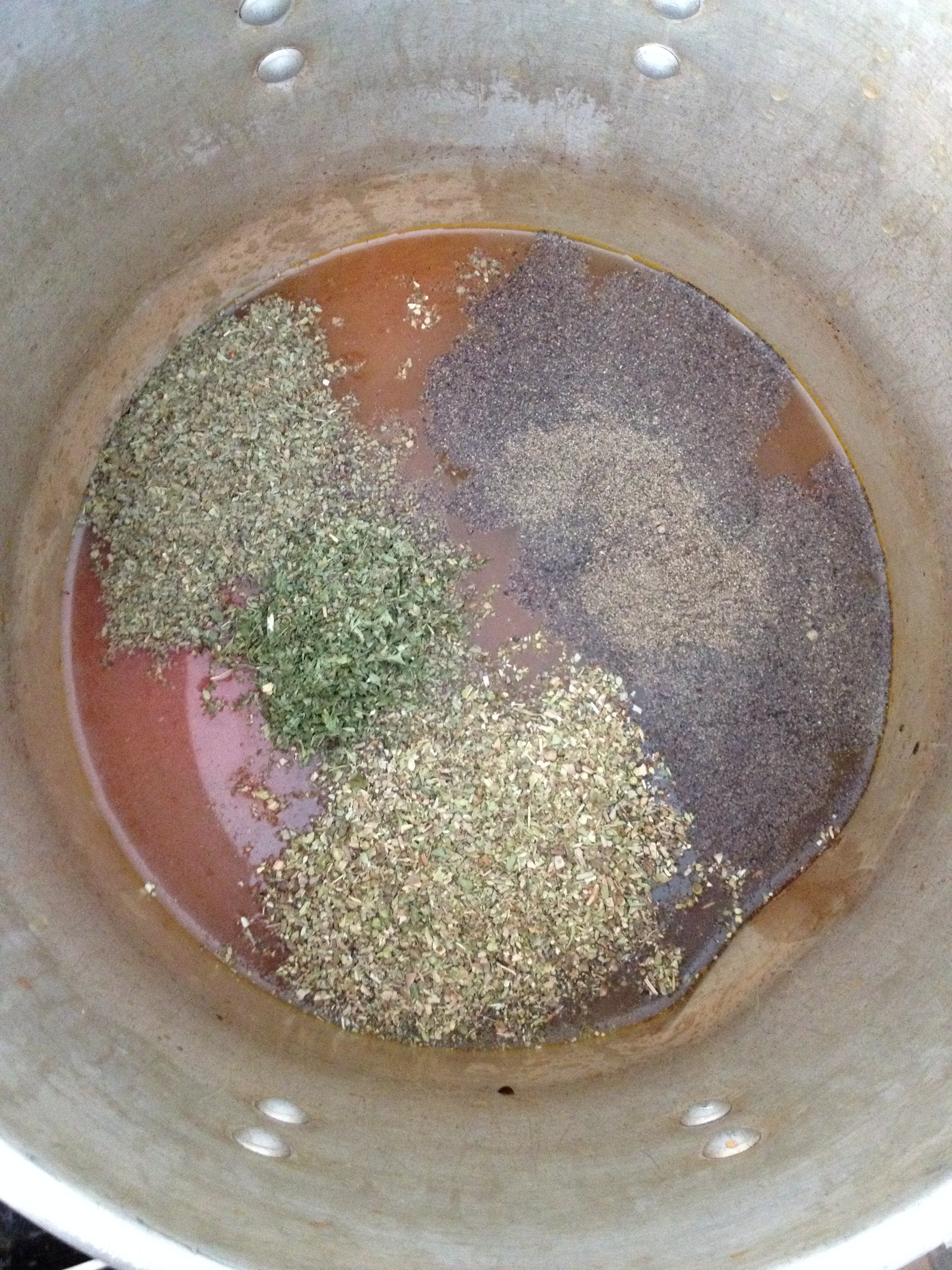 1. Dump the stock, tomato sauce, balsamic, and spices into the pot. Turn on high then mince in the garlic.